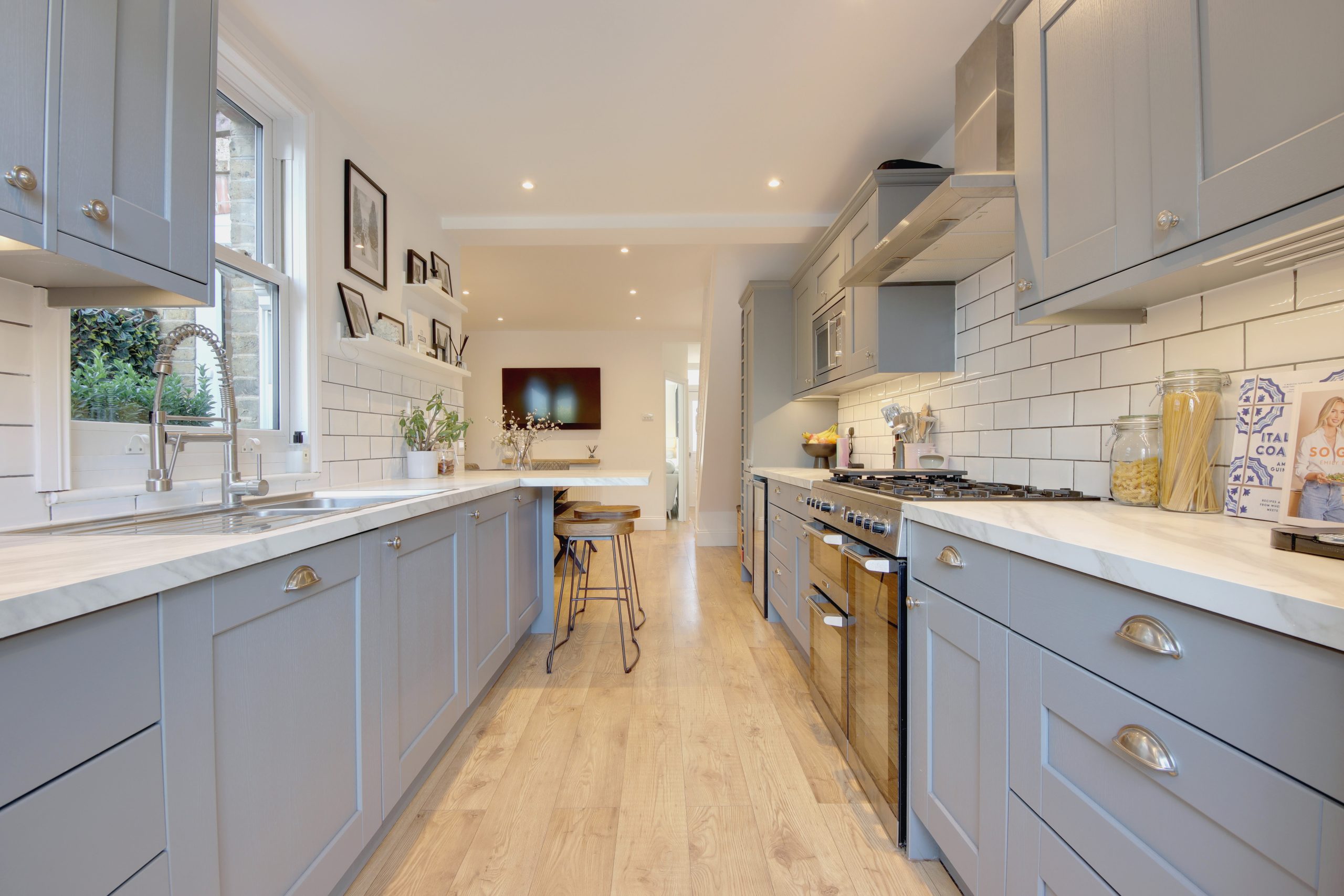 As you step inside, you're greeted by a bright and welcoming hallway, where engineered wood flooring immediately sets a refined tone. To the right, the spacious living room features a striking bay window dressed with crisp white blinds, inviting sunlight to pour in. Restored cornicing and built-in alcoves around the original fireplace add both character and function. The true heart of the home is the expansive 25’ x 13’ open-plan kitchen and dining area, perfect for both entertaining and everyday living. The kitchen stuns with grey cabinetry, brushed-silver hardware, and sleek marble-effect countertops, while the dining area offers a stylish backdrop with its statement feature wall. Natural light streams through French doors, which lead effortlessly to the beautifully maintained, easterly-facing garden.