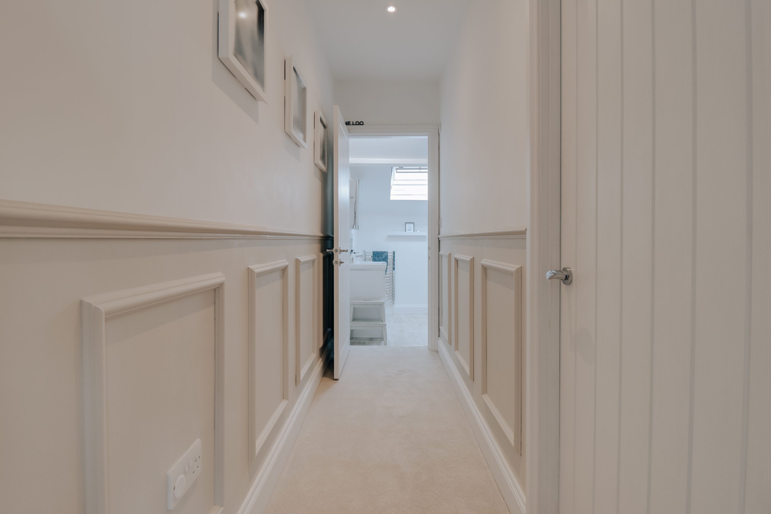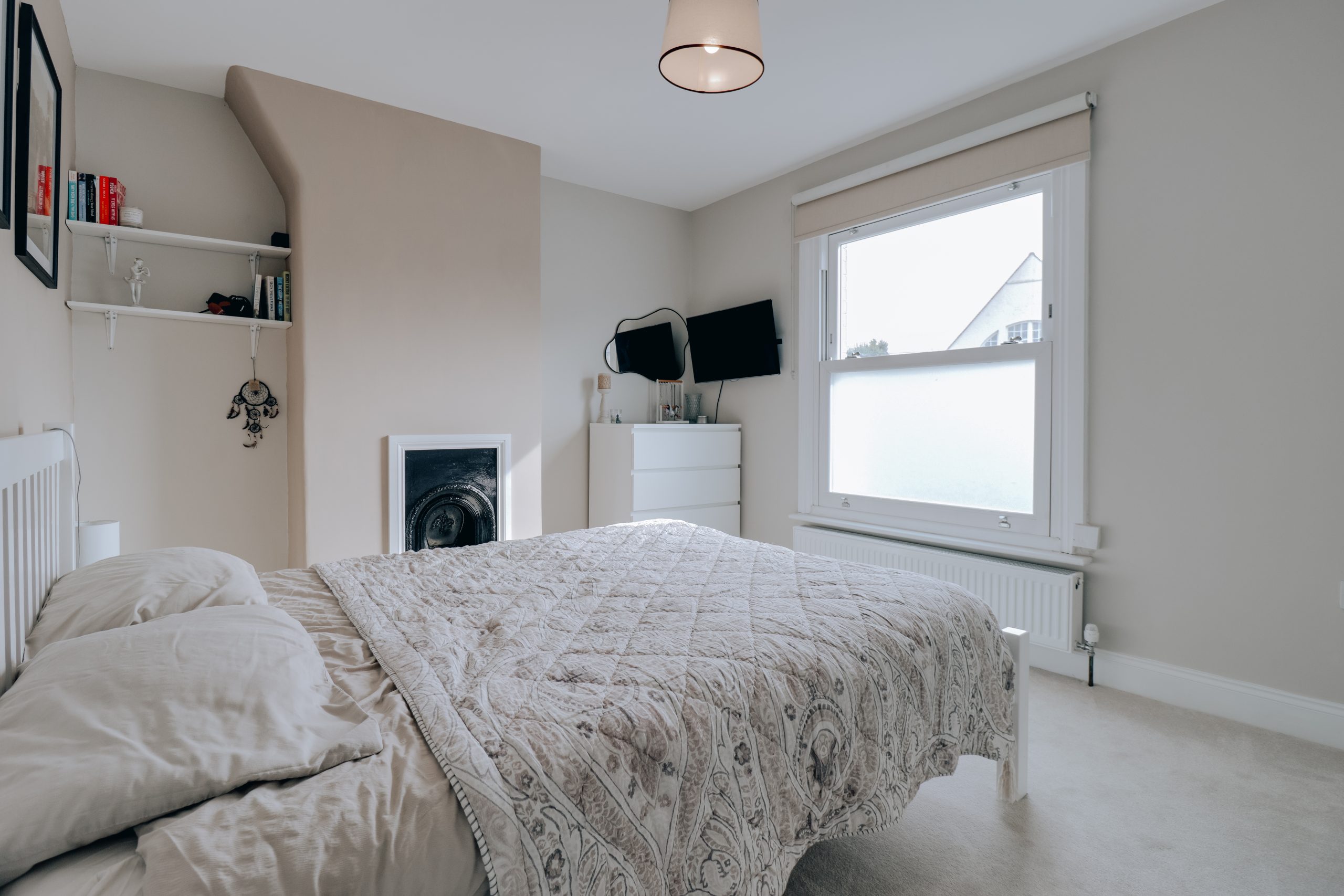 Upstairs, two double bedrooms provide a calm and comfortable retreat. The principal bedroom benefits from generous proportions and a large sash window that draws in abundant daylight, paired with freestanding cabinetry for streamlined storage. The second bedroom is equally versatile – ideal for guests, a study, or a nursery – offering flexibility to evolve with your lifestyle. The main bathroom is accessed via the landing and finished in a contemporary yet classic style, with quality fittings that elevate the everyday.