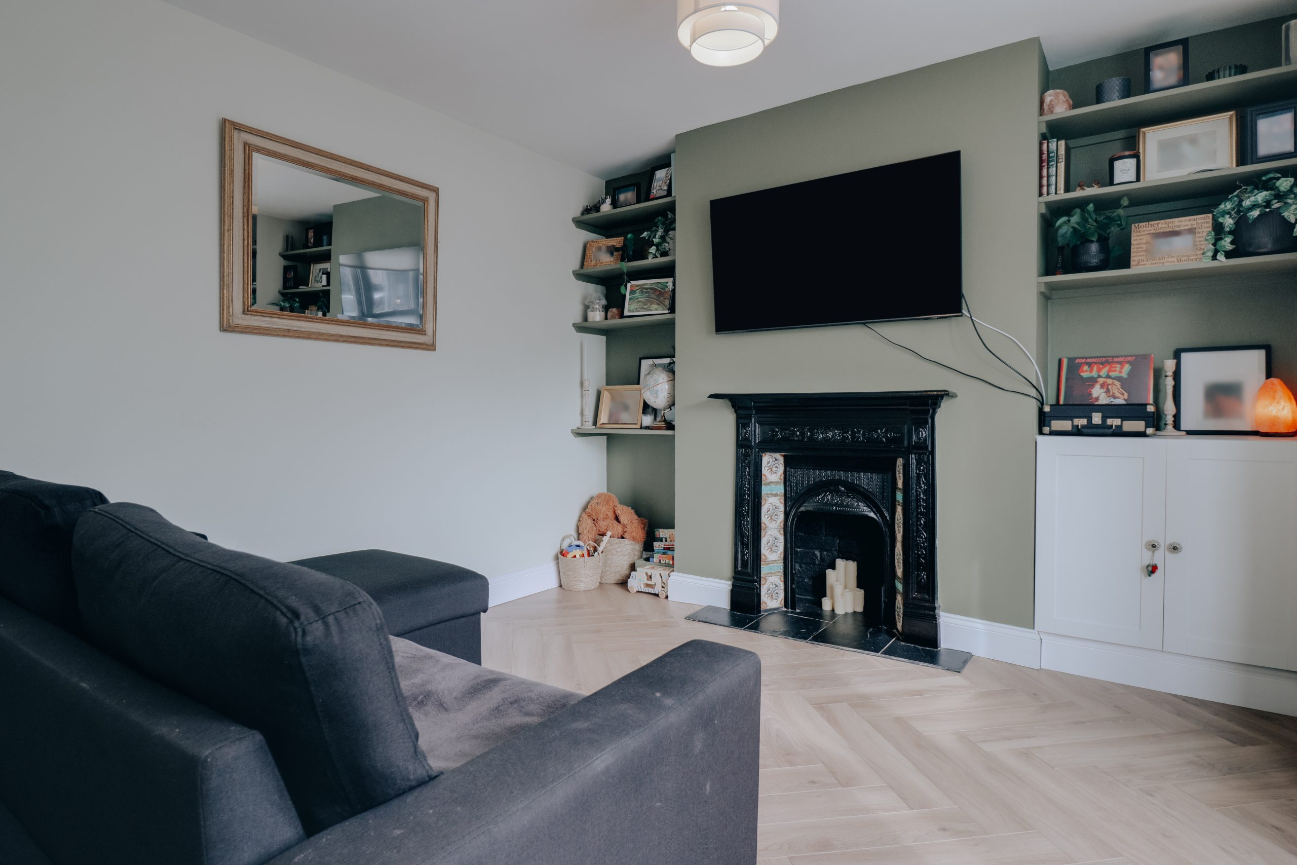Inside, the tone is set by a bright and inviting 13ft living room, where a striking box-bay window bathes the space in natural light. A calming, neutral palette works in harmony with period details such as bespoke alcove cabinetry, establishing a space as functional as it is stylish. To the rear, the home unfolds into an expansive 25’10” x 13’3” open-plan kitchen and dining area – the true heart of the house. Glazing in the form of windows and patio doors welcomes both soft northern light and golden westerly sun, ensuring the room feels airy and warm from dawn to dusk. The dining zone, anchored by a bold, orange-painted original chimney stack, offers an atmospheric backdrop for entertaining.The adjoining kitchen blends timeless design with modern practicality: sleek cabinetry, integrated appliances, and generous counter space create an elegant yet efficient working environment.