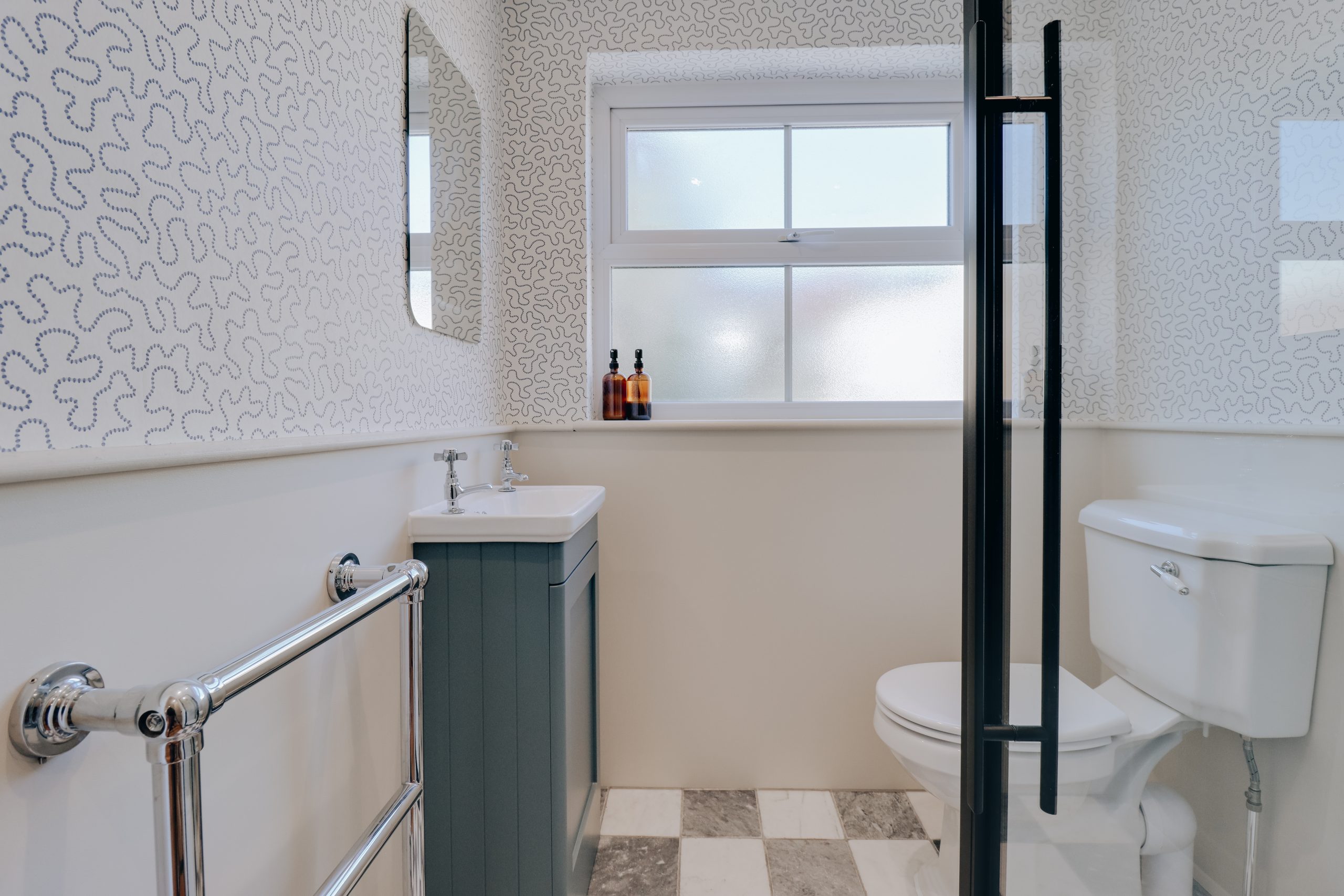 Upon entry, you're greeted by a bright and inviting 13ft living room, where a striking box-bay window floods the space with natural light. A neutral palette and thoughtful finishes, including column radiators and built-in alcove storage create an ideal environment for both entertaining and relaxing in equal measure. The rear of the home opens into an impressive, open-plan kitchen and dining area, measuring an expansive 21’9” x 10’8”. With dual-aspect glazing inviting in soft northern and golden westerly light, the room is filled with warmth and natural brightness throughout the day. A bold, black-painted original fireplace anchors the dining area with sophistication, while bespoke under-stair cabinetry offers stylish storage and a cleverly concealed home bar. At the far end, the kitchen stands as a masterclass in design and functionality. Classic yet contemporary, it features sleek cabinetry, integrated appliances (including a built-in microwave and oven-grill), and generous counter space perfect for both culinary enthusiasts and busy households. A separate utility area and a chic ground floor bathroom round out the level, boasting heritage-inspired fittings, statement chequerboard floor tiles, and a creative mix of abstract wallpaper and crisp white panelling for an added touch of flair.