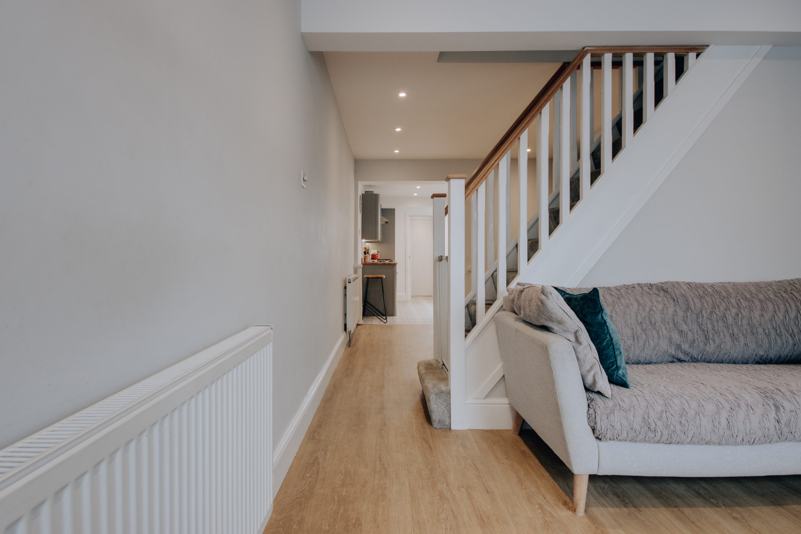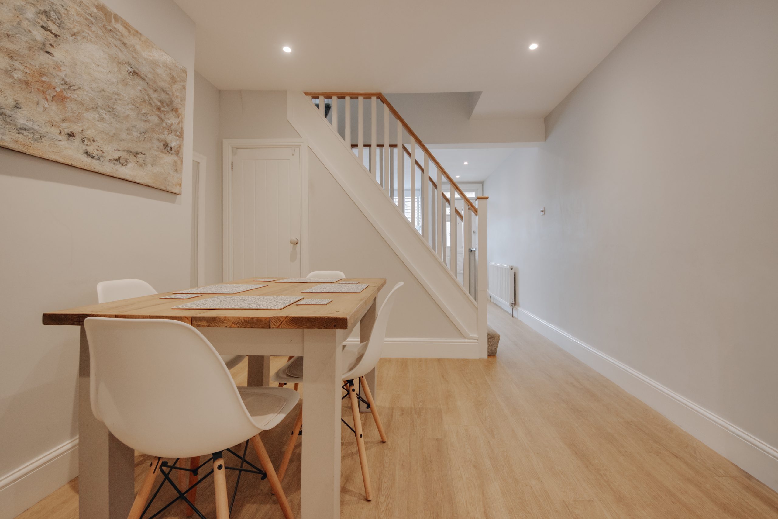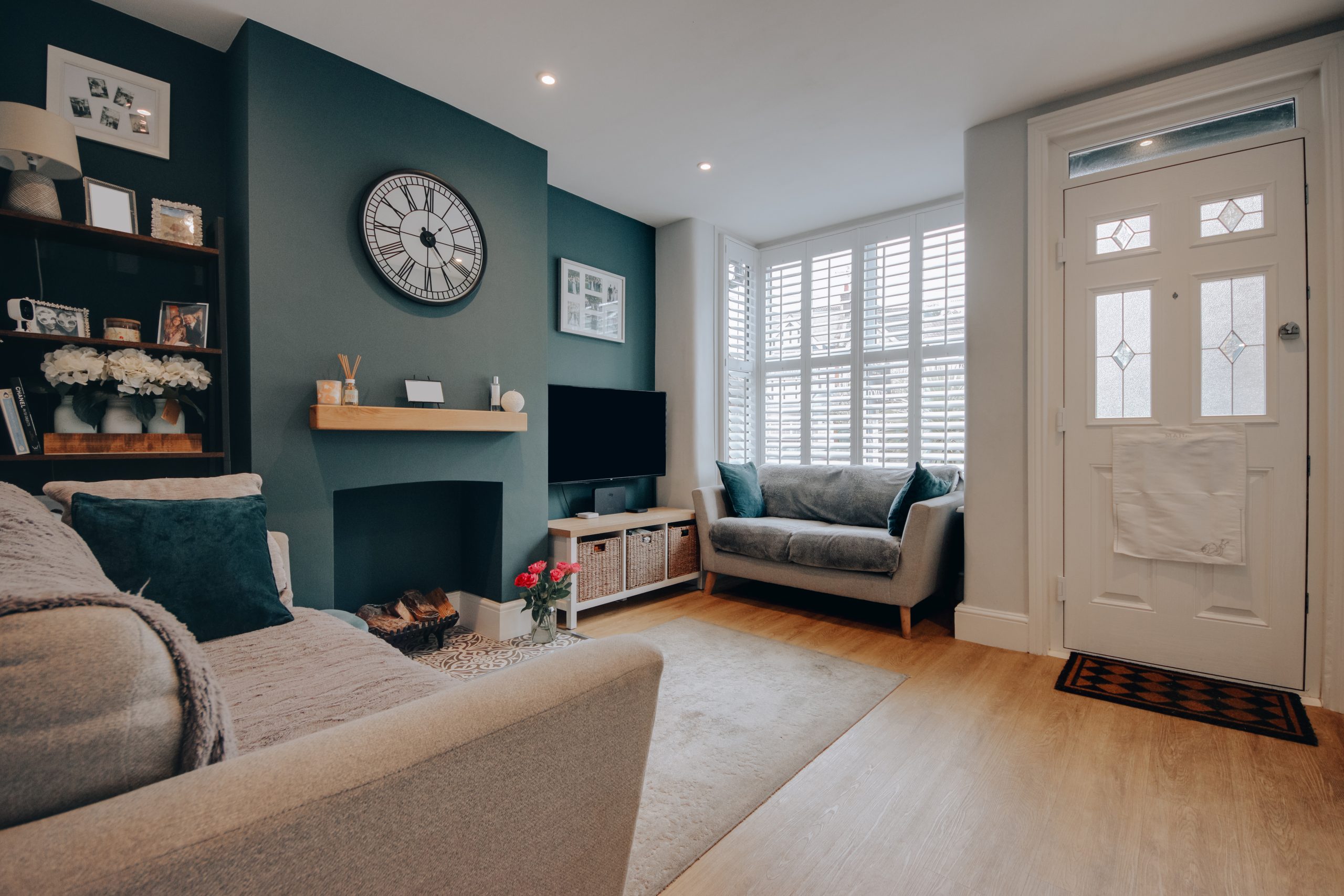 Inside, the living room is a near-perfect square at 10'4" x 10'8", with a box-bay window drawing in generous natural light. Built-in alcove storage and a neutral palette make it equally suited to entertaining and everyday living. The staircase acts as a natural partition within the open-plan layout, with a designated dining zone beyond. Bespoke under-stair cabinetry and an alcove beside the chimney breast, ideal as a study corner, make excellent use of the space. The kitchen is the result of a considered rear extension and is the clear centrepiece of the home. Skylights draw in soft northern light and warm westerly sun throughout the day. Classical cabinetry, integrated appliances including a built-in microwave and oven-grill, and generous counter space are complemented by a separate utility area. A ground floor bathroom with statement floor tiles and contemporary fittings completes the level. Upstairs, two well-proportioned double bedrooms. The principal room has a large window, ample space for freestanding cabinetry along the nearside wall, and its own en-suite. The second is equally spacious, versatile enough for guests, a home office, or a nursery.
