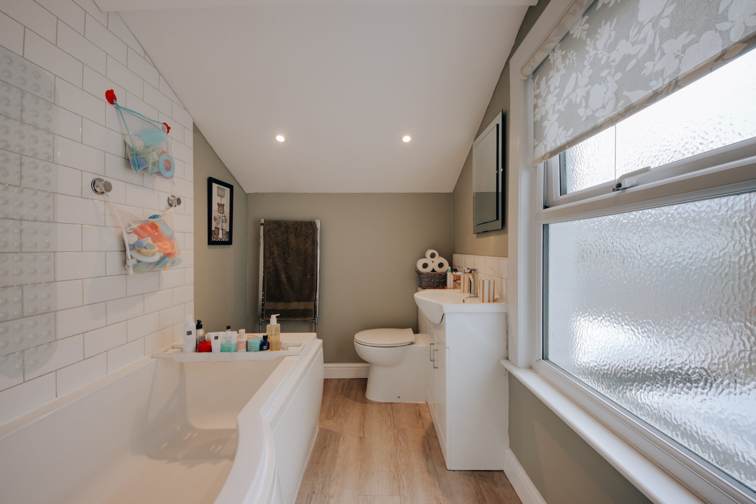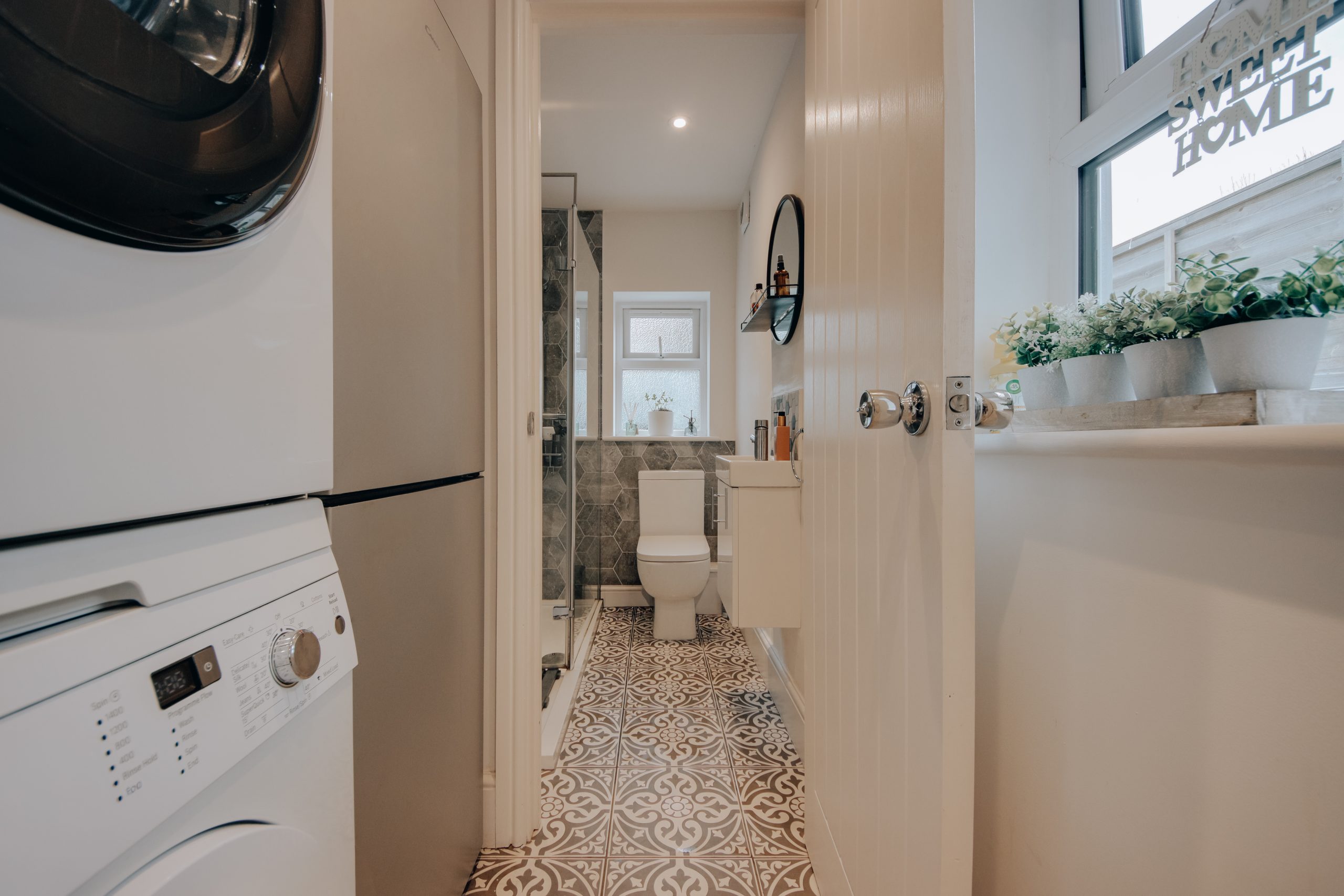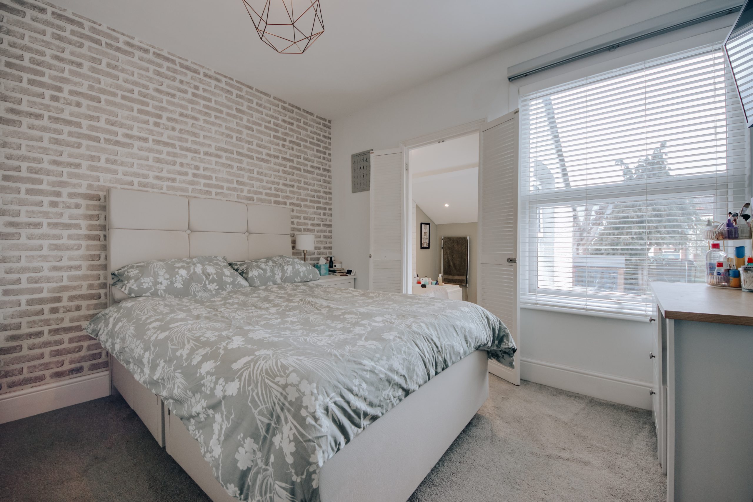 Inside, the living room is a near-perfect square at 10'4" x 10'8", with a box-bay window drawing in generous natural light. Built-in alcove storage and a neutral palette make it equally suited to entertaining and everyday living. The staircase acts as a natural partition within the open-plan layout, with a designated dining zone beyond. Bespoke under-stair cabinetry and an alcove beside the chimney breast, ideal as a study corner, make excellent use of the space. The kitchen is the result of a considered rear extension and is the clear centrepiece of the home. Skylights draw in soft northern light and warm westerly sun throughout the day. Classical cabinetry, integrated appliances including a built-in microwave and oven-grill, and generous counter space are complemented by a separate utility area. A ground floor bathroom with statement floor tiles and contemporary fittings completes the level. Upstairs, two well-proportioned double bedrooms. The principal room has a large window, ample space for freestanding cabinetry along the nearside wall, and its own en-suite. The second is equally spacious, versatile enough for guests, a home office, or a nursery.