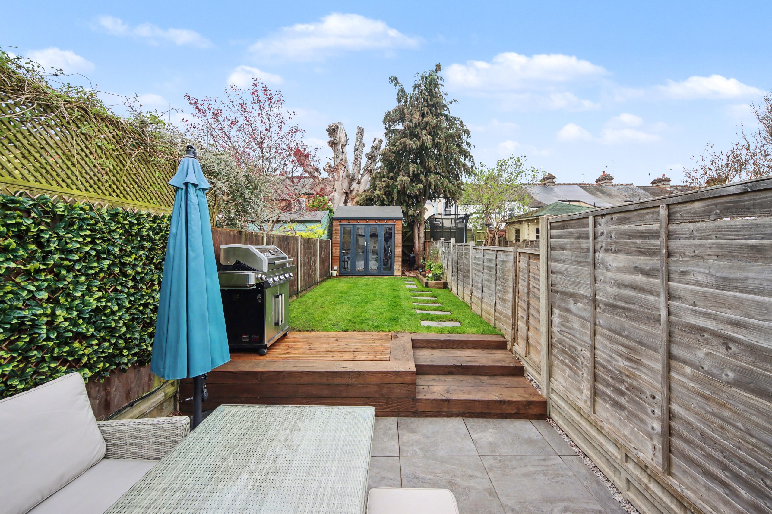 To the rear, a west-facing garden has been thoughtfully landscaped for low-maintenance enjoyment. Split across two levels, it offers distinct zones for al fresco dining and unwinding. A garden room, currently configured as a home office and well-suited to it, sits at the far end alongside gated rear access via a private service path. Practical additions that quietly earn their place.