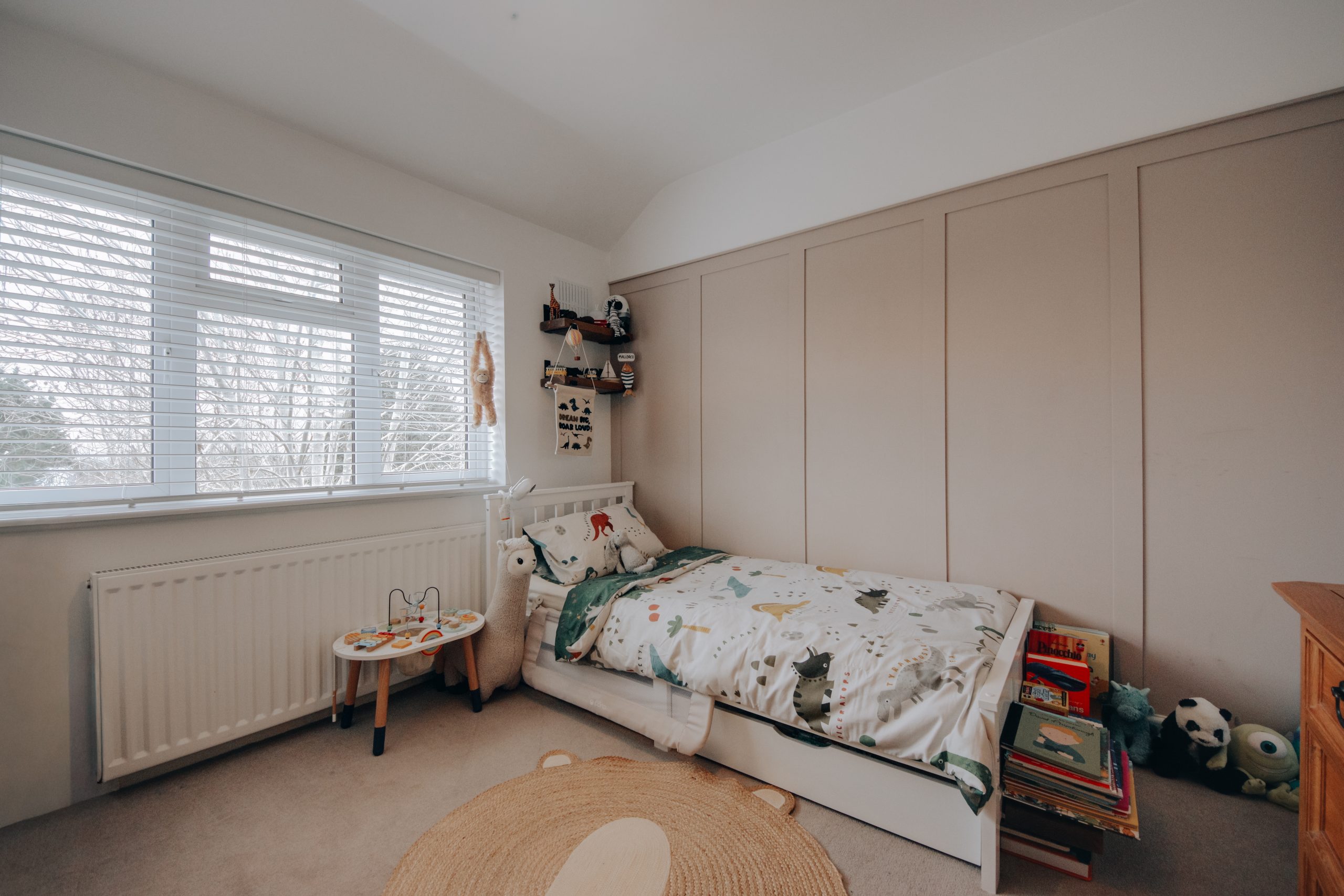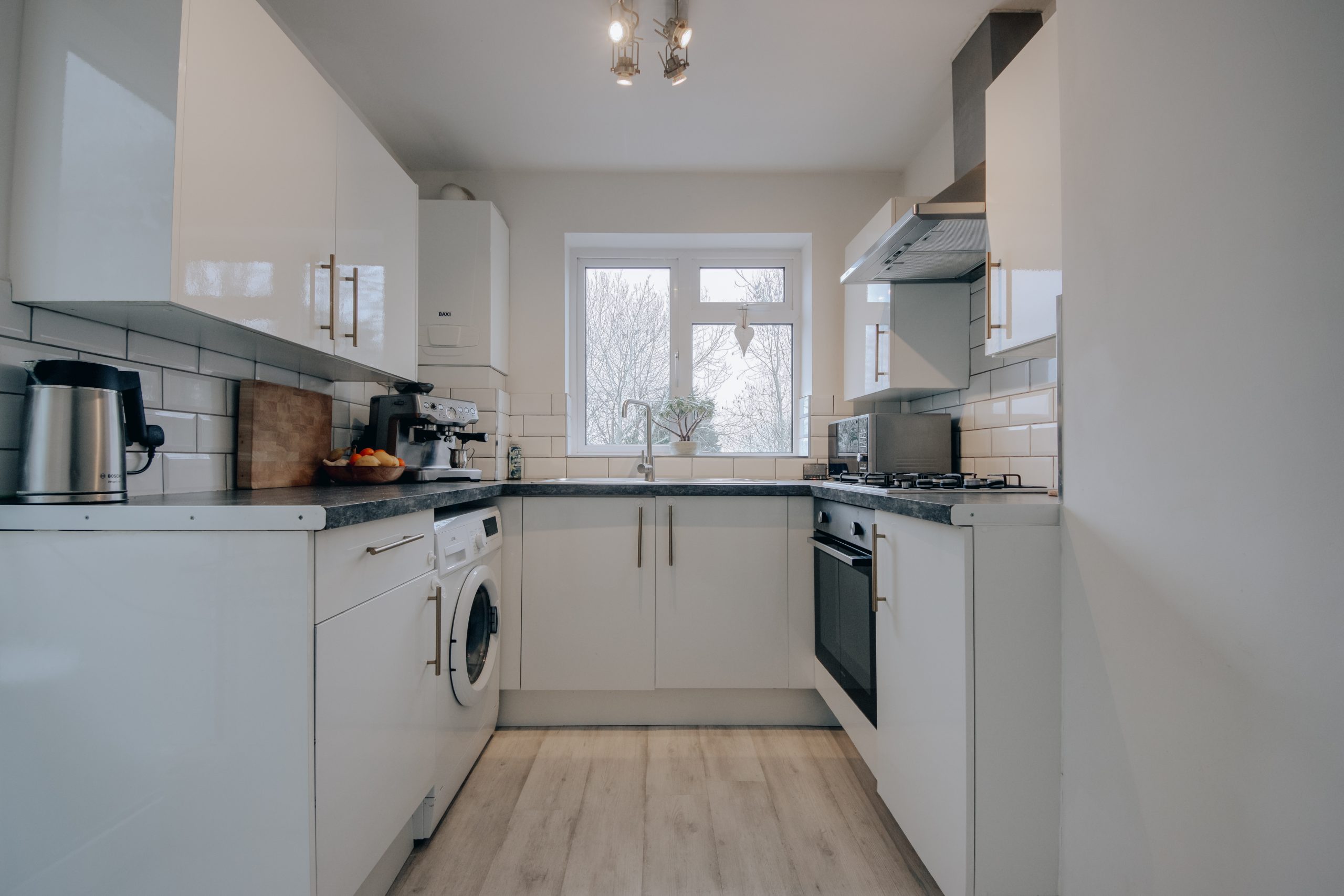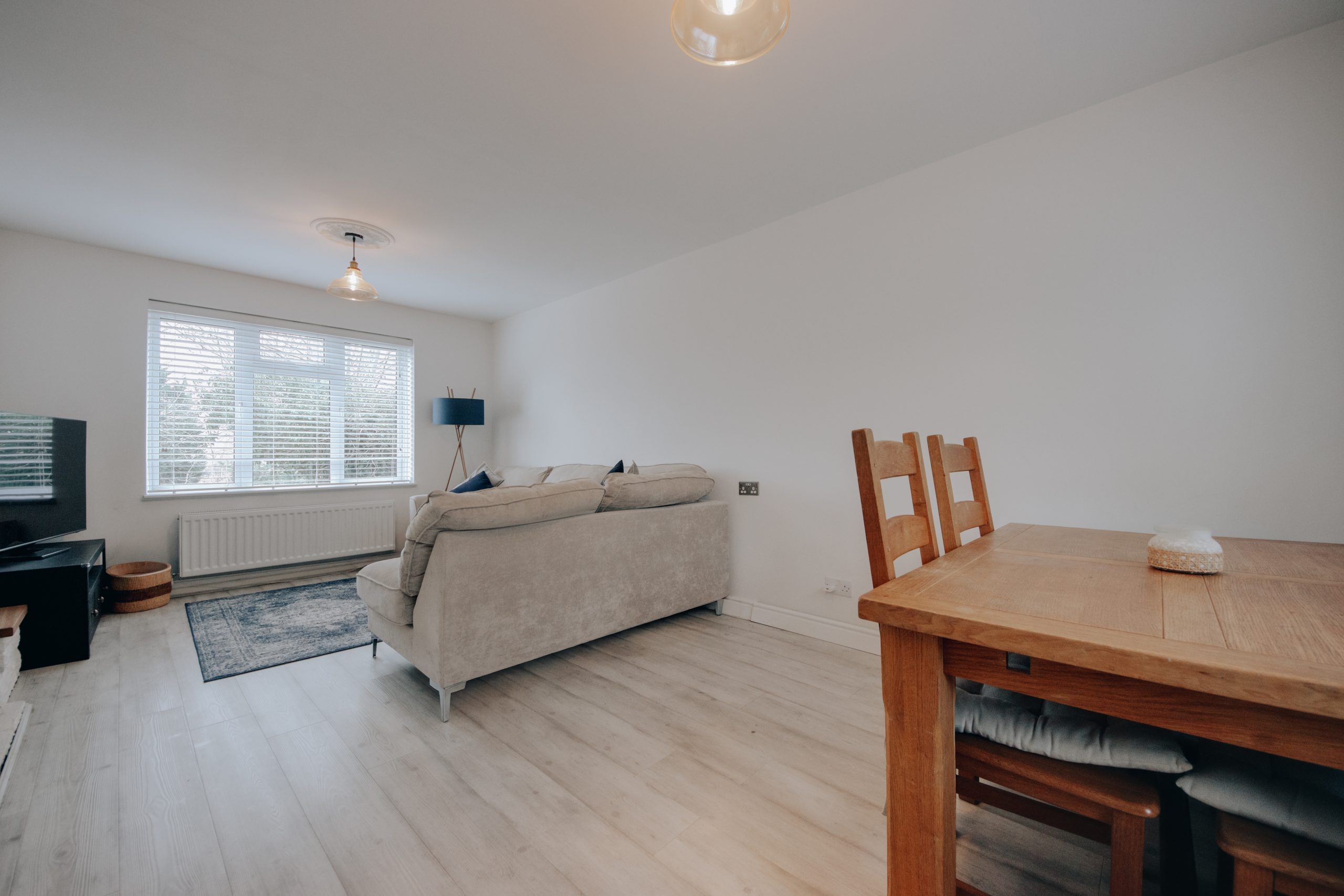 Inside, a bright and inviting hallway introduces interiors that are both practical and comfortably refined. The ground floor has been arranged to create an open, flowing living environment suited to everyday life. The principal living and dining space 19’1” x 10’10” stretches the depth of the house, with dual aspect windows drawing in natural light throughout the day. A central fireplace anchors the room, creating a natural focal point and lending warmth to a space equally suited to relaxed evenings or hosting friends. Clean lines and a calm, neutral palette give the home a fresh, modern feel. The kitchen is compact yet highly functional, fitted with ample cabinetry, practical work surfaces and integrated appliances that make excellent use of the footprint. Beyond, a useful storage room accessible from both the kitchen and externally adds further practicality and speaks to the home’s sensible, well considered layout. Subject to the usual consents STPP, the configuration and generous plot suggest clear potential for extension, offering scope to grow alongside future needs.