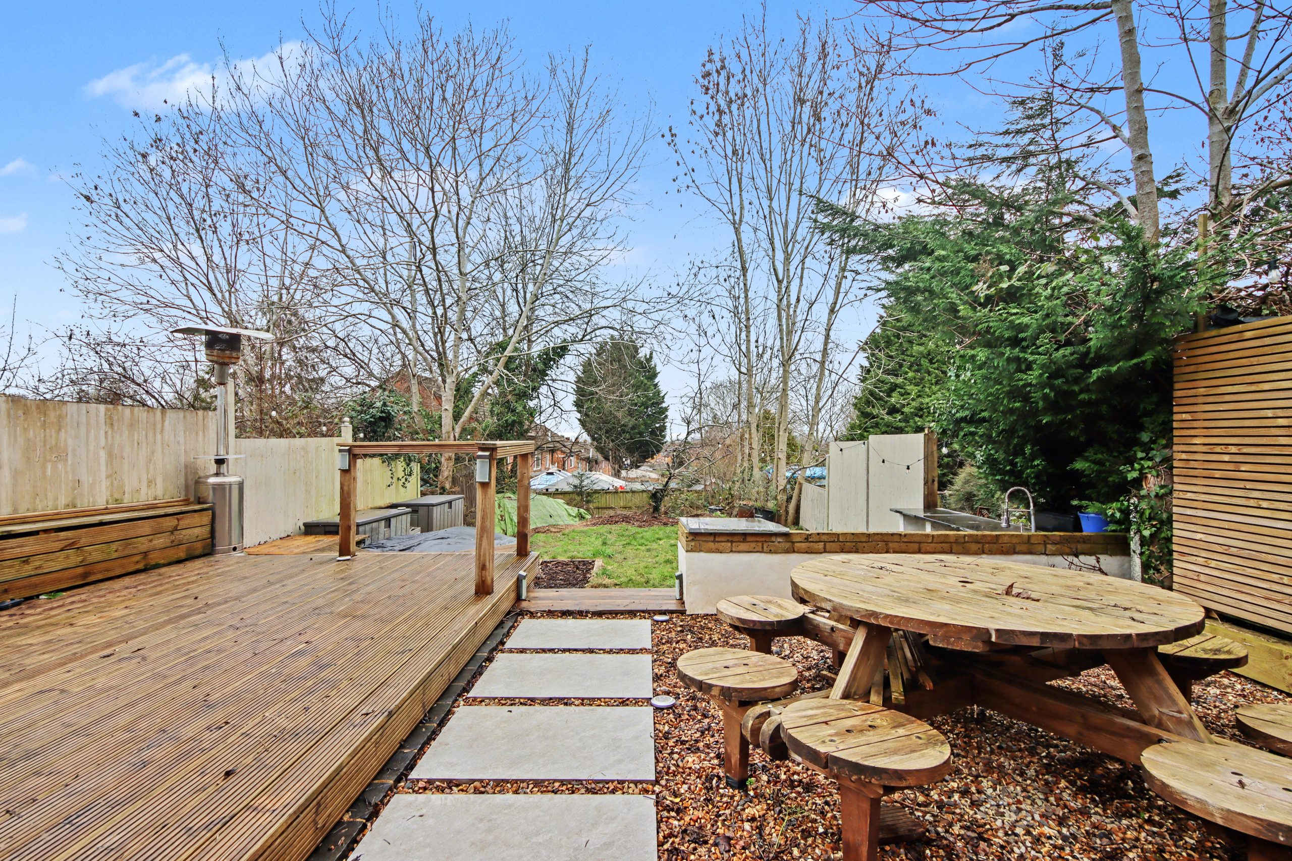 Outside, the garden has been designed with simplicity and enjoyment in mind. Extending to approximately 100 ft, an impressive length for a home of this type, it offers rare depth and versatility. Accessed via the side of the property, a raised decking area provides an ideal spot for outdoor dining or evening drinks. Adjacent, a circular seating area set within pebbled landscaping creates a natural entertaining zone. Beyond this, a generous lawn offers space to relax, play or garden throughout the seasons. Combining quiet residential surroundings with immediate access to parkland and an easy, direct commute into central London, this is a home that balances calm retreat with everyday connectivity, a thoughtful, well proportioned property with both present comfort and future potential.
