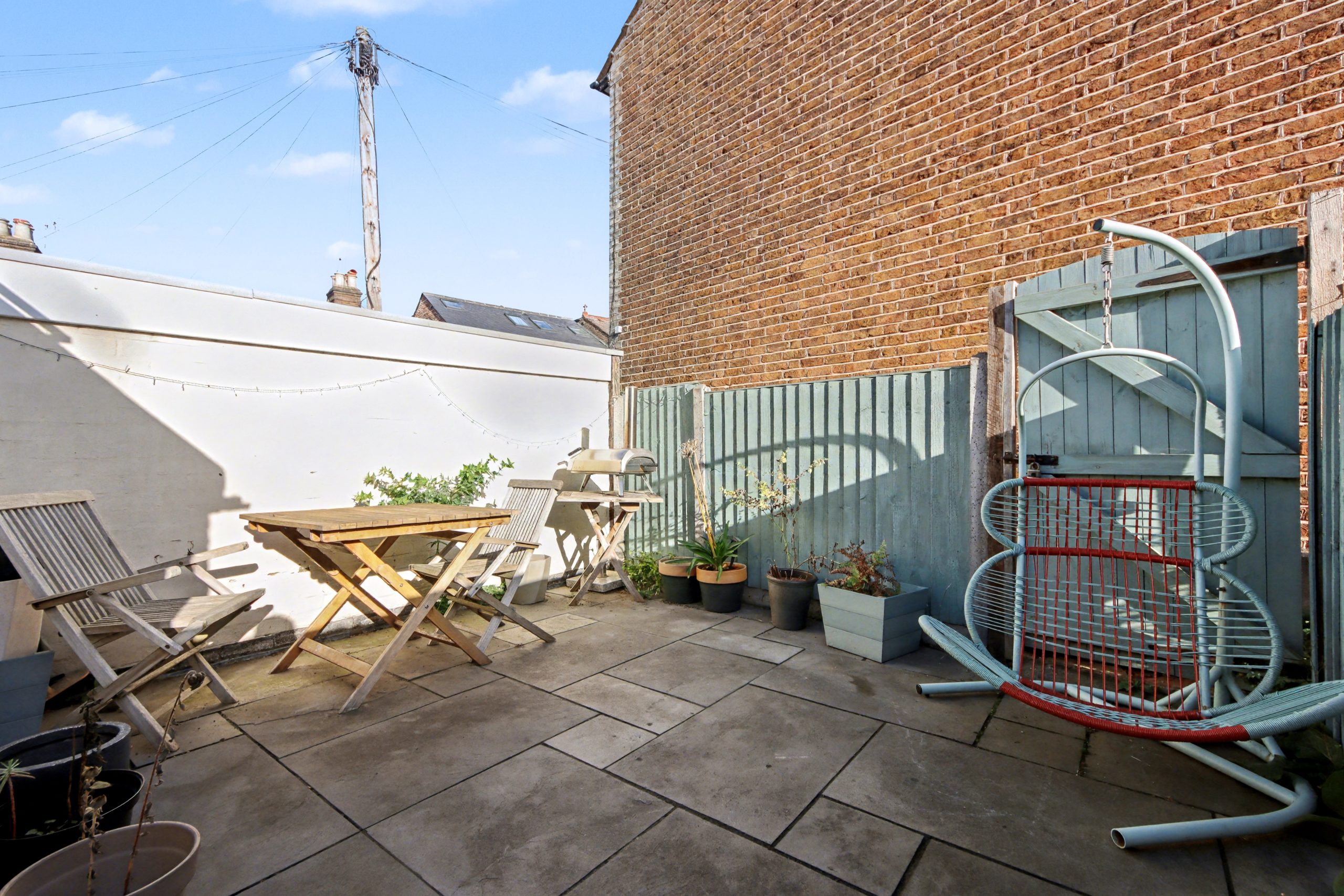 To the rear, the easterly facing garden feels almost courtyard-like in its simplicity, extending neatly from the house and offering a peaceful outdoor space to unwind.