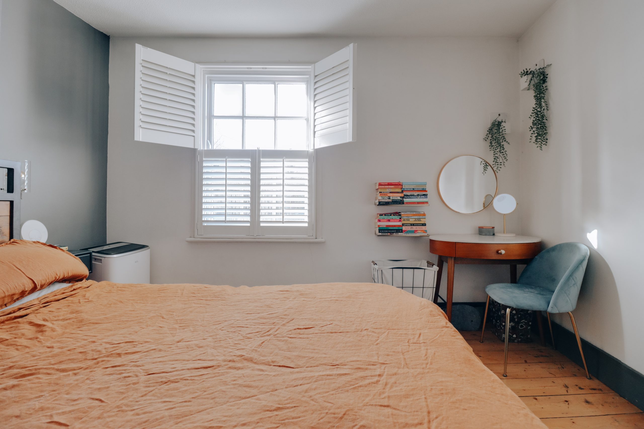 Upstairs, the first floor offers two bedrooms. The main room is bright and generous, framed by a west-facing sash window that fills the space with afternoon light and provides ample room for freestanding furniture. The second bedroom leads to an unexpected and rare addition: a separate study. Currently used as a dressing area and drum room, it’s an ideal flexible space for home working or creative pursuits.