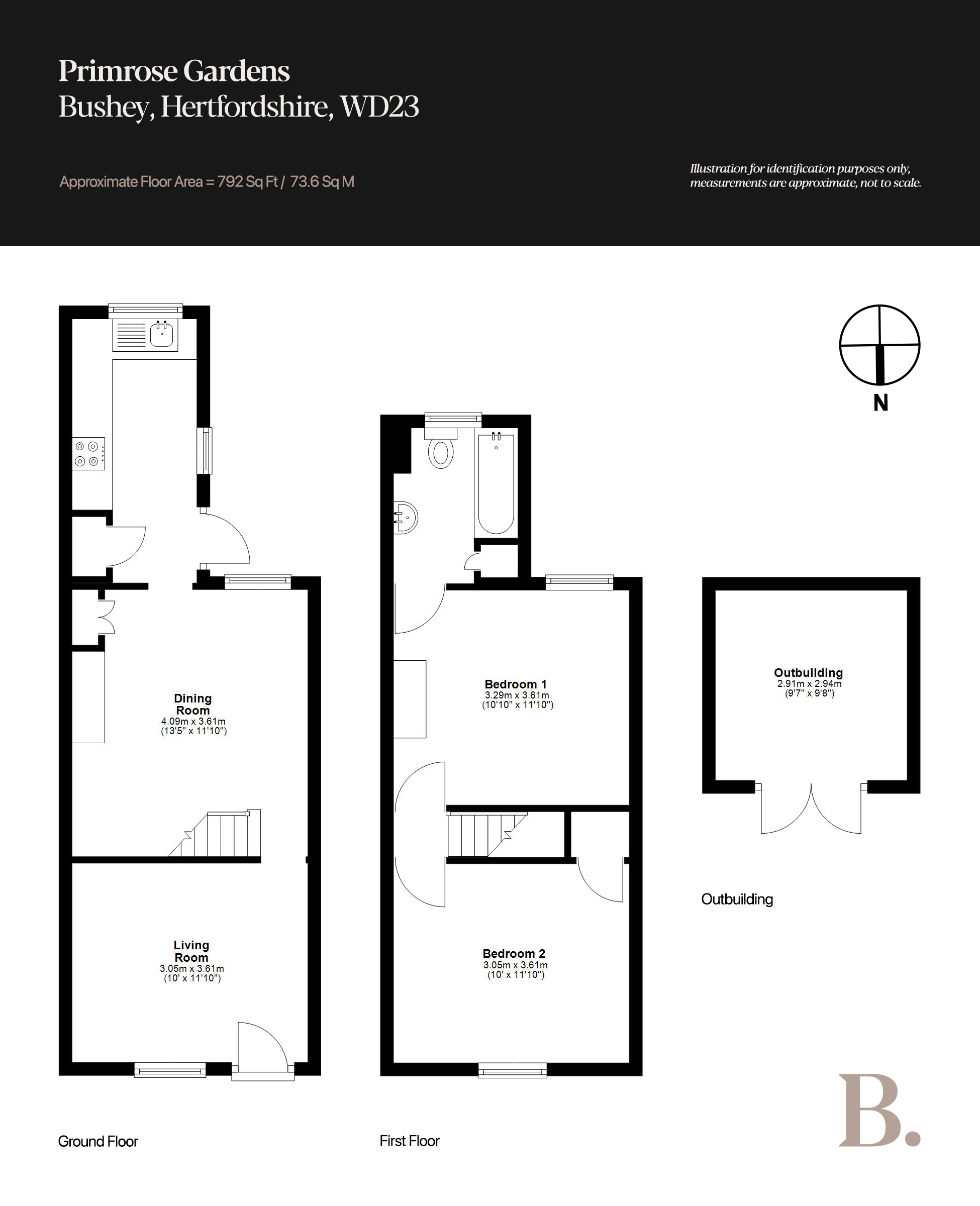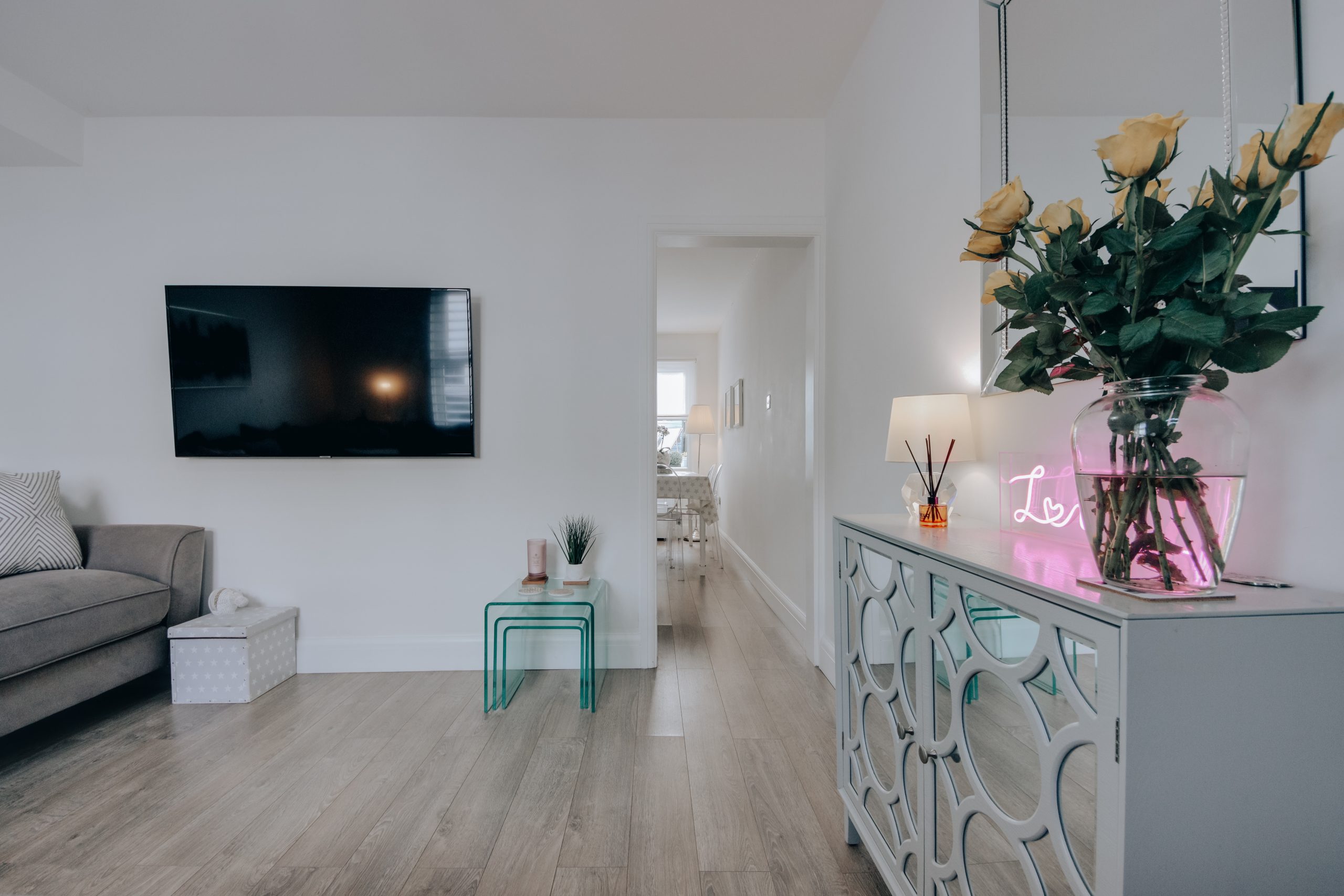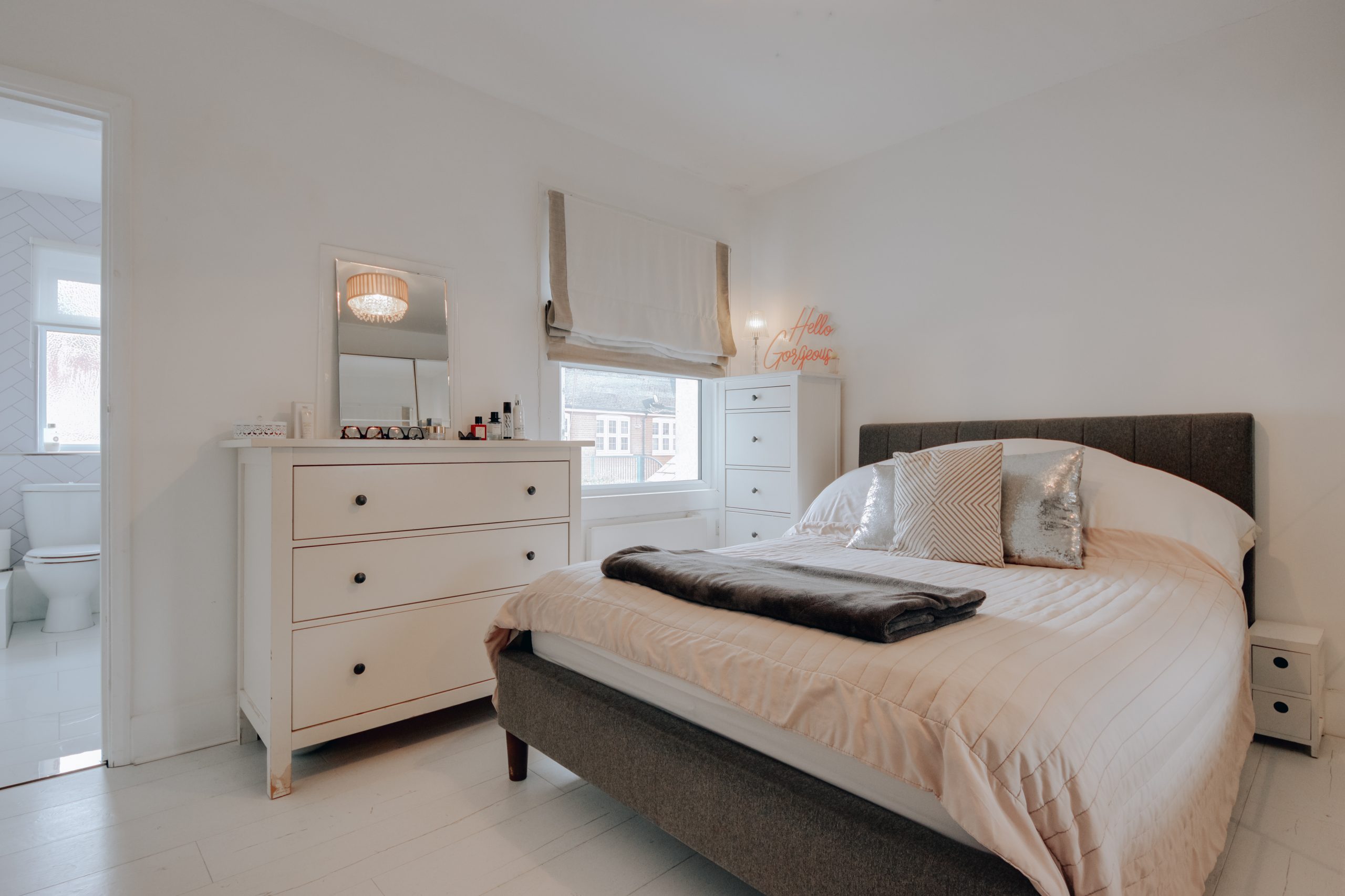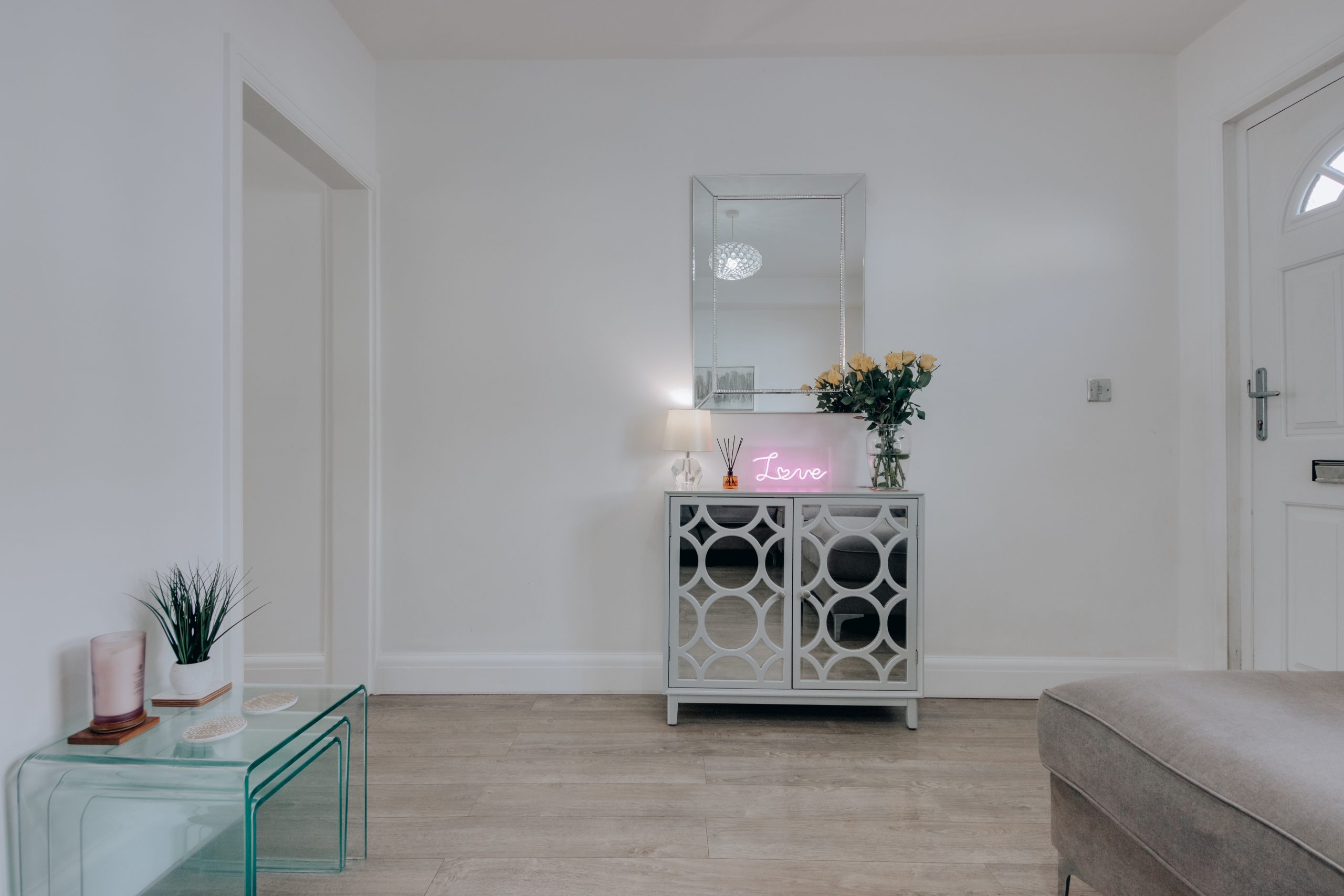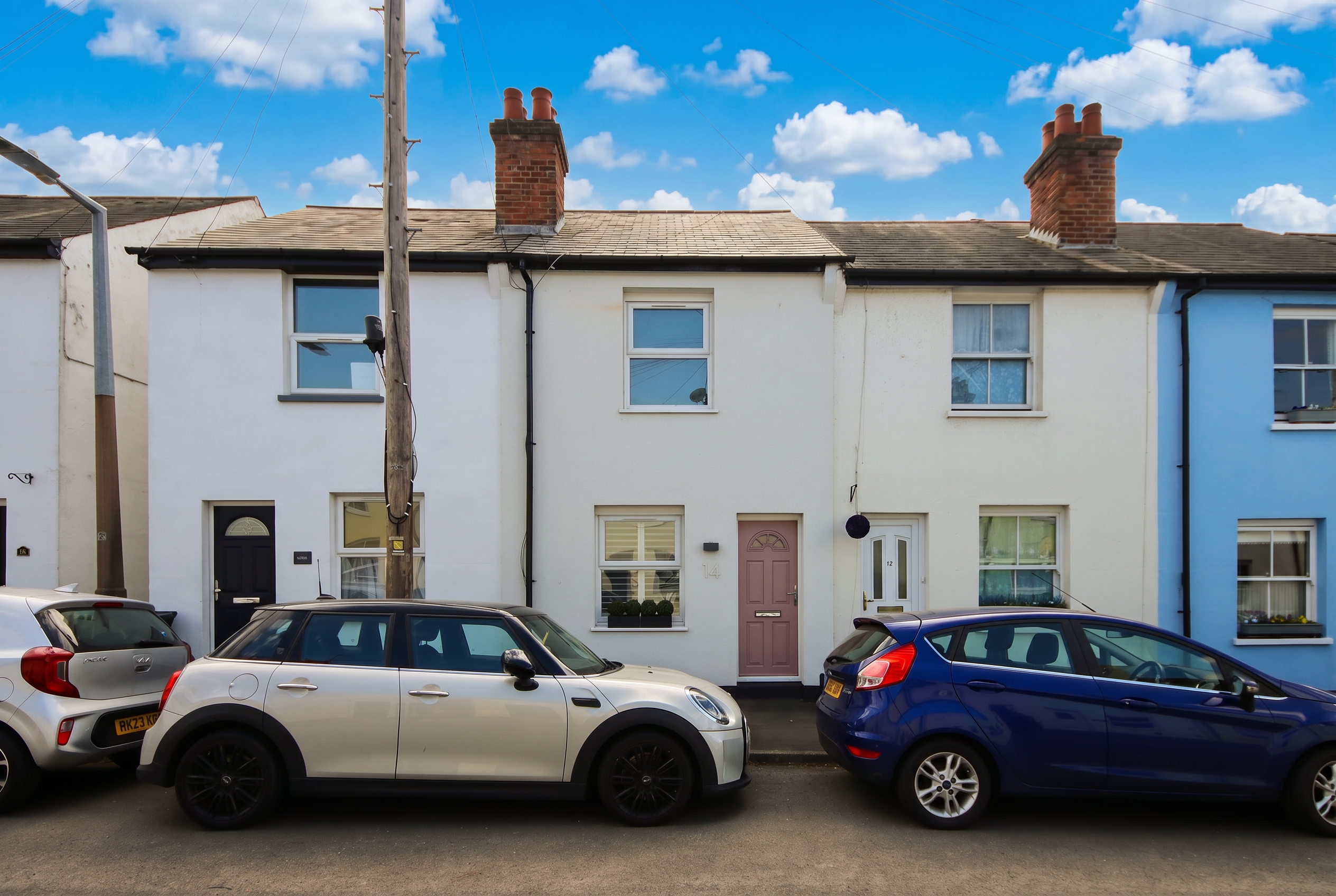 Ideally located on Primrose Gardens, this two-bedroom terraced house has been finished to a high standard throughout and is offered in genuine move-in condition. The property sits equidistant between Bushey Heath and Bushey Village, with both easily accessible on foot. For those commuting, Stanmore offers Jubilee Line connections a short drive away, and Thameslink services at Bushey Station put London Euston just 17 minutes out. The facade has been newly rendered in white, benefitting from a virtually brand new roof (two years old) and a pastel pink front door adding a quiet note of personality.