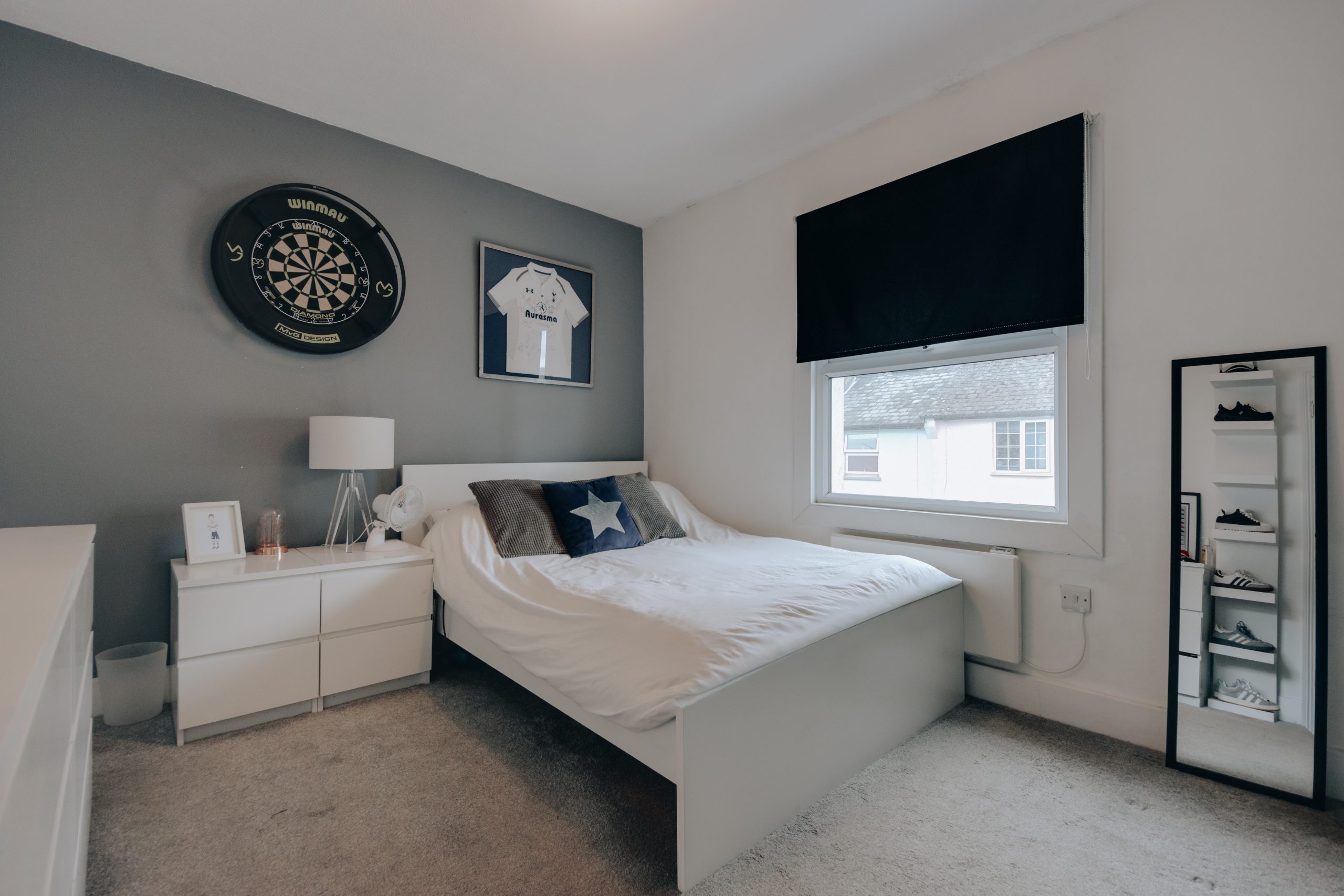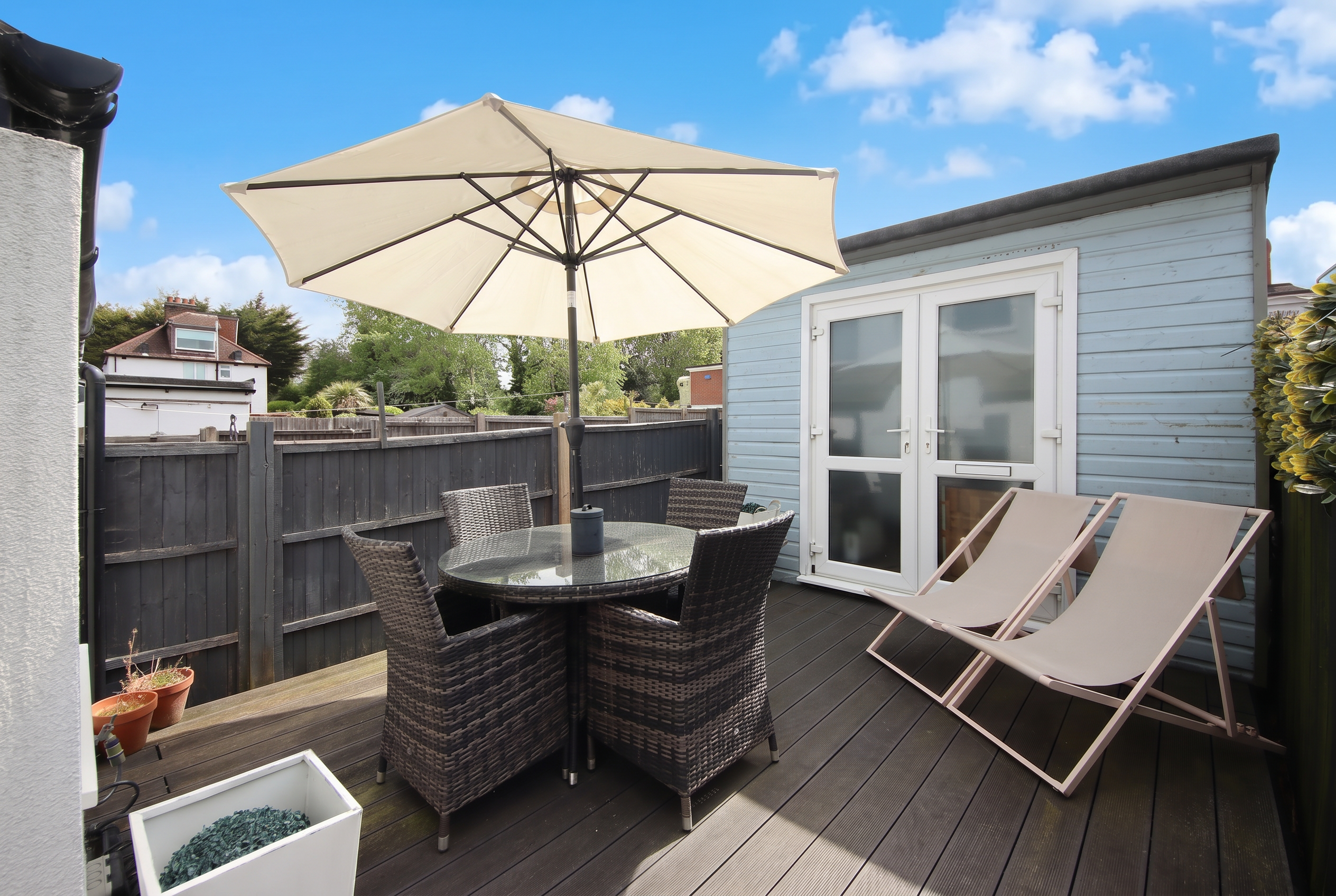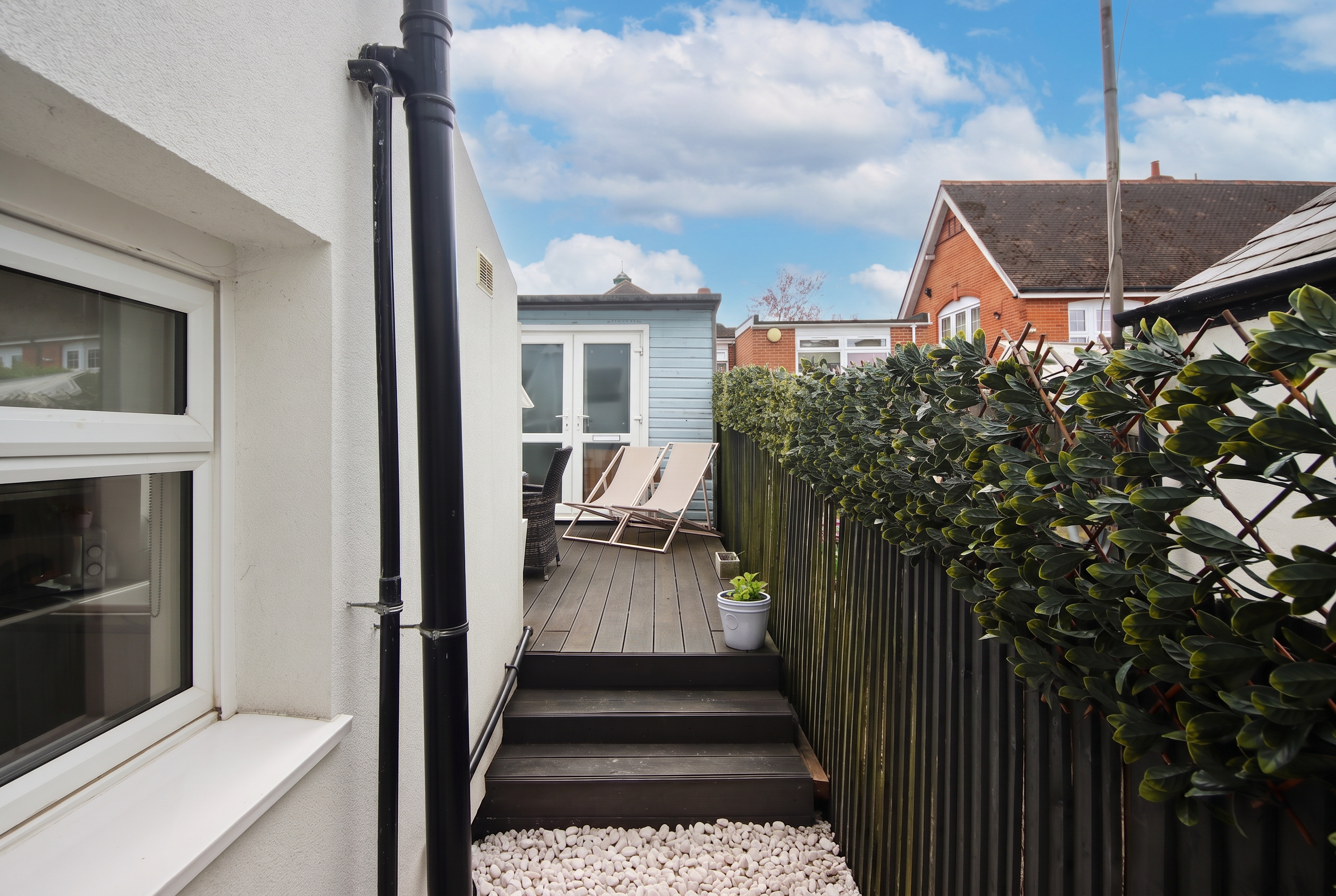 The south-facing garden is low-maintenance by design. Steps lead up to a decked terrace with space for outdoor furniture, and at the far end sits a near-square outbuilding measuring 9'1" x 9'8", currently used for storage. It could easily be removed to open the space into a larger courtyard.