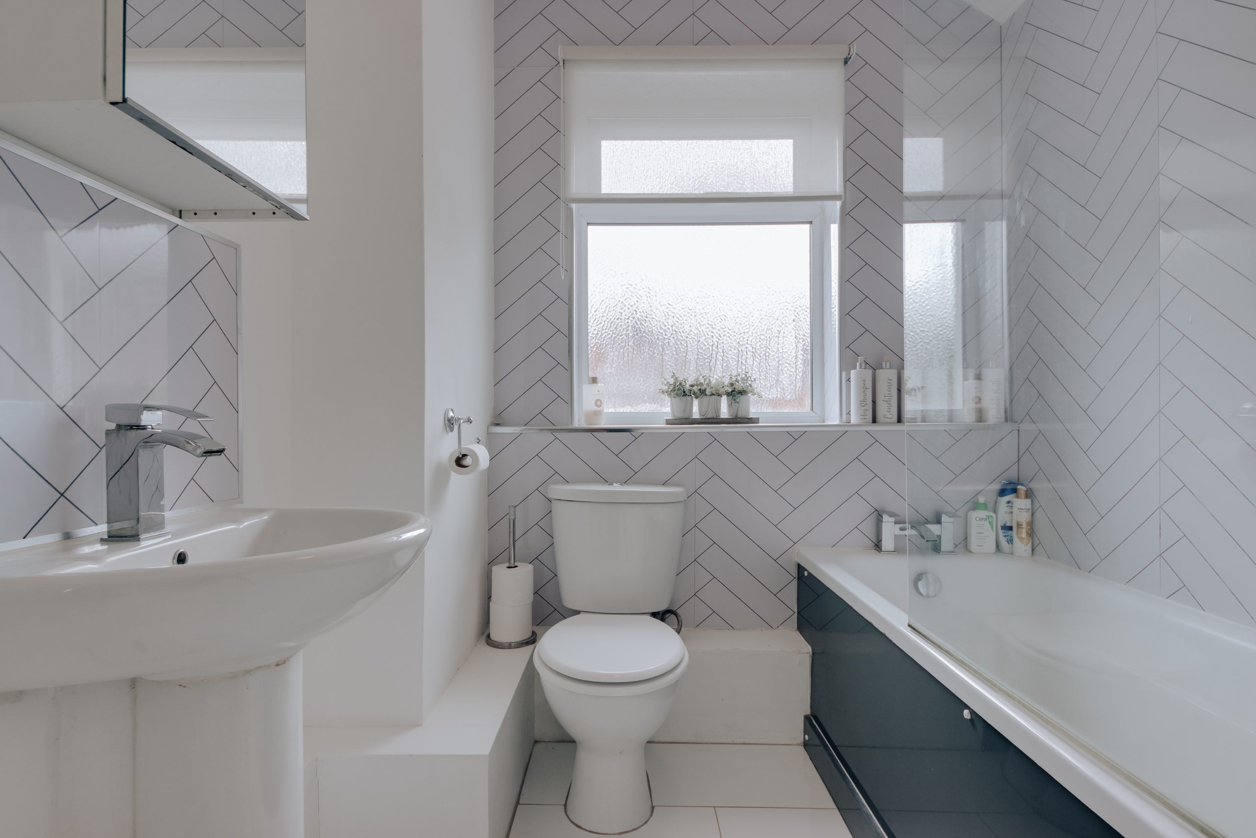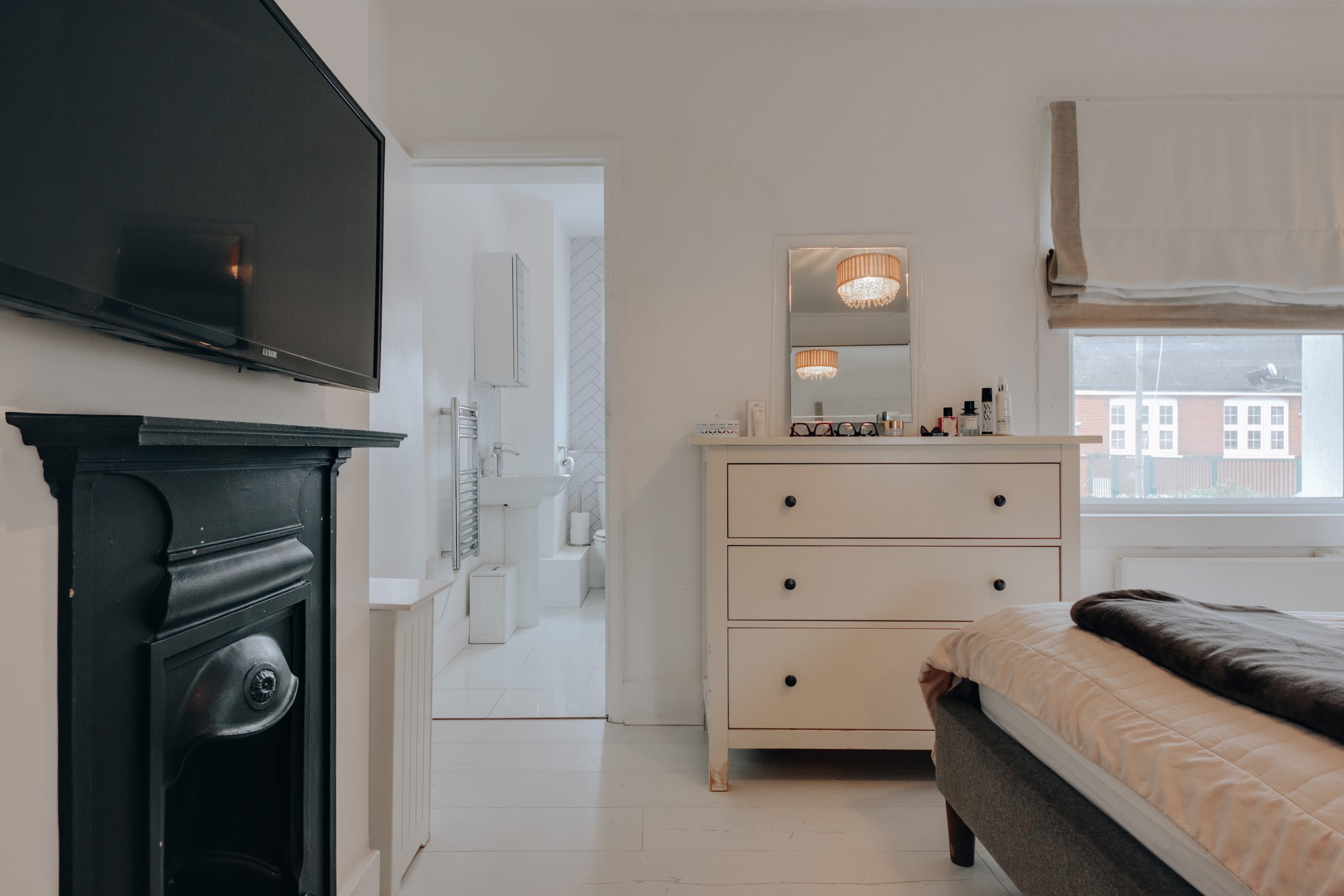 Upstairs, the main bedroom faces south and connects through to the family bathroom, finished in pastel lilac with a parquet-style tile, a bathtub and an overhead shower. The second bedroom measures 10' x 11'10" and is a generous double in its own right, though it could equally serve as a home office, dressing room, or creative space depending on the needs of the next owner.