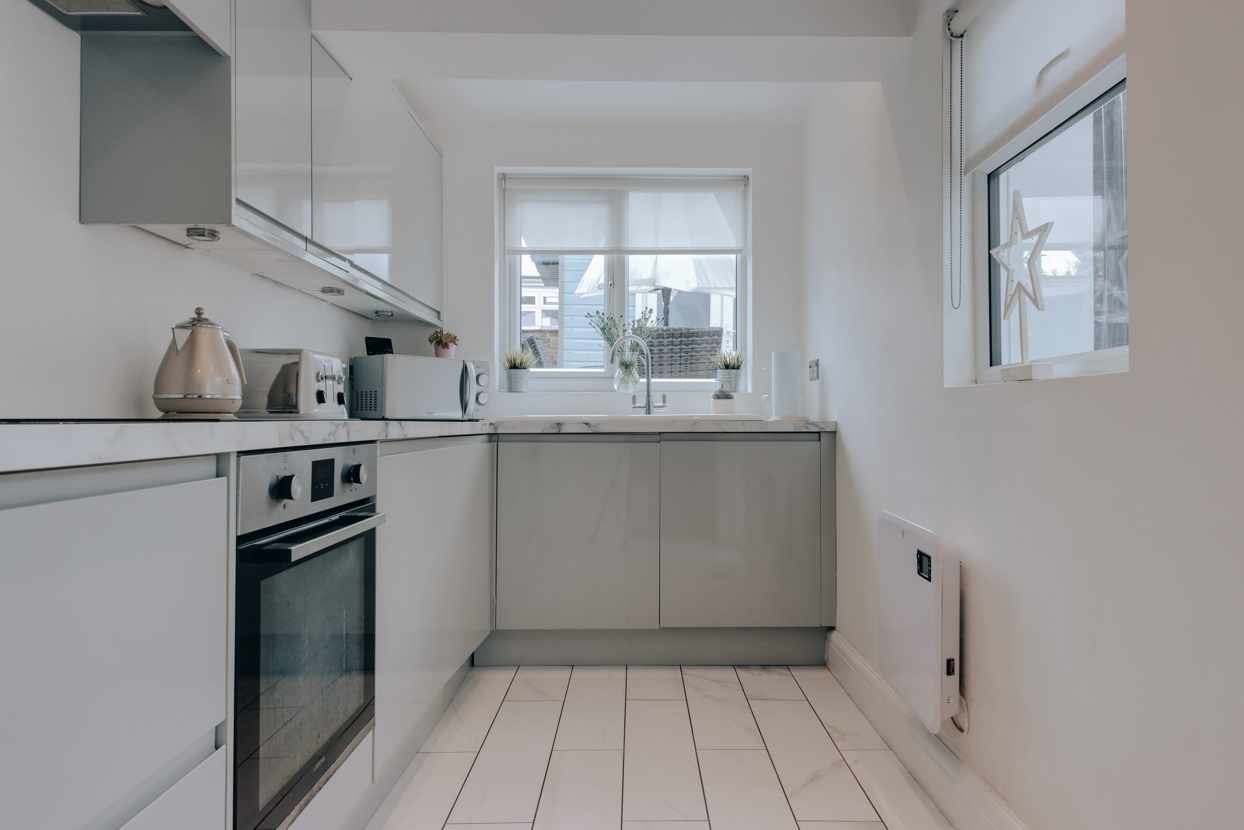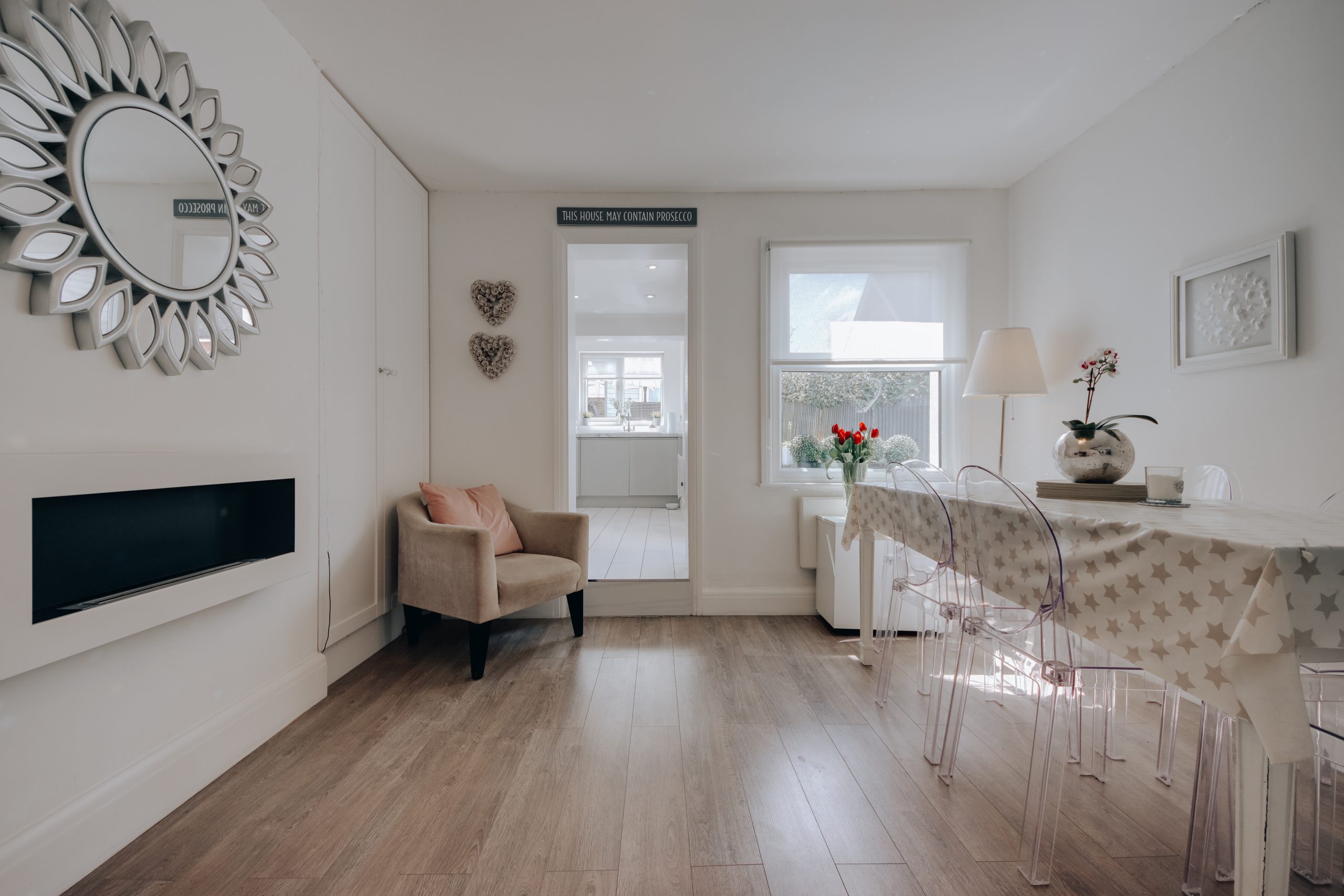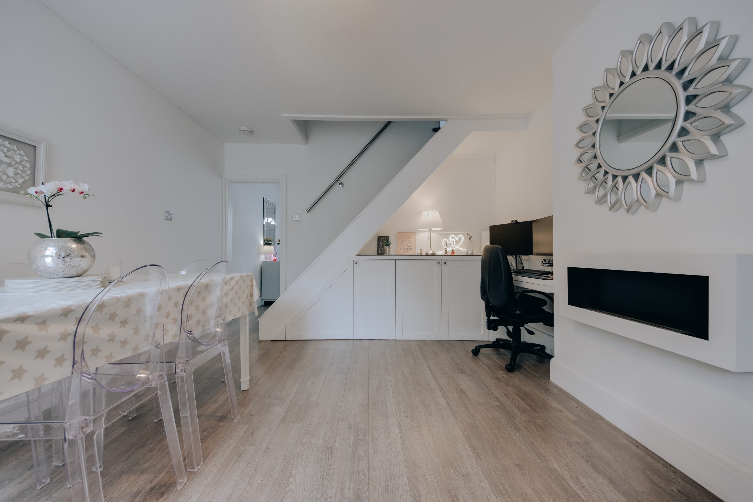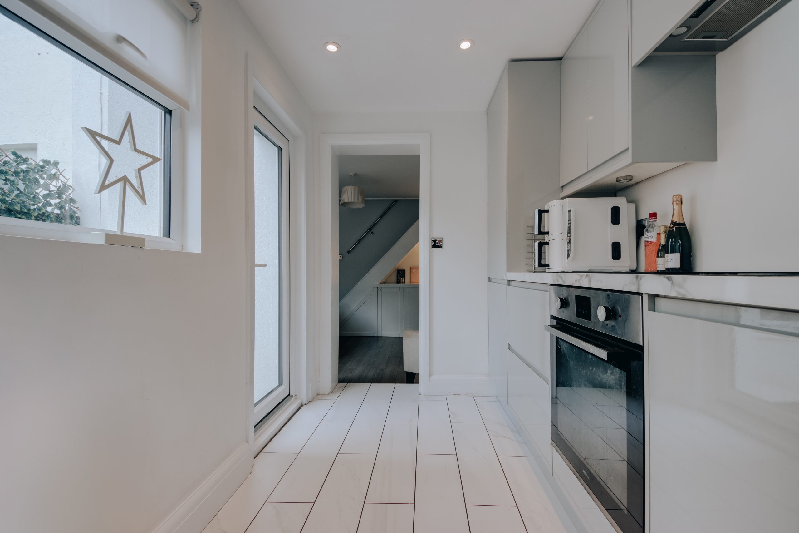 Inside, the removal of all internal doors, frames kept, opens the ground floor into a single continuous space. The front living room leads through to the dining room without interruption, the whole floor moving freely from front to back. The owners have made intelligent use of the under-stair space, with built-in storage wrapping around toward the chimney stack to form what is currently used as a study corner. Full-height shelving sits on the opposite side of the same stack. There is plenty of room for a large dining table, and a window to the rear looks directly onto the south-facing garden, light generous through the afternoon. A step leads into the kitchen: gloss grey J-pull cabinetry, white marble-effect worktops, integrated appliances throughout, and a door straight out to the garden. Streamlined, highly functional, and neatly resolved.