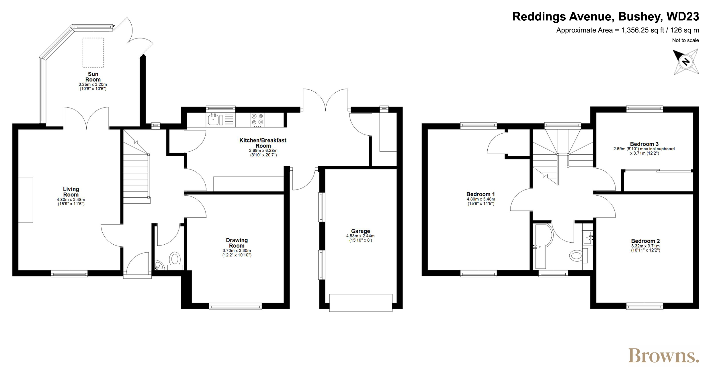 Upstairs, a broad sunlit landing leads to three well-proportioned bedrooms. The principal bedroom echoes the scale of the living room below and features bespoke cabinetry alongside dual-aspect windows, framing both south and north views. The remaining bedrooms continue the home’s elegant style, while a modern family bathroom completes the first-floor accommodation.