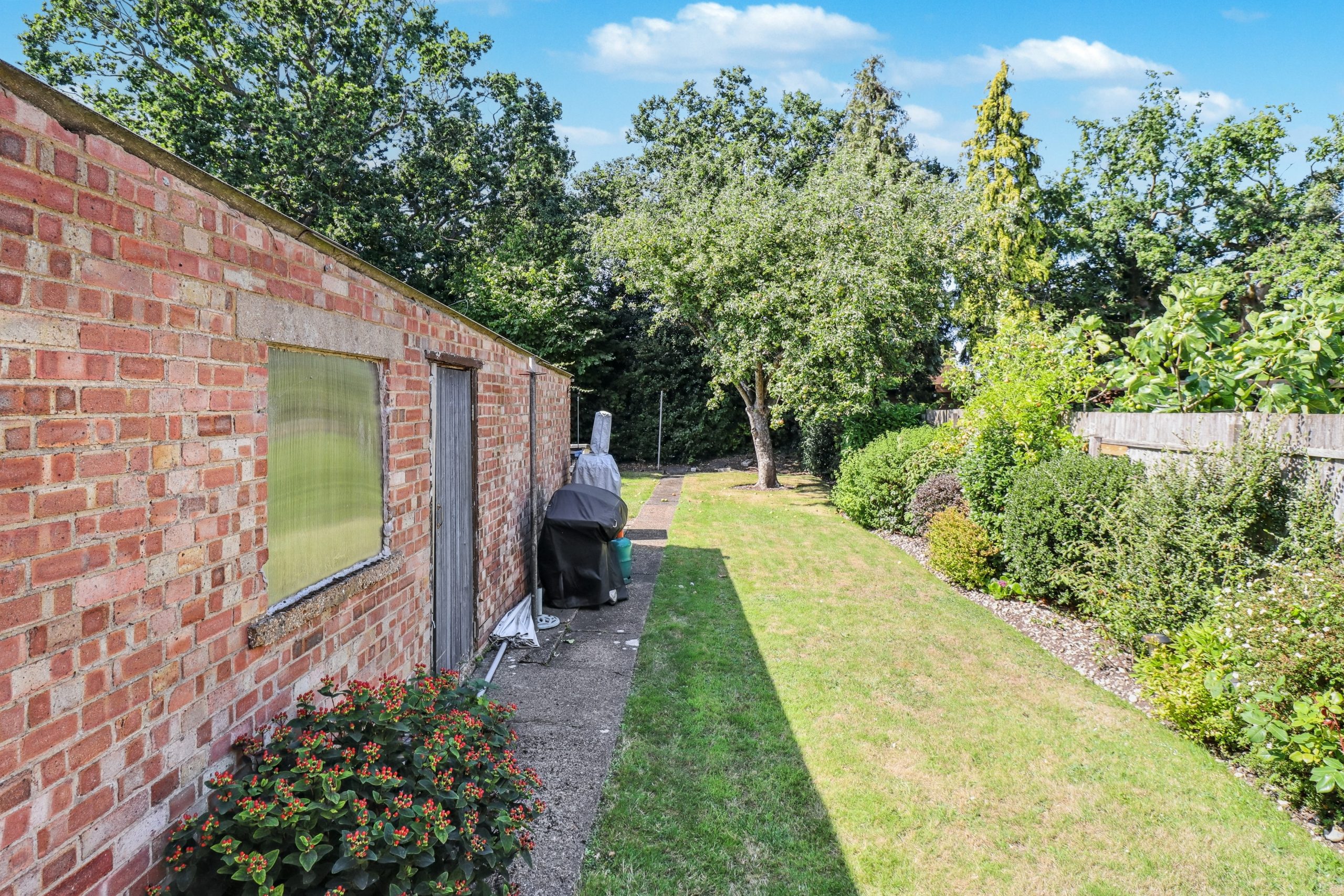 Externally, the rear garden is a wonderful feature. A patio directly off the house provides the ideal setting for outdoor dining and entertaining, framed by well-kept planting beds. Steps lead down to a generous lawn, offering space for relaxation or play. To the rear, a substantial garage provides excellent versatility - currently used for storage, it could easily be adapted into a home office, gym, or creative studio.