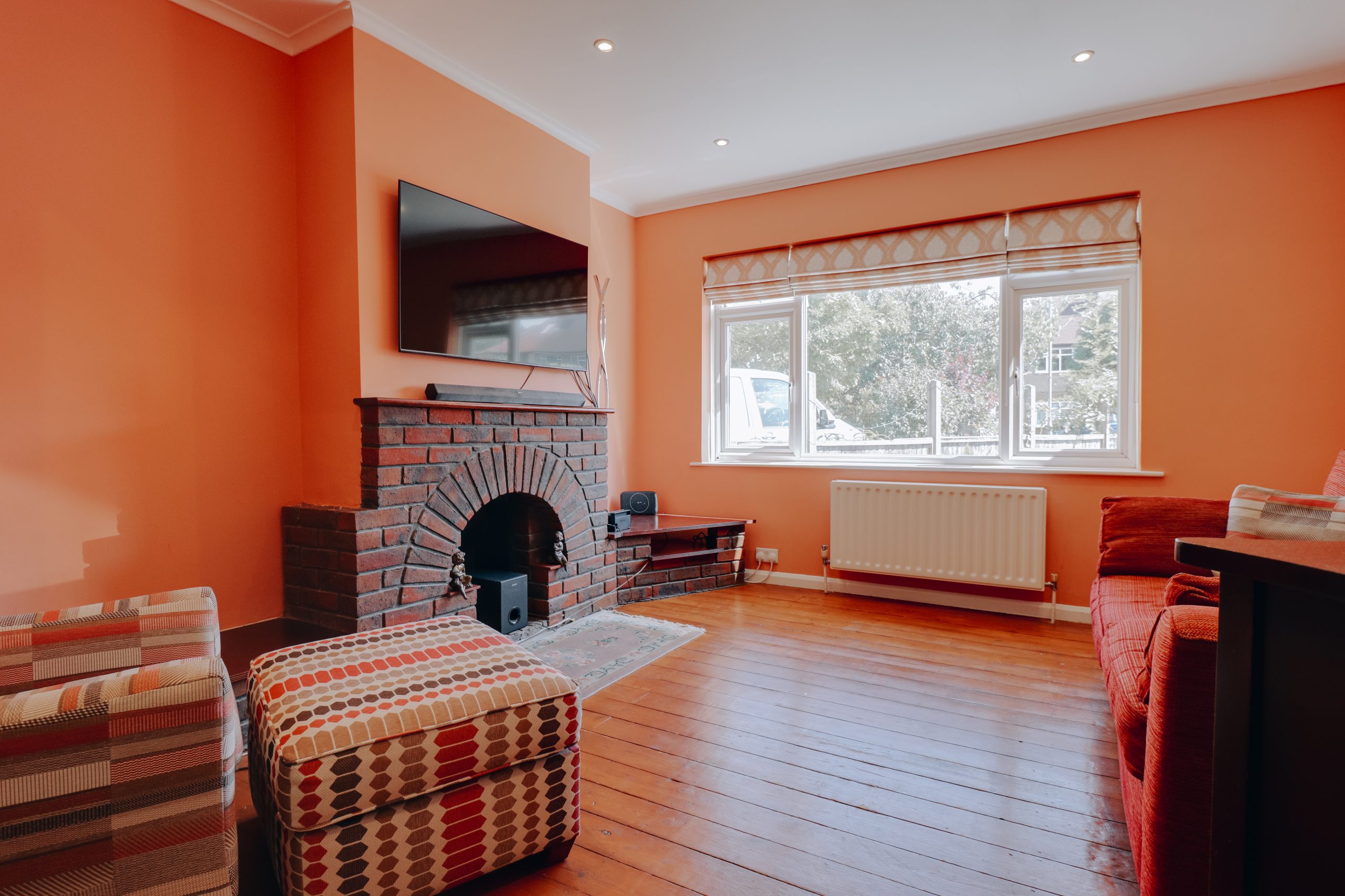 The home opens via a practical porch into a welcoming entrance hall, leading into the heart of the property - an impressive open-plan living and dining space measuring 23’5” x 12’2”. Originally two reception rooms, the layout has been opened up to create a seamless and versatile area ideal for modern living. Beautiful wood flooring, a striking chimney breast, and a large front window bring warmth and character, while internal sliding doors open onto a further reception area overlooking the garden, filling the space with natural light. Adjacent, a sleek, well-appointed kitchen offers ample cabinetry, generous worktop space, and integrated appliances.