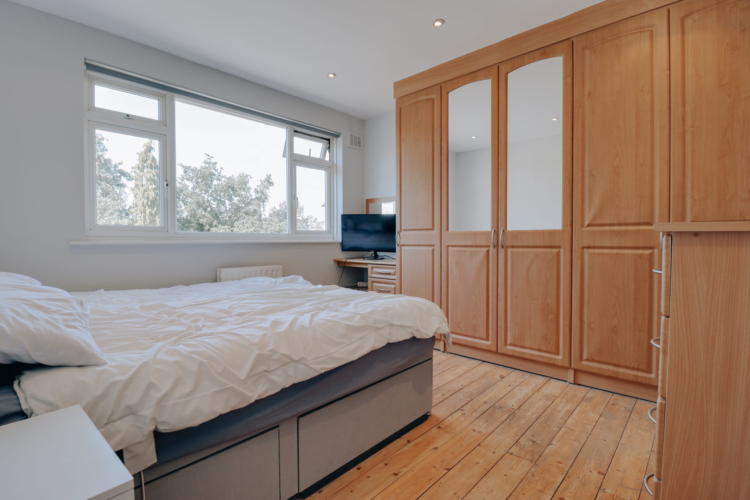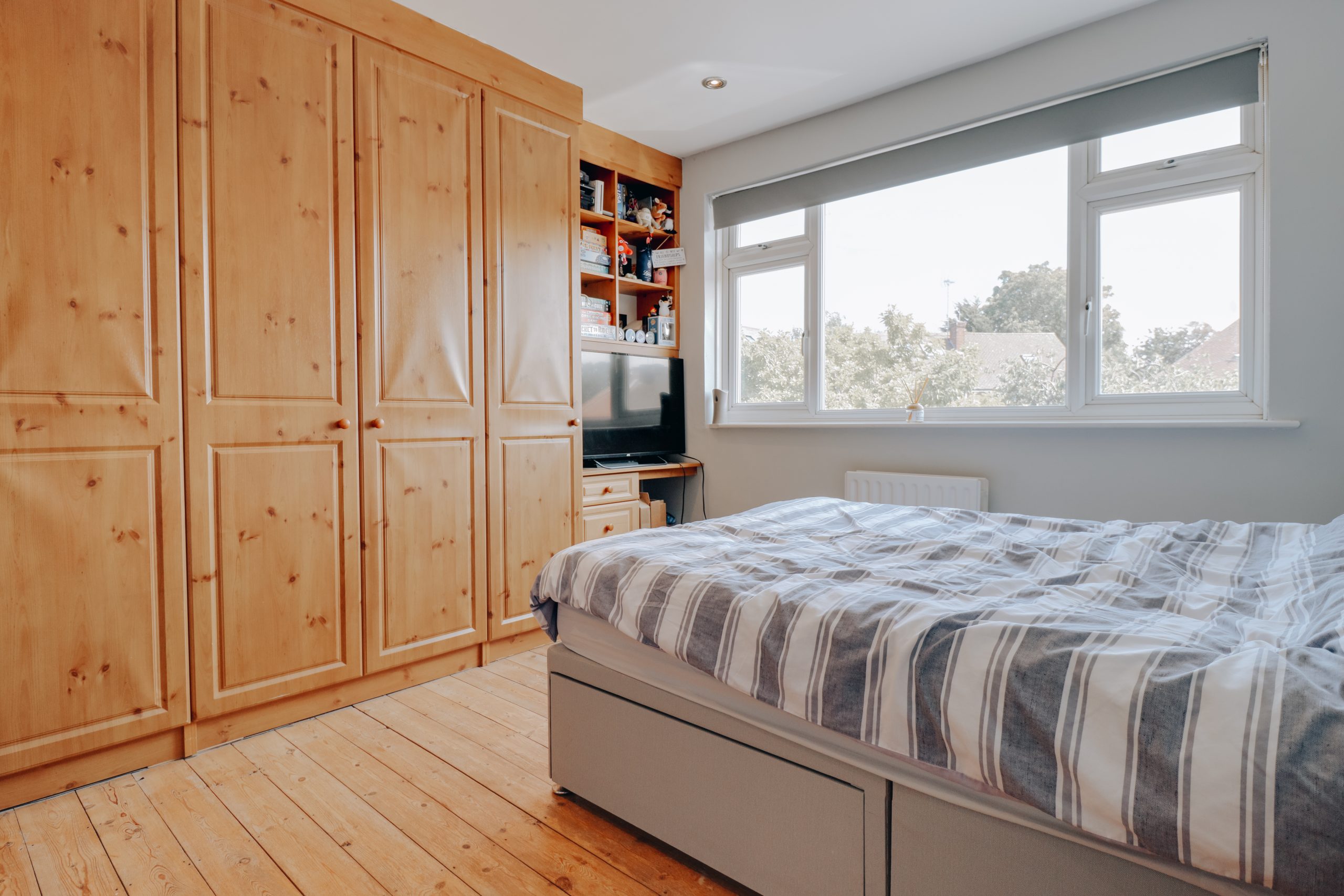 Upstairs, the first floor hosts three well-proportioned bedrooms. The principal bedroom (11’8” x 11’10”) is bright and spacious, finished in neutral tones with built-in storage. The second double bedroom matches in size and style, while the third bedroom serves perfectly as a single or home office. A family bathroom completes the upper floor.