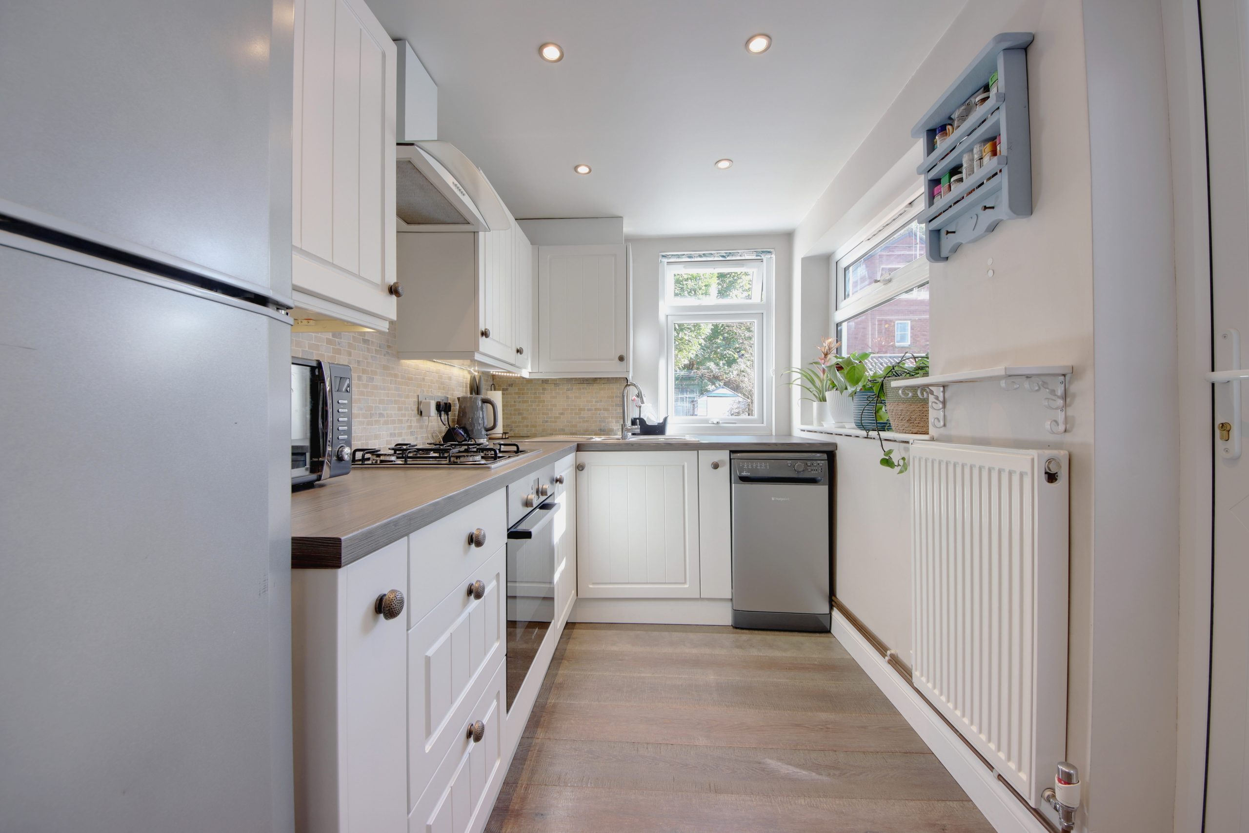 Upon entering, you are greeted by a spacious 27-foot open-plan living area that exudes tranquility. This inviting space, situated at the front of the home, is enhanced by a large south-facing window, flooding the room with natural light. The area has been thoughtfully divided to create distinct living and dining zones. At the rear, the galley-style kitchen features neutral surfaces and practical cabinetry, seamlessly integrating modern appliances and providing direct access to the secluded north-easterly facing rear garden.