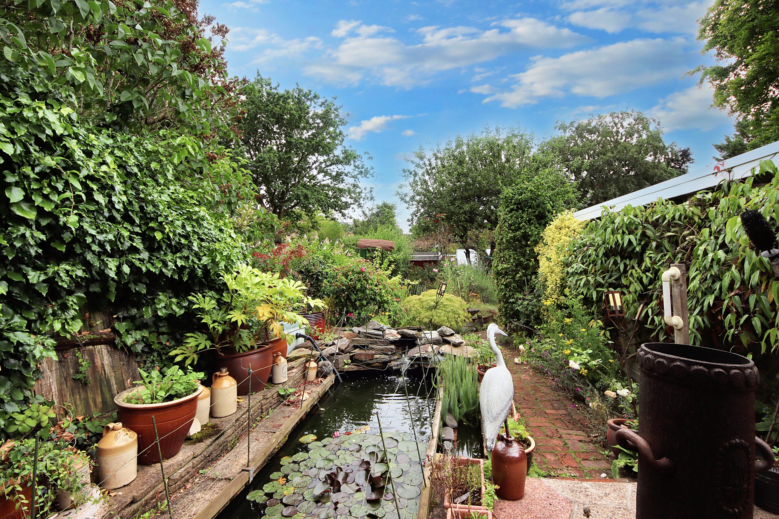 Extending from the rear of the house is a flourishing garden, perfect for outdoor dining and barbecues.