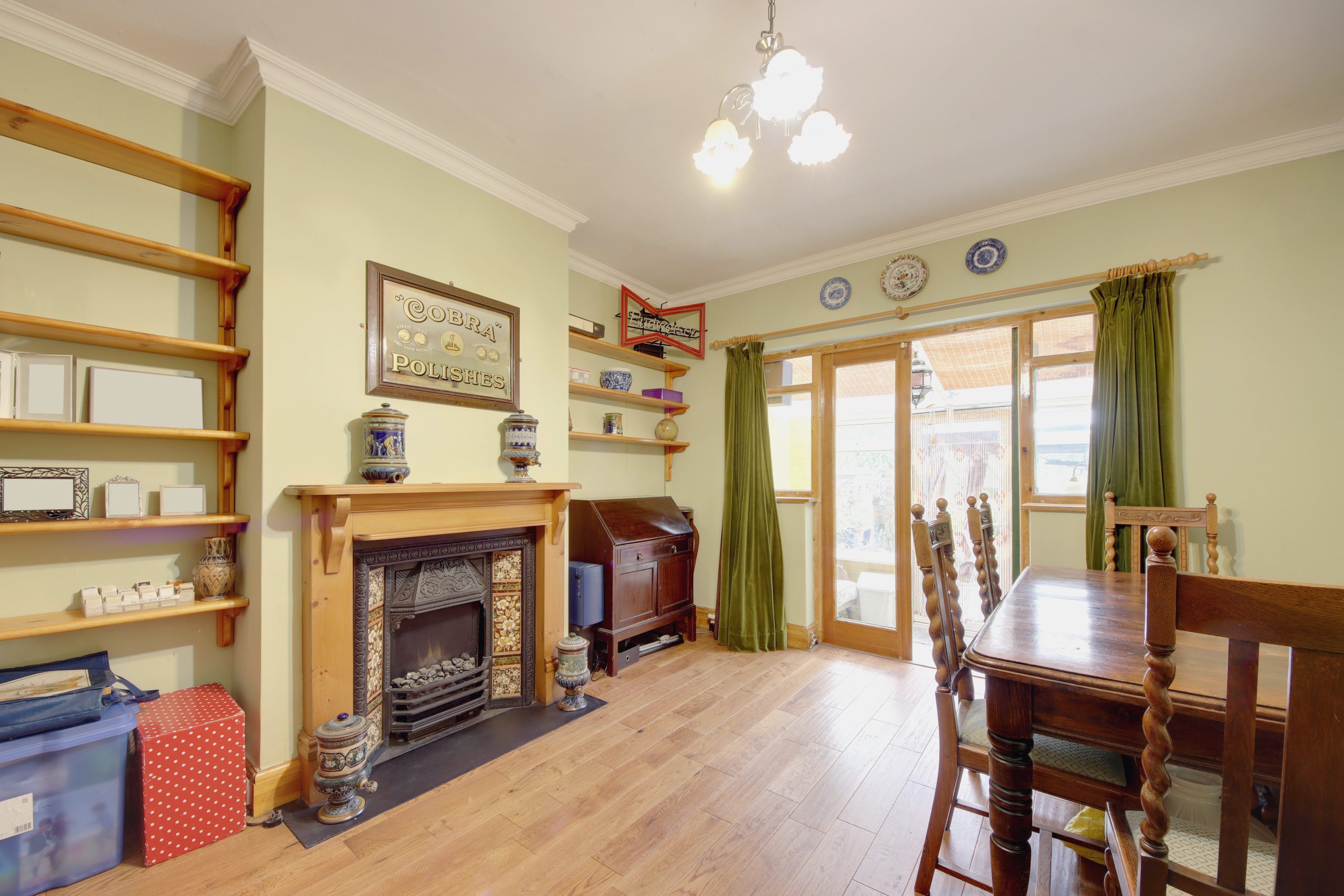 Upon entry, you're greeted by a spacious, sunlit hallway that leads to all ground floor living areas. To the left, a 15ft living room spans the front of the house, featuring a generous bay window, original cornicing, and a fully operational gas fireplace. At the rear, the dining room offers ample space for a large dining set and provides access to a useful conservatory, leading to the 100ft north-easterly facing garden through a single door. The kitchen, with neutral countertops, presents a comprehensive array of cabinetry and appliances strategically arranged for easy accessibility. A convenient W.C. completes the ground floor.
