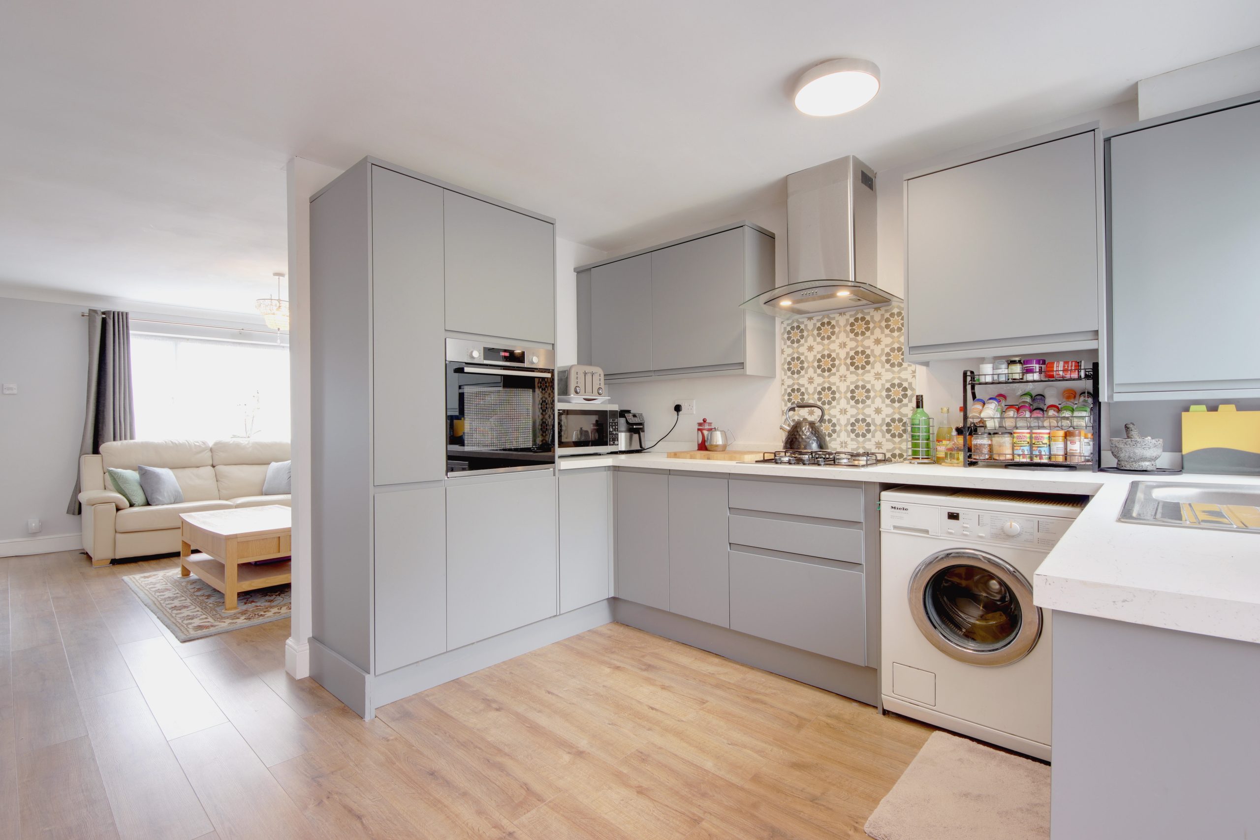 Upon entering through front door, you are greeted by a cozy porch, perfect for placing shoes and hanging coats. This area leads to the expansive ground floor living spaces. The open-plan kitchen, living, and dining area stretches an impressive 24’2”, created by the thoughtful removal of partition walls. Each space within this open layout shares a distinct theme; sage, floral wallpaper being the main source of colour, with wood-effect flooring underfoot, exuding warmth and coziness whilst also permitting modern living. Toward the rear, the spacious kitchen unfolds, showcasing sleek neutral surfaces and a comprehensive range of modern cabinetry designed for utmost convenience.