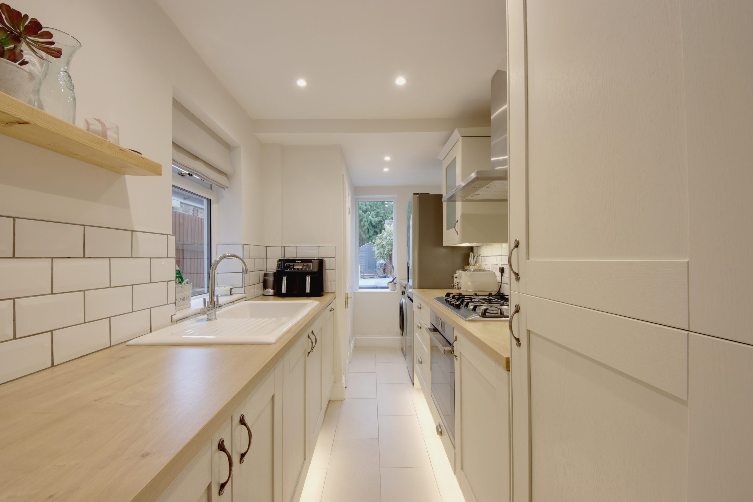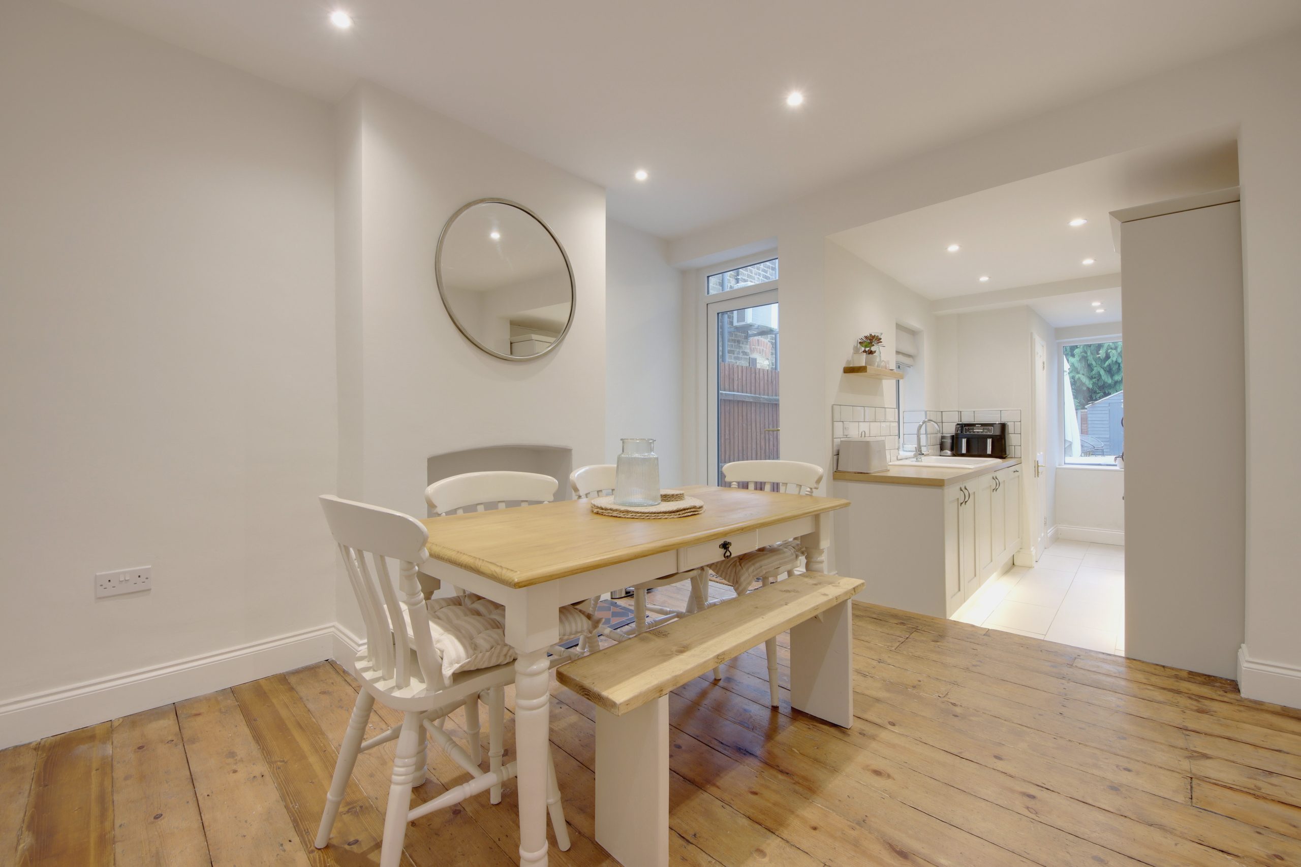 Upon entering, you are welcomed into a spacious open-plan living and dining area measuring an impressive 25’10” x 10’4”. This contemporary space showcases elegant original wood flooring and modern spotlights overhead. The living room features a charming open fireplace with exposed brick and renewed coving, while clever alcove storage maximises every inch of space. At the rear, the kitchen is accessible through the dining area which maintains a cohesive design, complemented by useful under stair storage and an additional fireplace. The kitchen itself is equipped with a full range of cabinetry and appliances, thoughtfully arranged for convenience and finished in a chic taupe palette with brushed chrome hardware and an arched tap. The ground floor also includes a practical W.C. and access to the north-westerly facing garden.