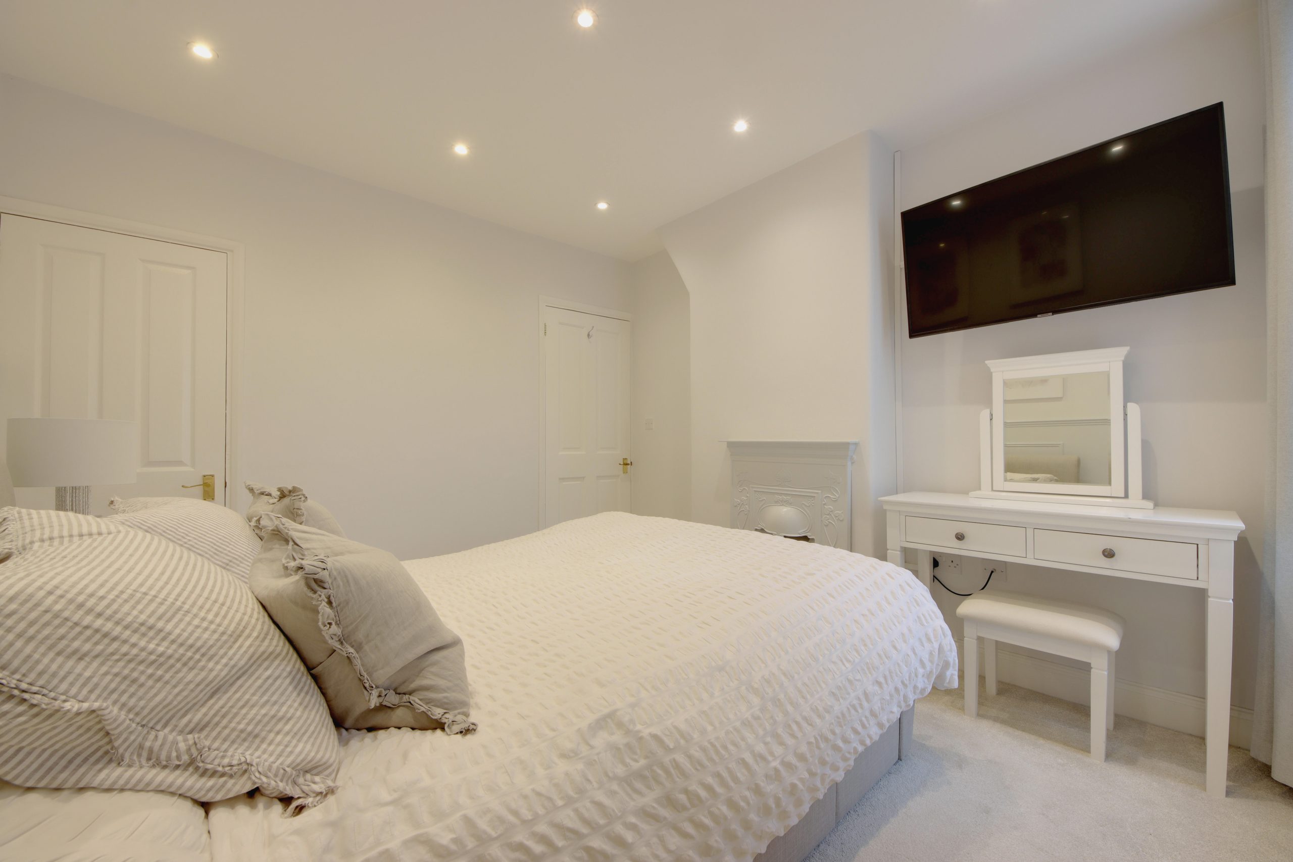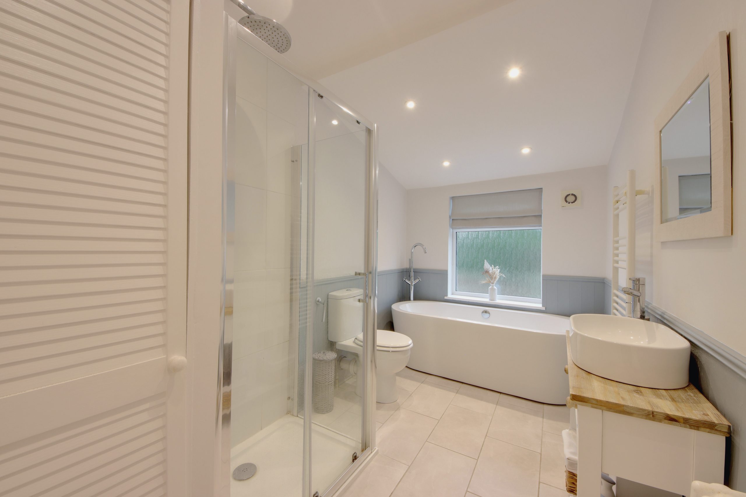 Upstairs, the first floor features two well-appointed bedrooms. The main bedroom boasts a large north-westerly-facing window that floods the space with natural light, extensive built-in cabinetry, and access to a meticulously designed family bathroom. This luxurious bathroom includes a walk-in shower enclosure, a vessel sink, and a freestanding bathtub, with pastel blue panelling that beautifully complements the property’s style.