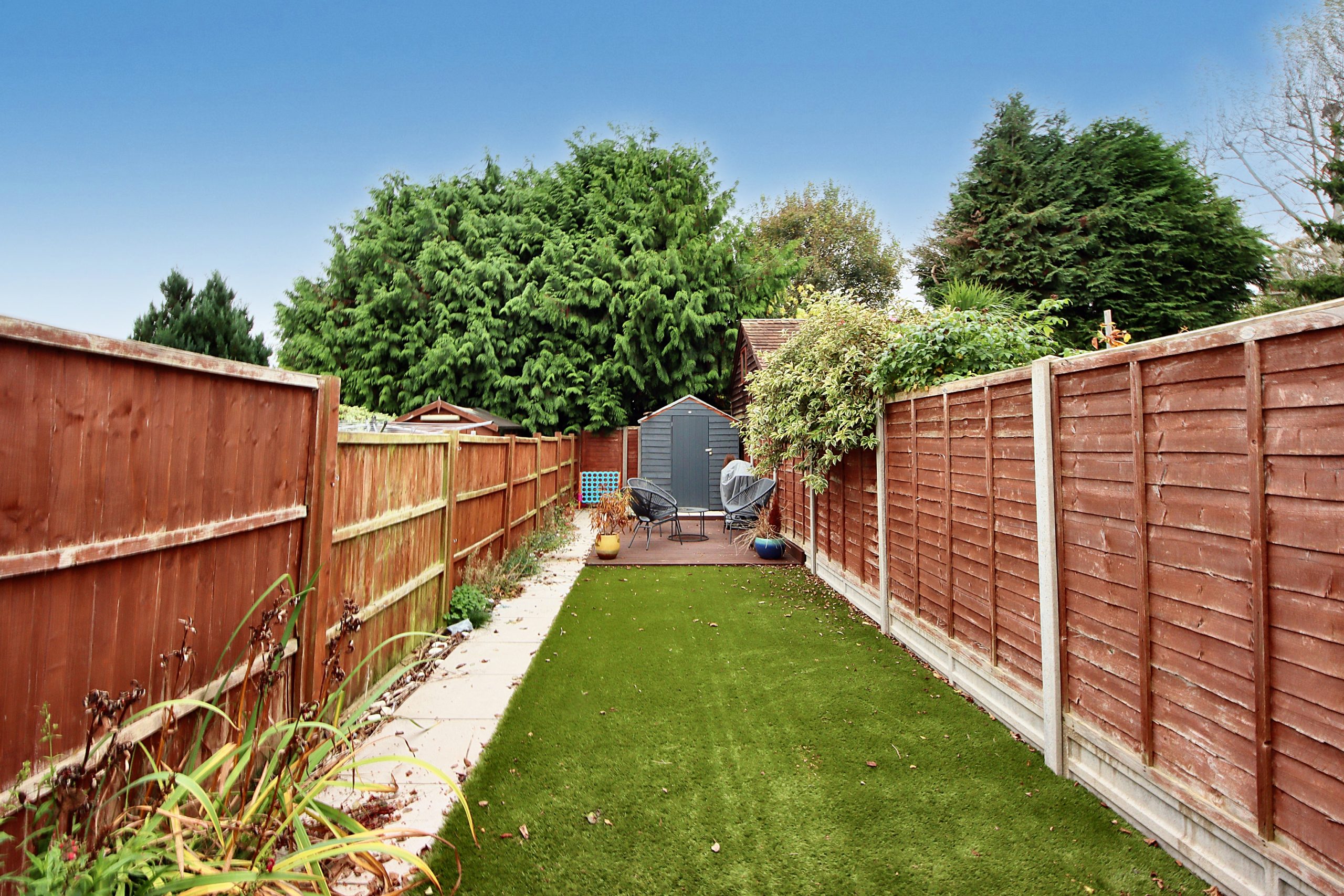 To the rear, the north-westerly facing garden extends seamlessly from the house, centred around a well-maintained artificial lawn - perfect for relaxation or entertaining.