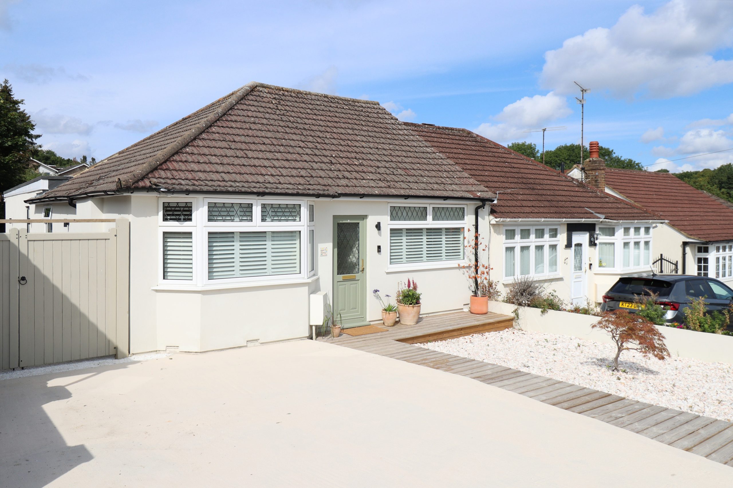 This exceptional three-bedroom semi-detached bungalow on The Courtway has been thoughtfully reimagined, blending its original character with a fresh, modern edge. Bought in a near-derelict state, the current owner has spent the past five years transforming it from the ground up - opening the layout, refining the details, and introducing a natural palette accented with soft pastel tones. Subtle Scandinavian influences run throughout, from the panelled kitchen island to the crittal-style glazing at the rear, creating a home that feels both stylish and inviting at once.