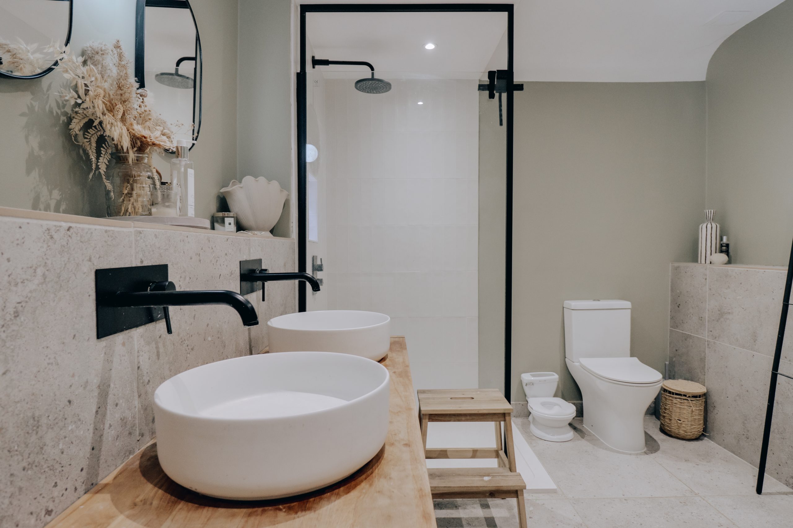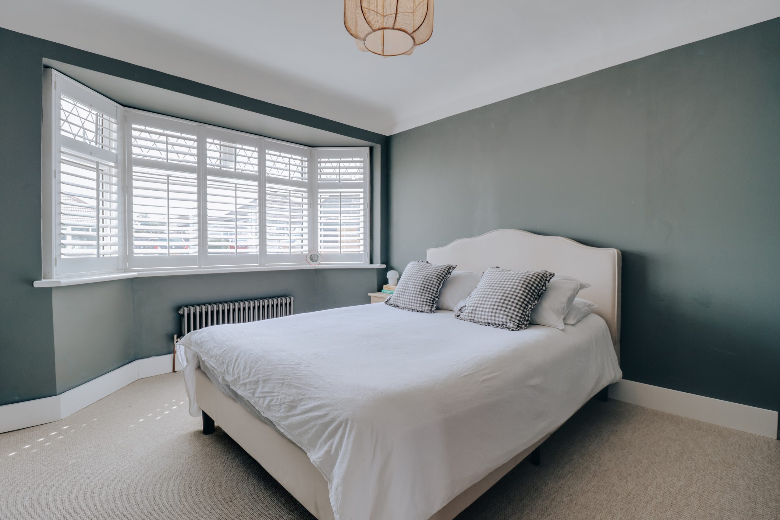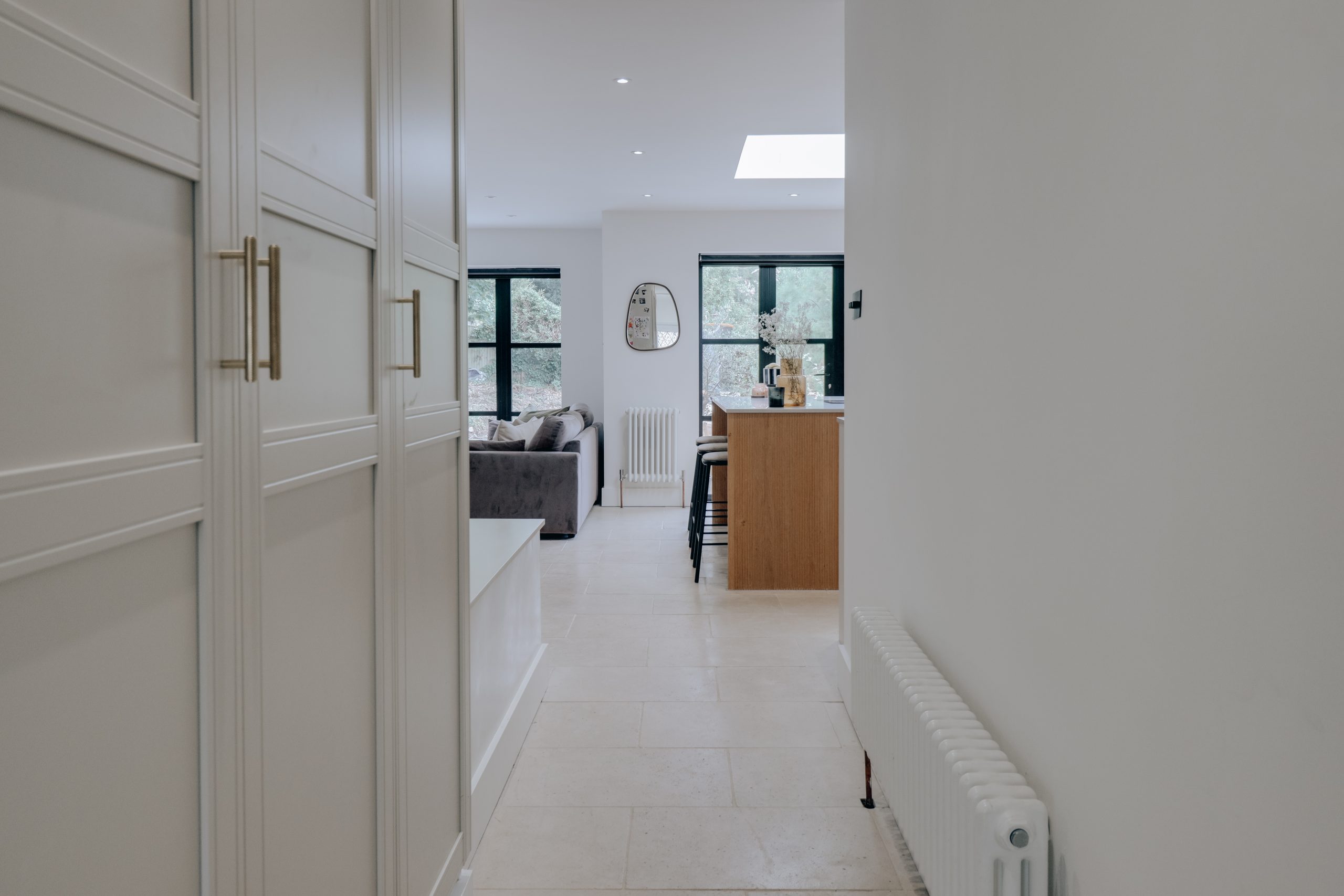 Step inside and the tone is set immediately - a wide, welcoming hallway acts as the home’s central artery, from which each meticulously crafted space flows. To the right, a generous second bedroom (11’11” x 10’2”) mirrors the home’s exceptional finish, with a soft neutral palette, bespoke shutters and sleek inbuilt cabinetry running the length of one wall. It could easily serve as the principal suite, its only difference being the bay window opposite. That’s the beauty of bungalow living - the layout is entirely adaptable to your lifestyle. Across the hall, the master bedroom exudes a moodier elegance, with the same bespoke detailing but wrapped in deep navy-grey tones for a striking, cocoon-like feel. The rear of the property is devoted to a spectacular open-plan kitchen, living, and dining area - a light-filled, 32ft-wide showpiece designed for entertaining. Here, expansive crittal-style glazing, twin sets of double doors, and a central skylight flood the space with natural light, complemented by adjustable spotlights for evening ambience. The kitchen itself is a masterclass in form meeting function, with a panelled island providing casual seating and cabinetry concealing a suite of premium, carefully curated appliances. The sense of considered design continues into the family bathroom, where his-and-hers sinks, a walk-in shower with black-framed glazing, and a freestanding tub sit against a backdrop of oversized neutral tiles and sage-green walls - an indulgent retreat with a refined, contemporary edge.