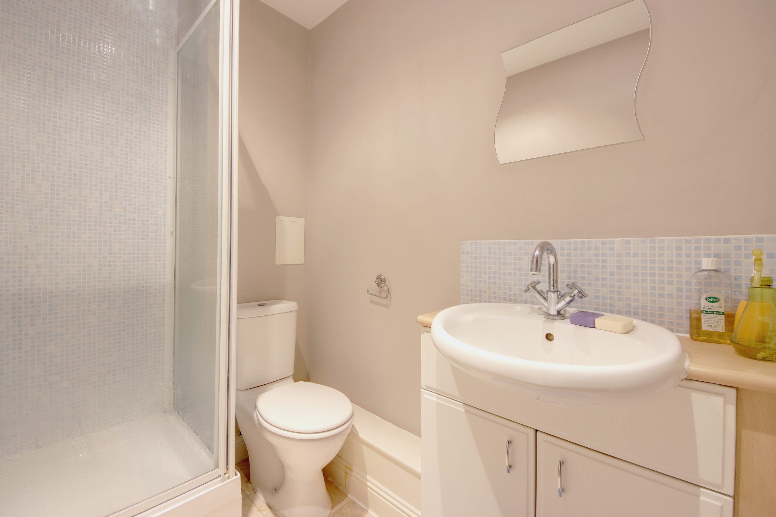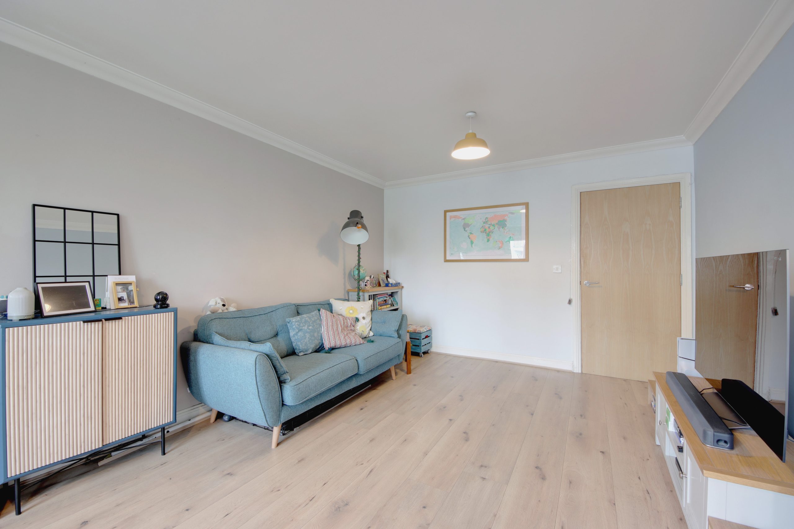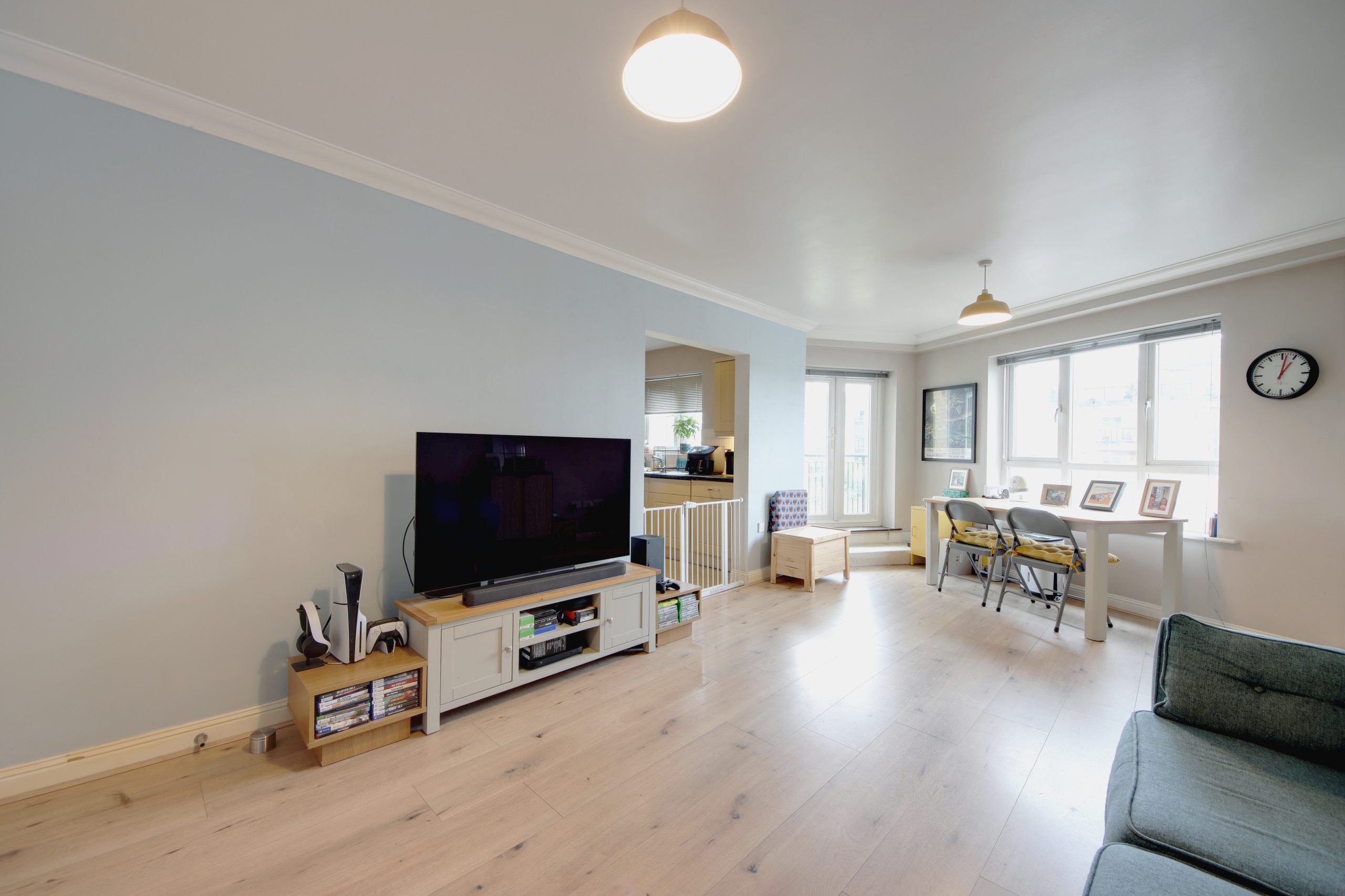 The primary bedroom is a standout, measuring a generous 16 feet and equipped with an additional balcony, dual-aspect windows, and an en-suite shower room. Completing the property is a stylish family bathroom with floor-to-ceiling neutral tiles and an 11-foot second bedroom with ample in-built cabinetry.