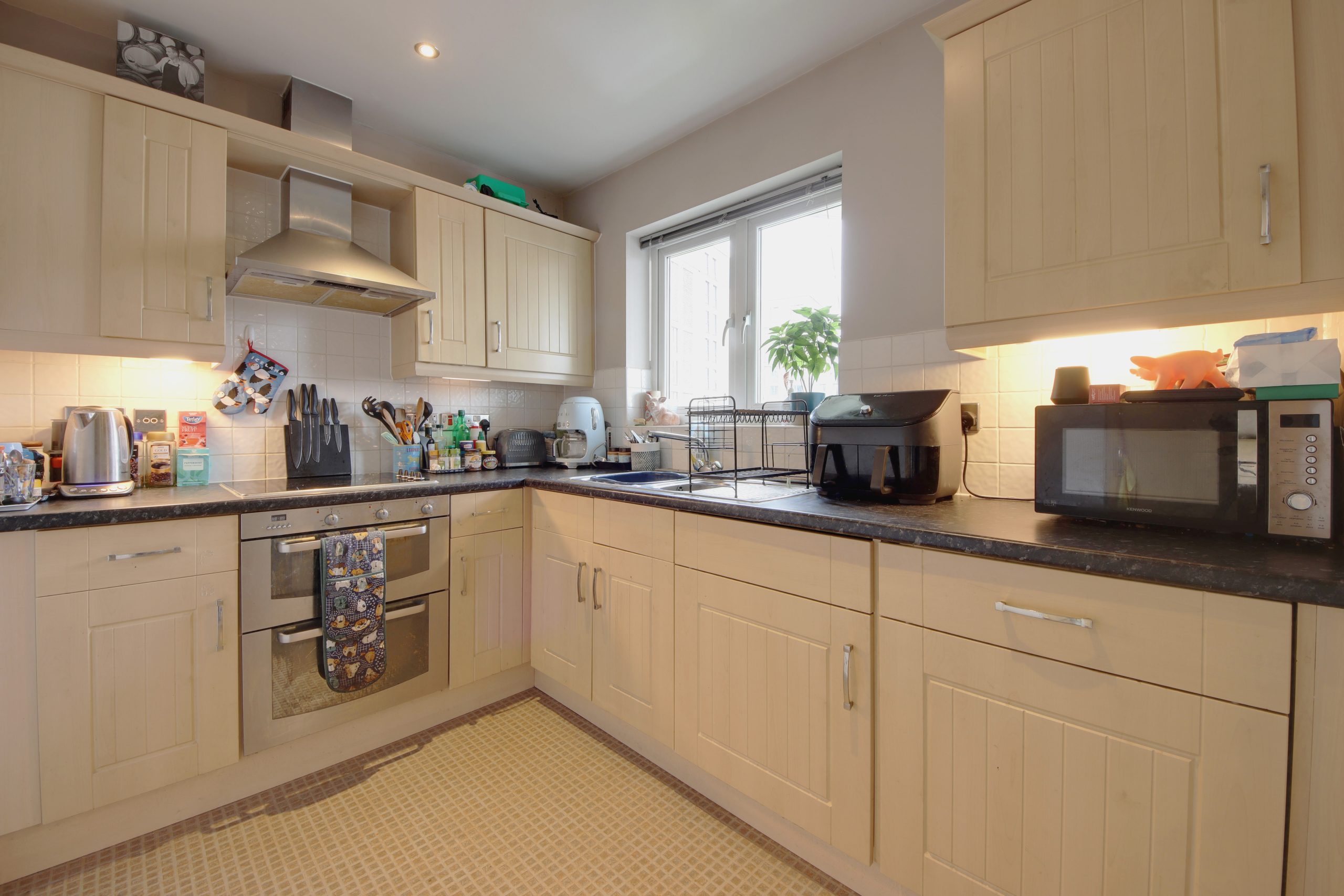 Upon entering the residence, you are immediately greeted by a spacious hallway providing direct access to every room. To the right, the open-plan living room and kitchen are seamlessly integrated, featuring white uPVC French doors and expansive windows that flood the space with sunlight. The kitchen boasts sleek black laminate worktops with an integrated induction hob, ample storage above and below, and appliances discreetly housed within neutral cabinetry. This thoughtful layout is perfect for entertaining, creating a seamless flow throughout the apartment.