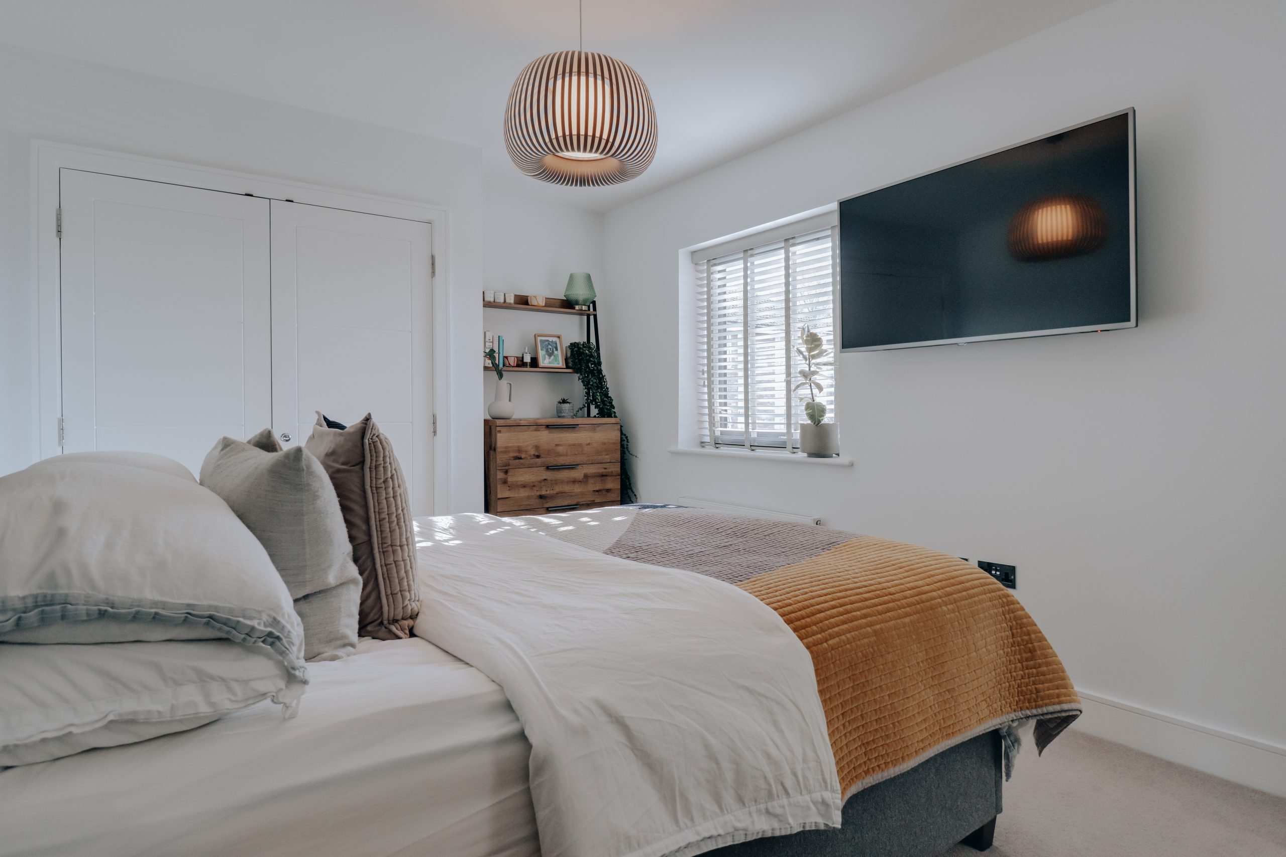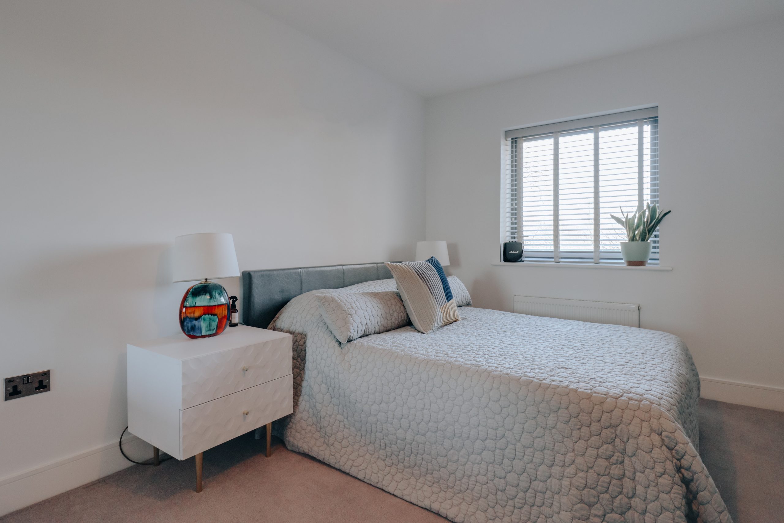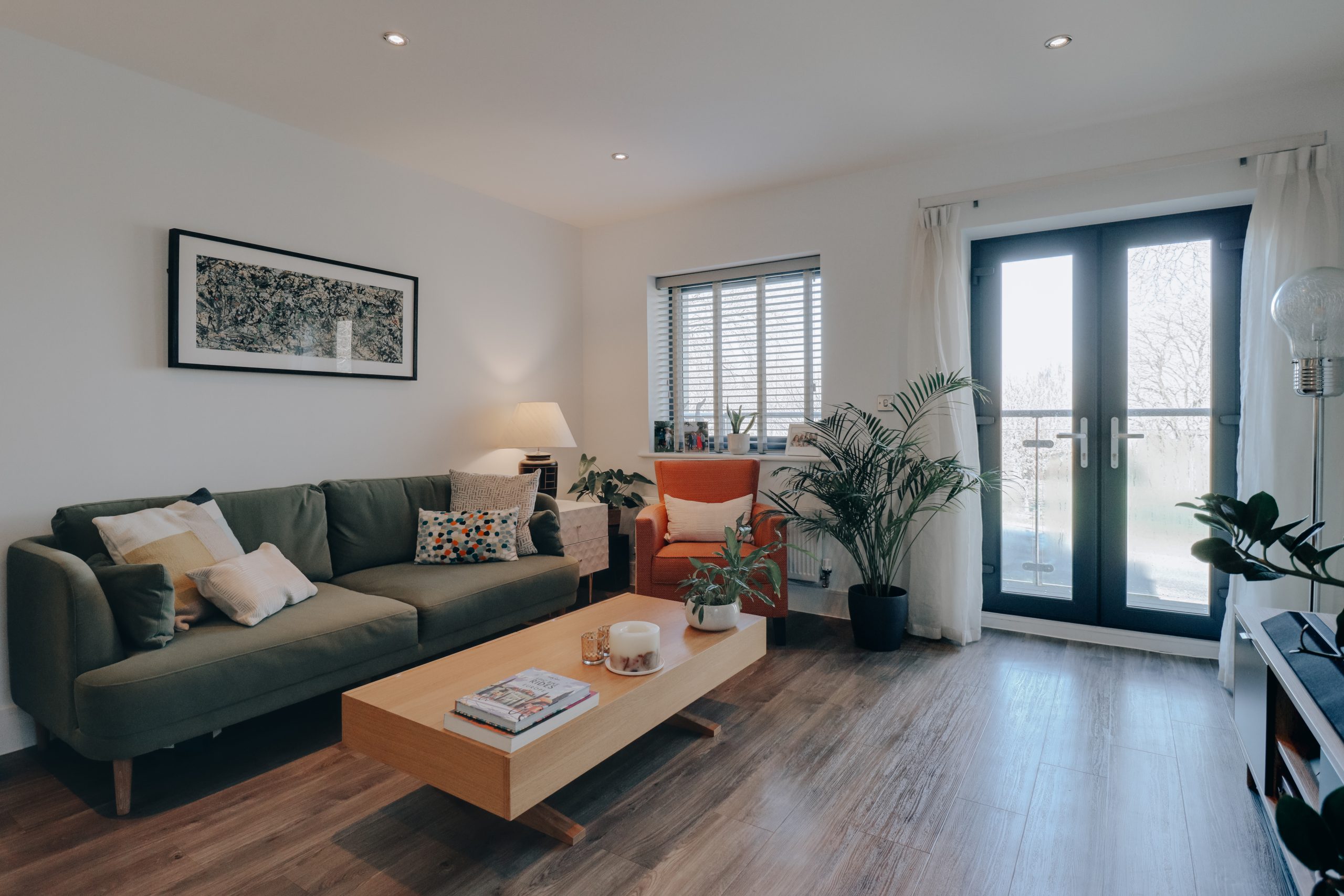 Upon entering the property, you're immediately greeted by a spacious entrance hallway, thoughtfully designed to offer ample space for storing shoes, hanging coats and providing seamless access to all rooms. Directly ahead, the heart of the home awaits - a spectacular 22’10” x 12’8” open-plan living space. The contemporary kitchen takes centre stage, showcasing grey quartz worktops and meticulously crafted J-pull cabinetry in a chic contrast of neutral cream tones and tall, sleek, dark grey units. These cabinets cleverly conceal integrated appliances, including a full-height fridge/freezer, washing machine, dishwasher, oven, and microwave, ensuring a seamless, streamlined aesthetic. A standout feature is the breakfast bar, equipped with an induction hob and designed to be both a functional cooking space and an inviting dining area, complete with a recessed spot for stools. The living area, bathed in natural light through expansive glazing, offers stunning views over the surrounding woodland, creating the perfect backdrop.