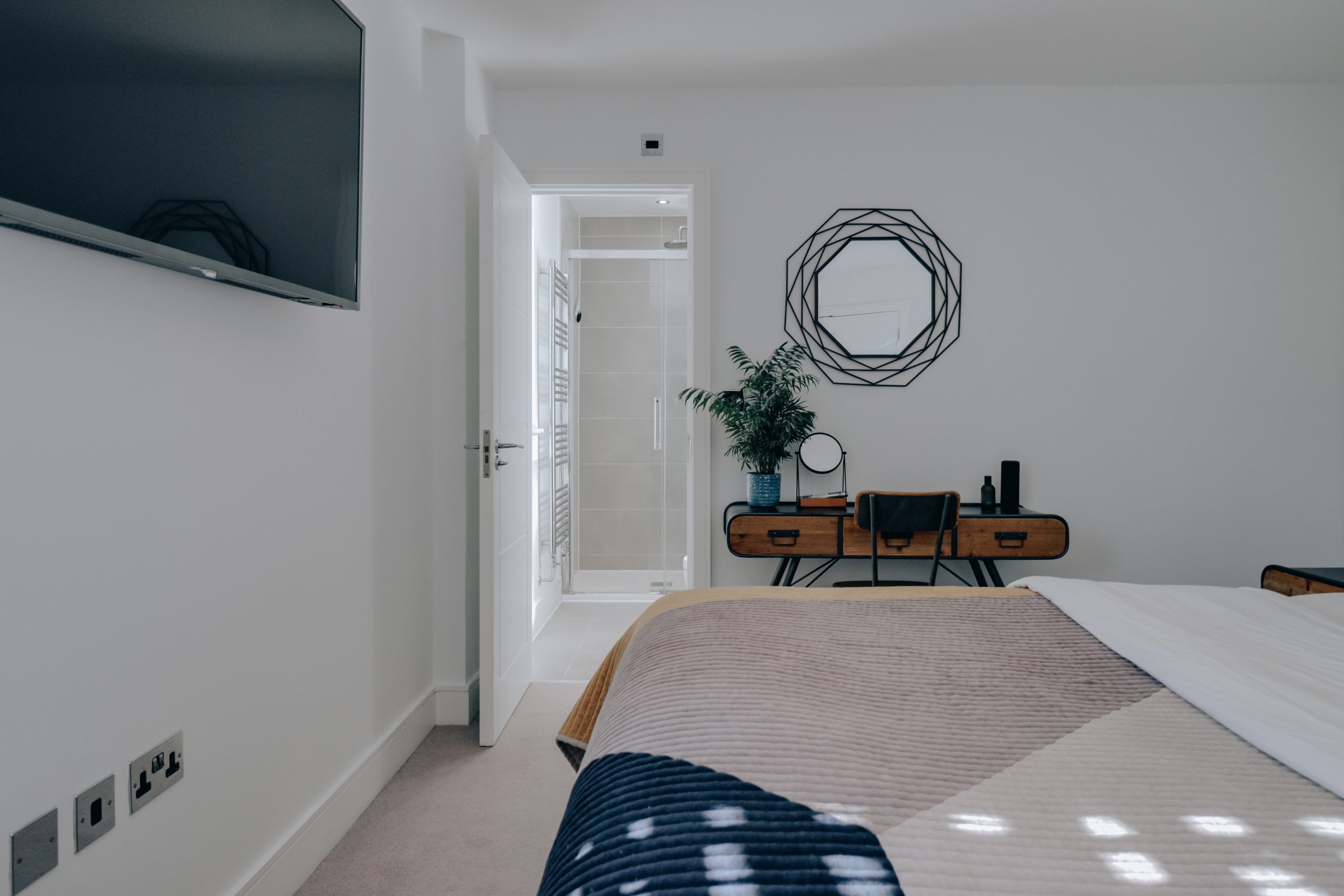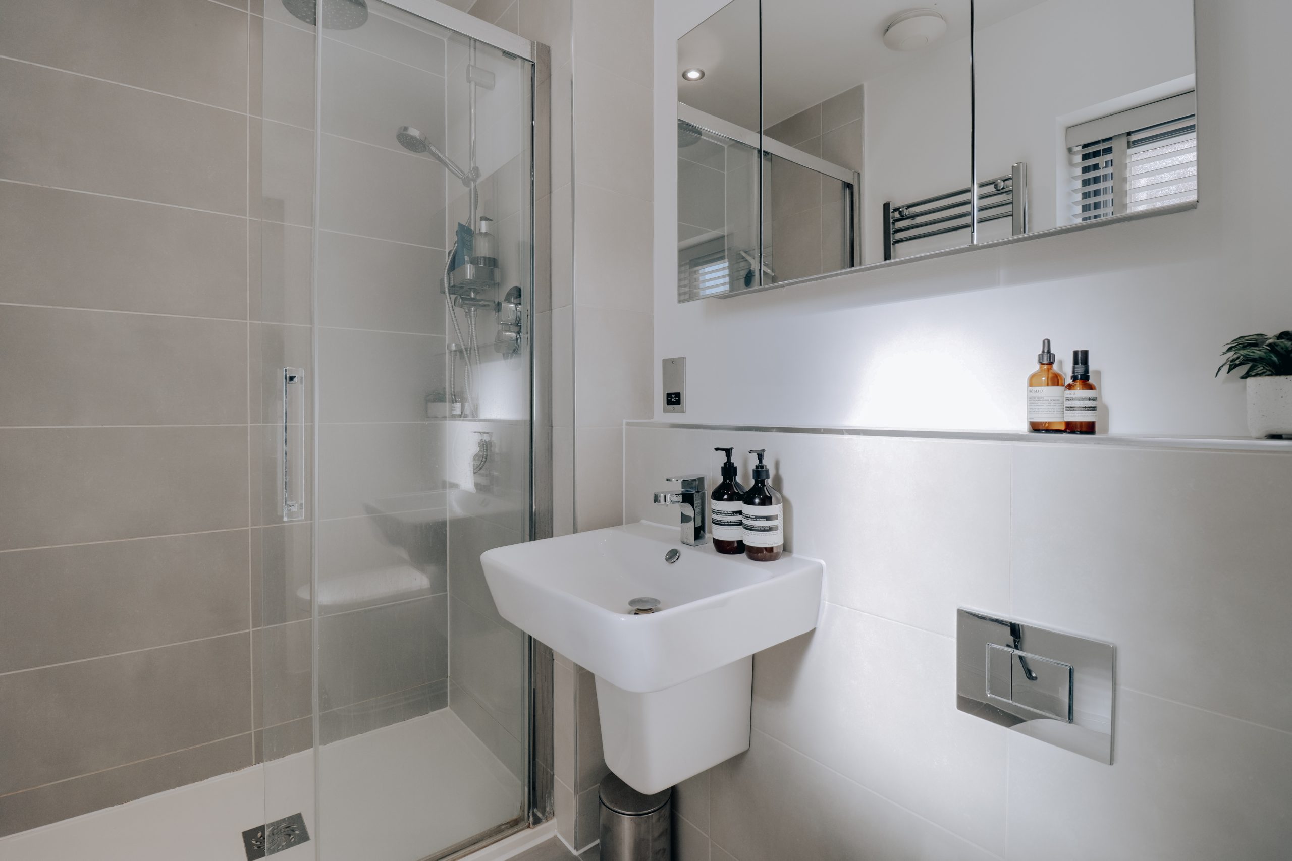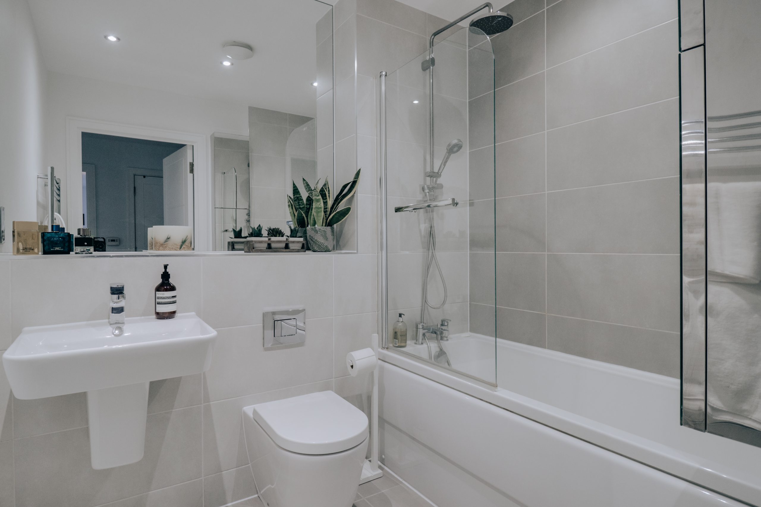 The property also boasts two generously sized bedrooms, each offering its own distinct charm. The principal bedroom is a true retreat, featuring a contemporary en-suite shower room and in-built cabinetry that maximises storage without compromising on space. Large windows flood the room with natural light, creating a bright and airy atmosphere. The second bedroom, which measures at an impressive 15 feet, continues the apartment's aesthetic and offers ample space for freestanding furniture, making it ideal for guests or a home office. Completing the floorplan is a luxurious family bathroom, beautifully finished with neutral tiles and a sleek bathtub, complemented by a rainfall shower head.