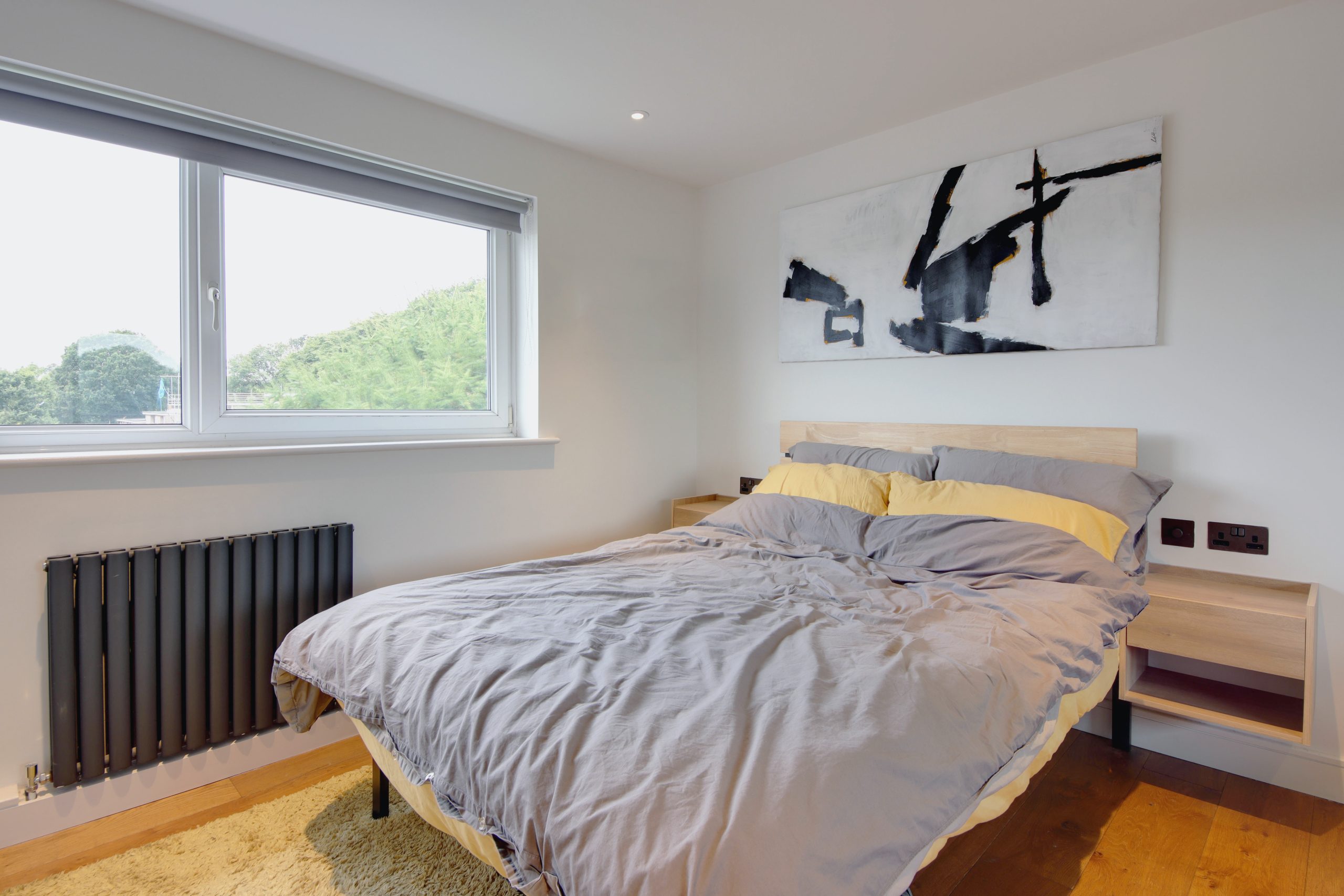 The property also includes two generously sized bedrooms. The principal bedroom is brightened by large windows that fill the room with sunlight, while the second bedroom, measuring a substantial 10 feet, continues the apartment’s stylish theme and offers built-in cabinets alongside plenty of space for additional furniture. Completing the layout is a modern family bathroom, elegantly finished with neutral tiles, a bathtub, and a contemporary walk-in shower enclosure.