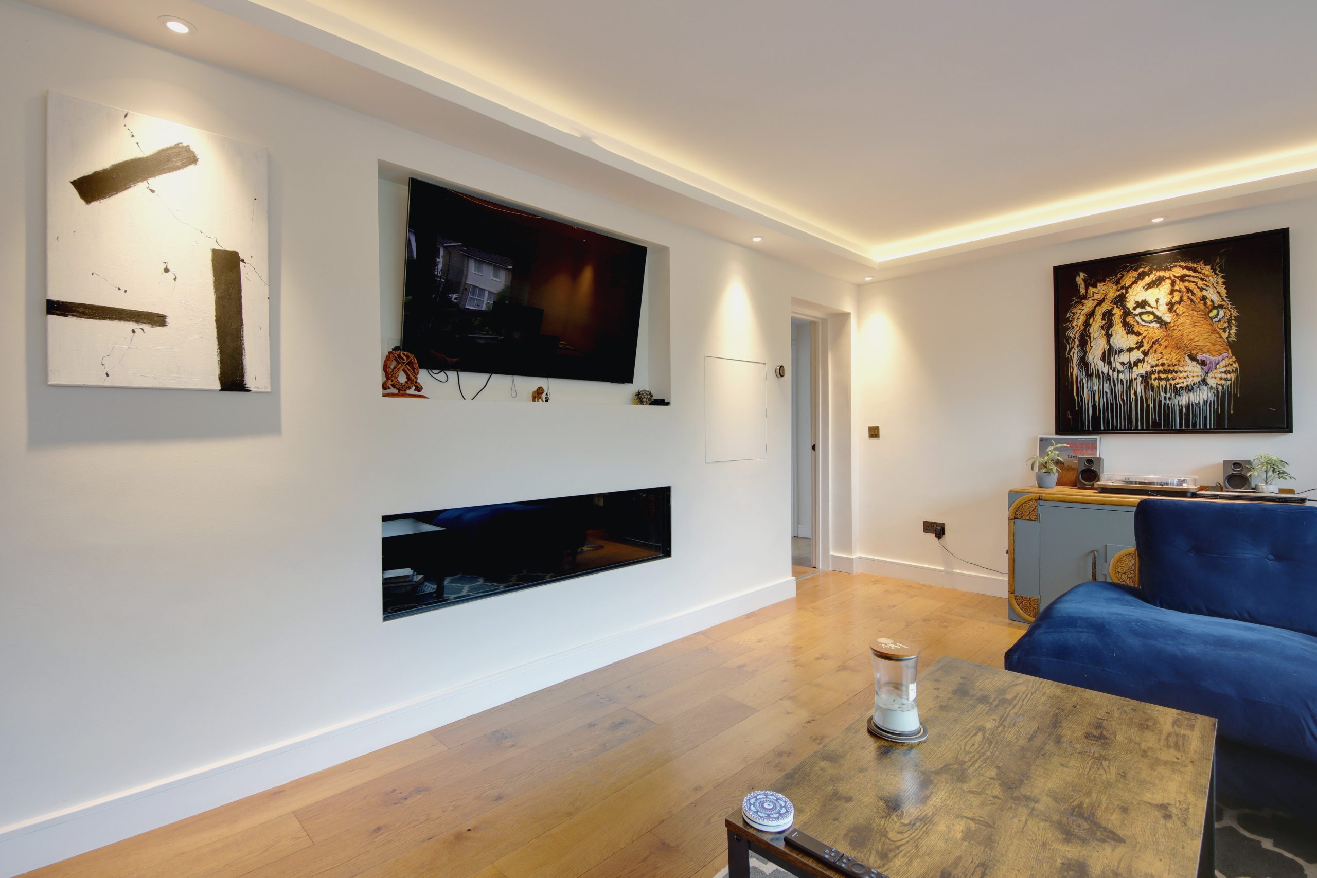 Upon entering the property, you're welcomed by a cozy entrance hallway, ideal for storing shoes and hanging coats. The hallway provides access to an east-facing private balcony and a practical utility room housing a combination boiler. To the left of the hallway, a contemporary kitchen features a sleek black quartz worktop and neutral J-pull cabinetry, cleverly concealing appliances such as a full-height fridge/freezer, washing machine, dishwasher, oven, and microwave. The kitchen is anchored by a striking island, equipped with an induction hob and designed as a perfect dining space, with a recessed area for stools. The impressive 21-foot reception room is flooded with natural light through large windows, offering stunning views of the surrounding area. With ample space for a large dining table and chairs, it’s an ideal setting for entertaining guests.