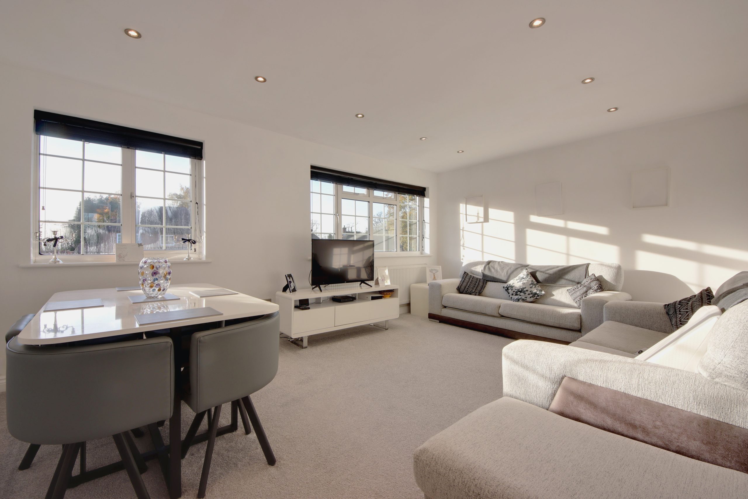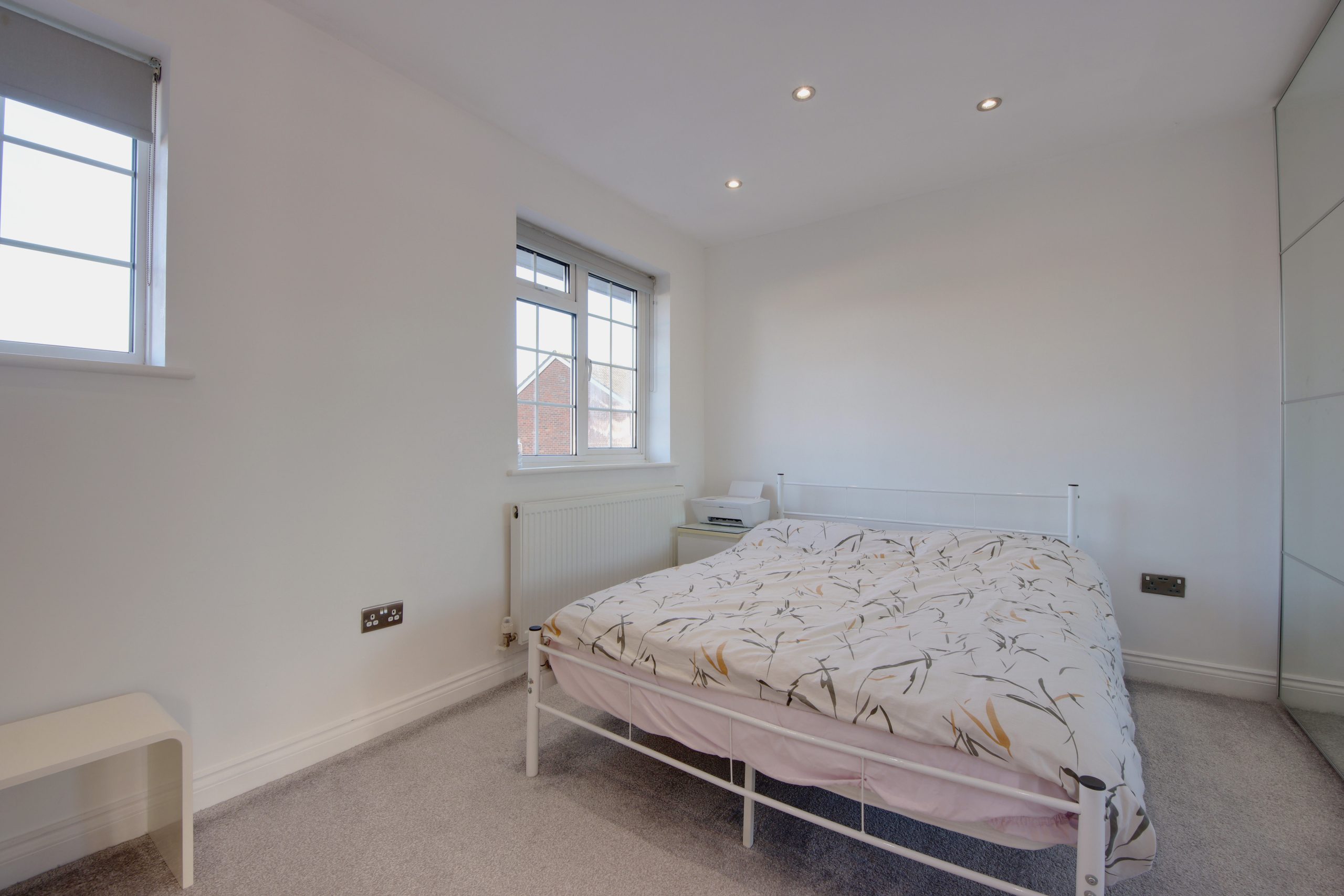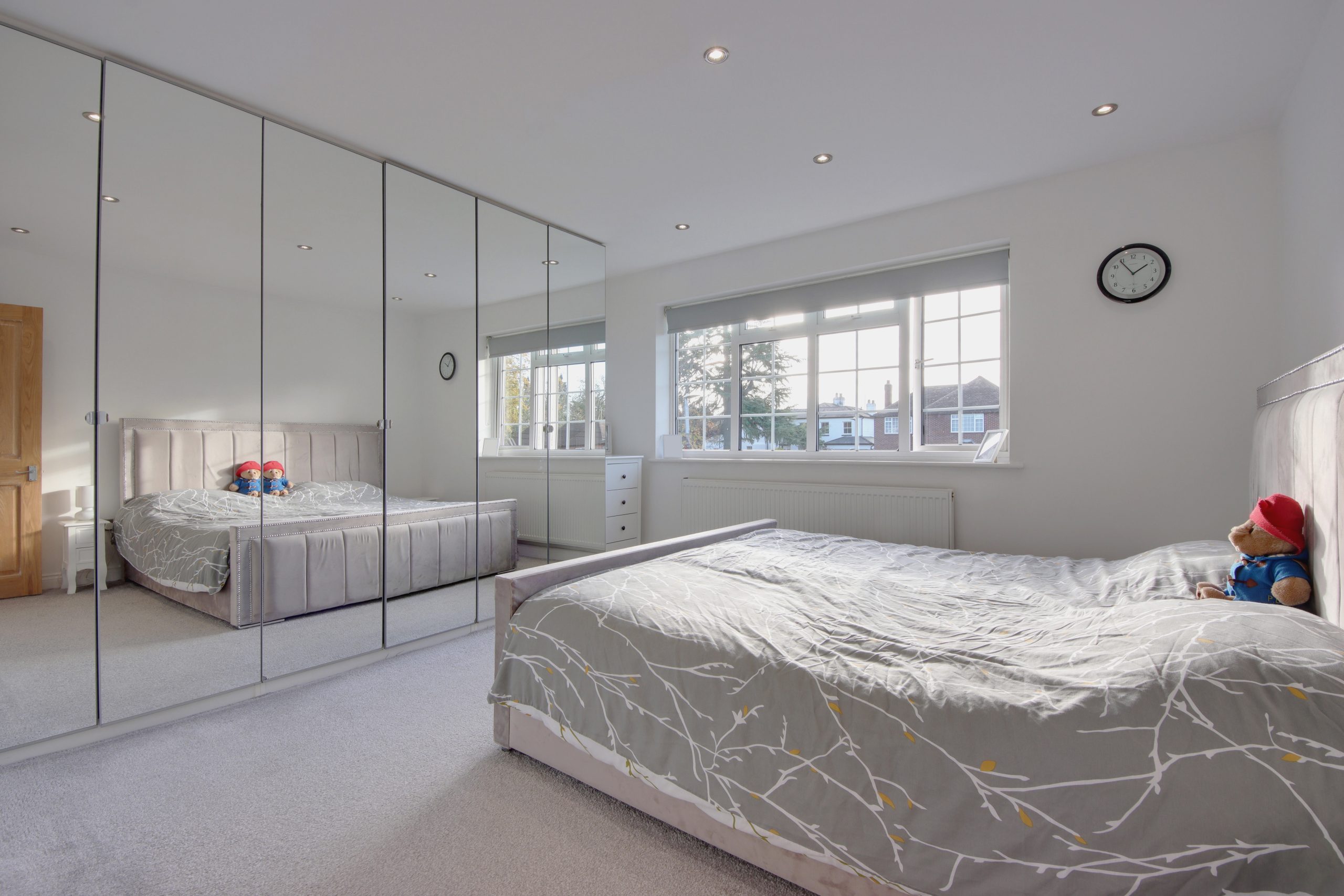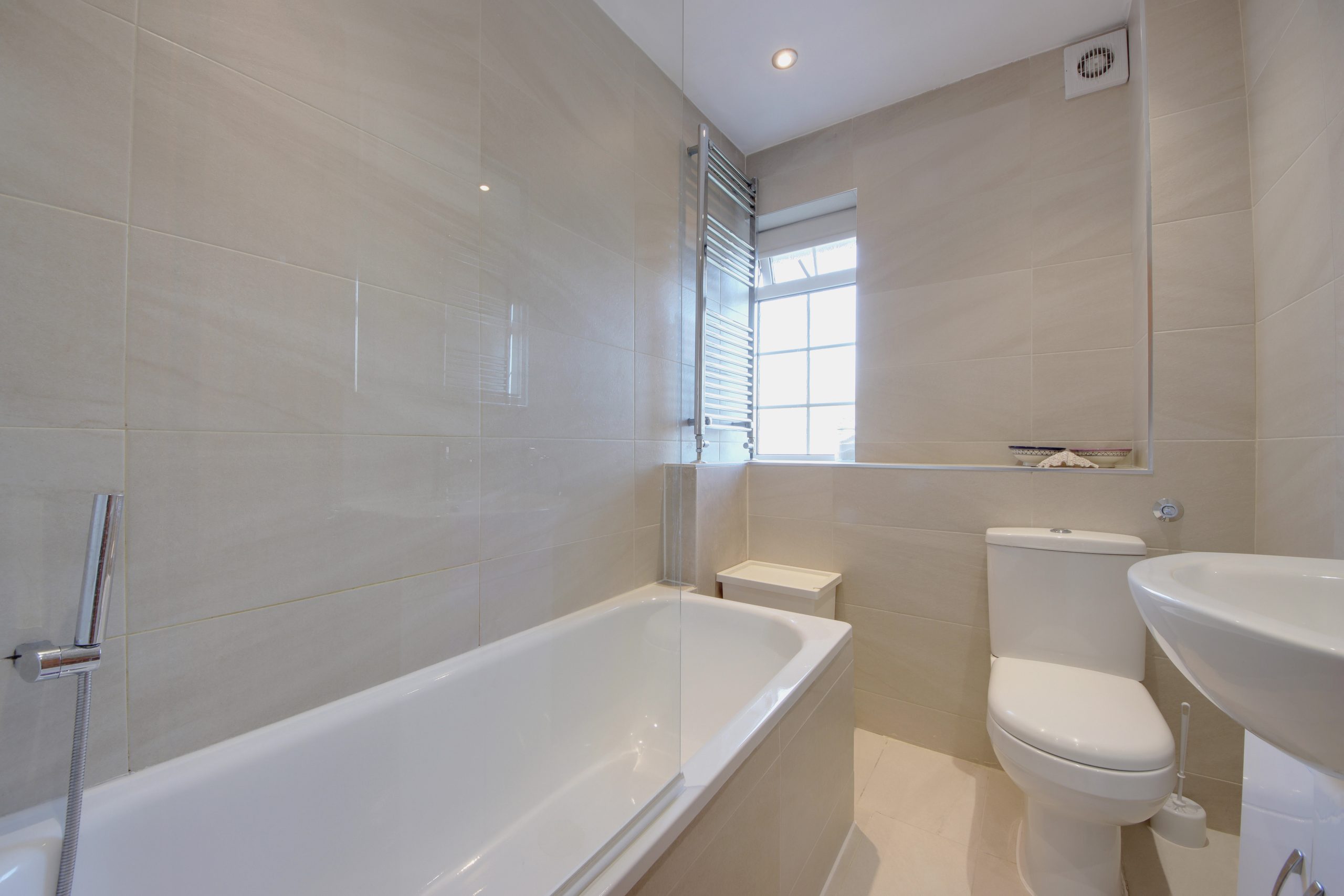 The large main bedroom is bathed in sunlight from large windows, and offers space for a super king bed with ample remaining room for freestanding furniture. A row of built-in cabinetry along the far wall provides additional storage. The second bedroom is equally well-proportioned, easily fitting a double bed, and like the main bedroom, it benefits from built-in storage. Completing the accommodation is a modern family bathroom, beautifully finished with floor-to-ceiling neutral tiling, offering a clean, contemporary feel throughout.