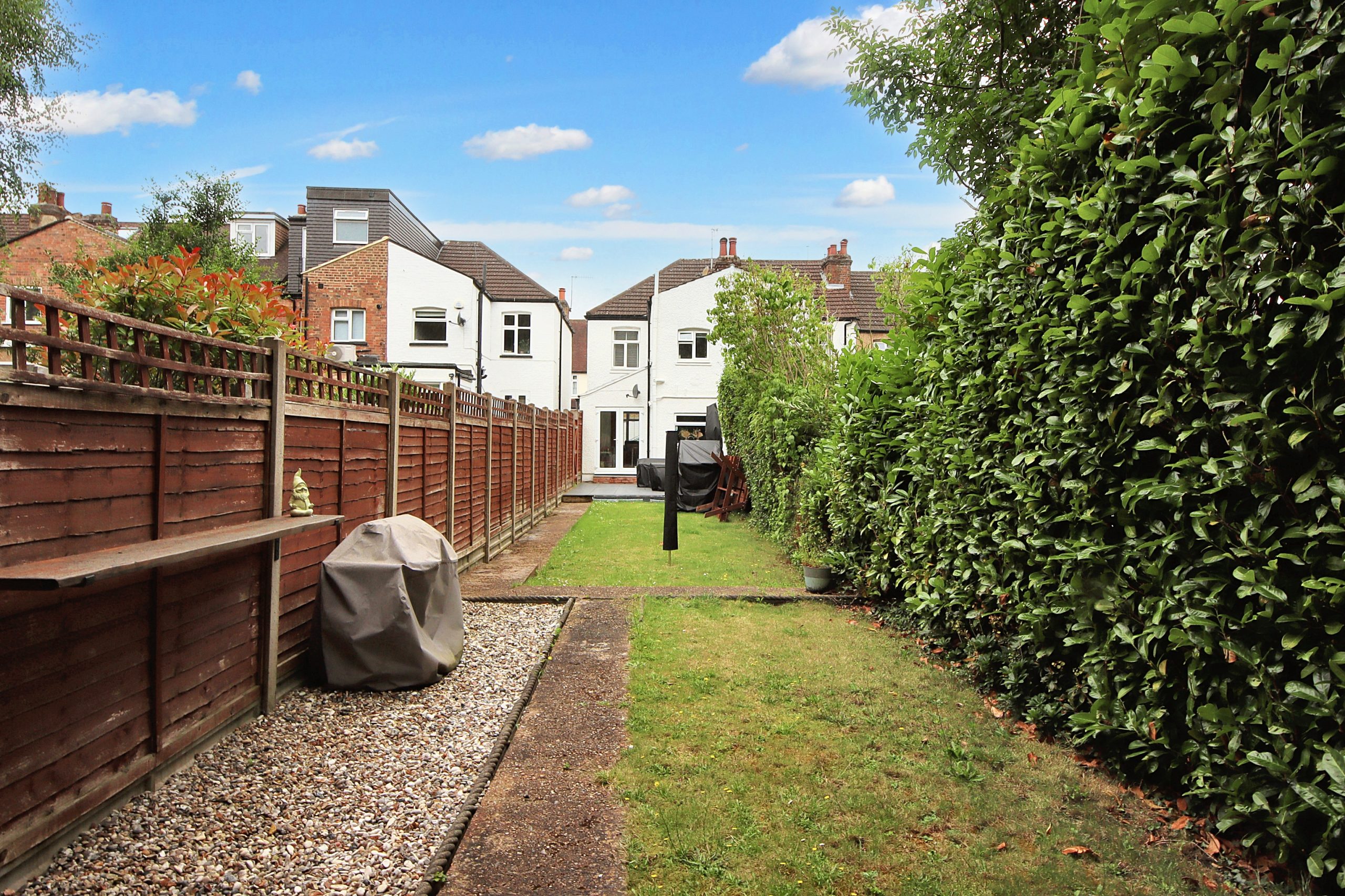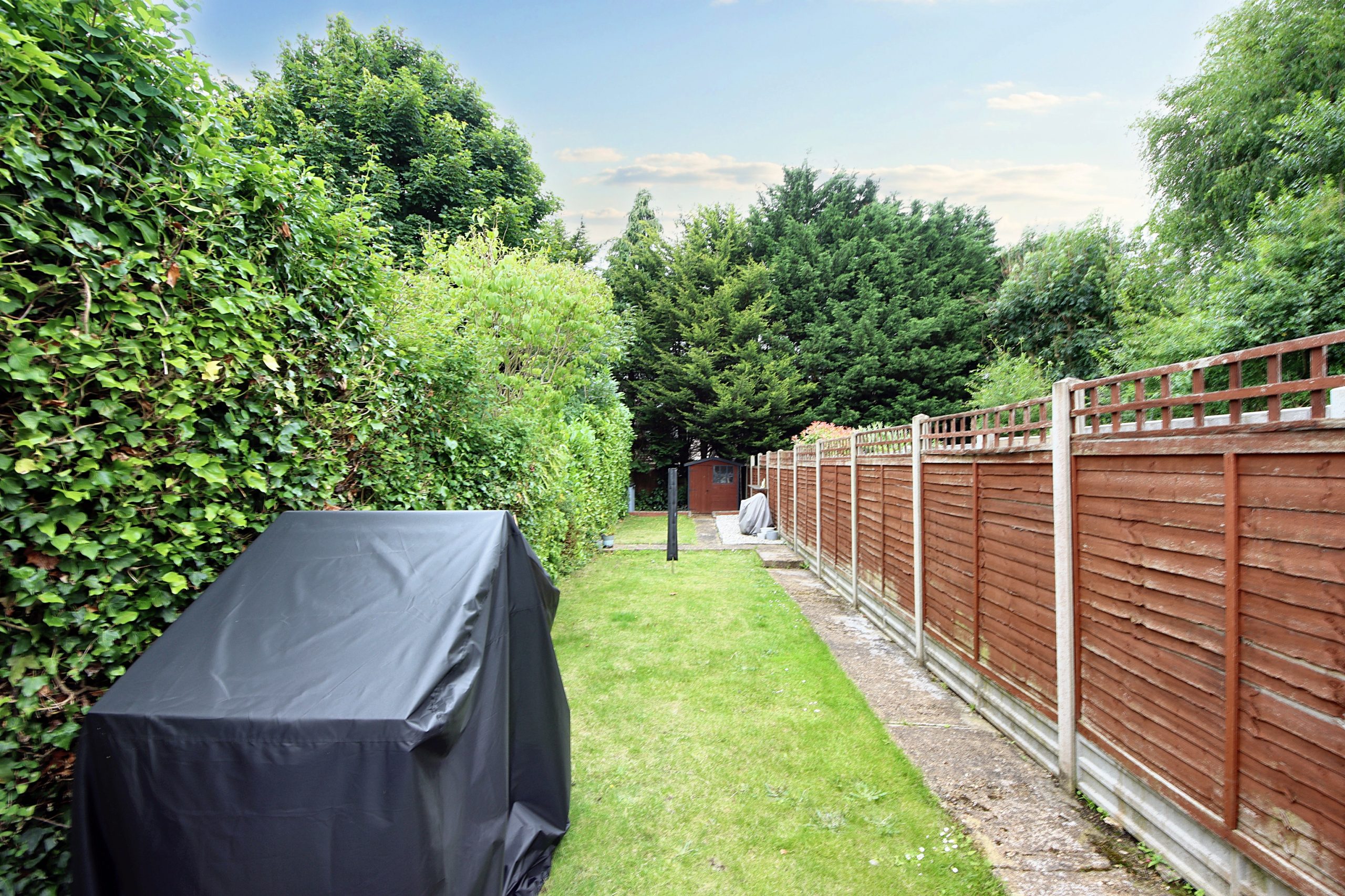 The north-easterly facing garden flows seamlessly from the rear of the house and is centred around a well-maintained lawn. Additional features include a shed and a single gate providing convenient access to the side and front of the property.