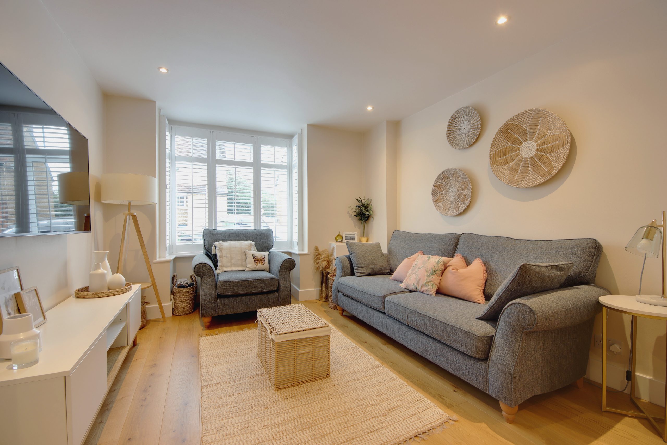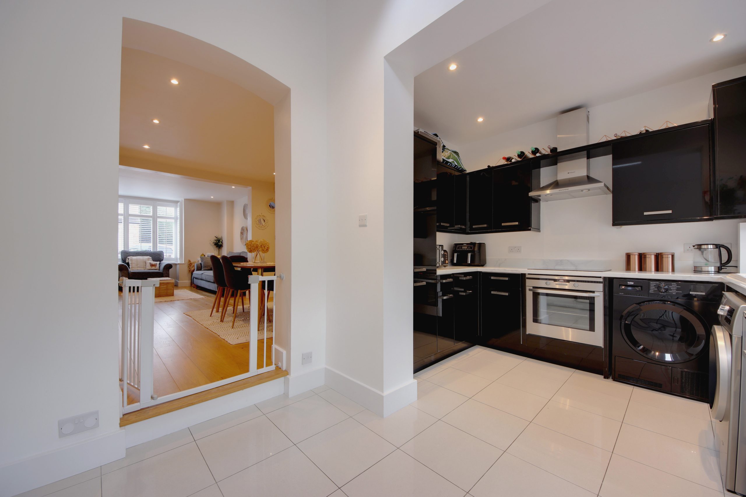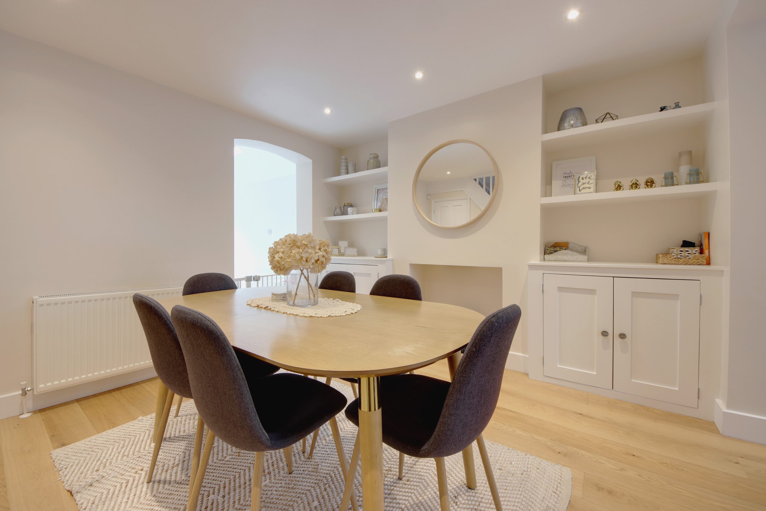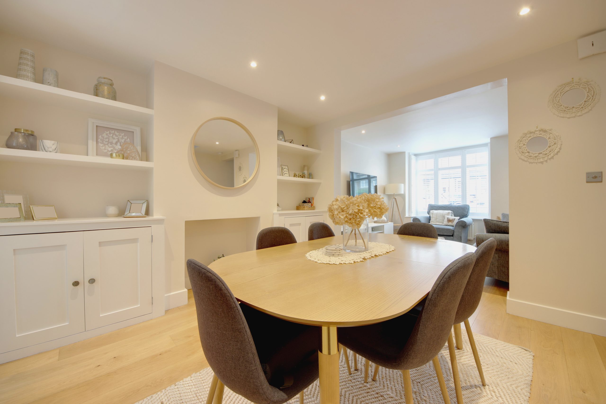 Step inside to a beautifully bright hallway, a perfect space to meet and greet guests, leading to the impressive ground floor living area. Spanning 33’1” x 13’10”, the open-plan kitchen, living, and dining space is designed for modern living. Neutral wooden flooring, overhead spotlights, and a modern fitted kitchen adorned with white marble-effect surfaces create an elegant ambiance. The kitchen features a comprehensive range of cabinetry and appliances, thoughtfully arranged for easy access. Expansive glazing at the rear and a Velux window in the vaulted ceiling above flood the space with natural light. Each area within this open layout is distinct, providing a sense of segmentation while exuding warmth and coziness. Highlights include a striking fireplace with gas supply, alcove storage, and a beautiful box-bay window with bespoke white shutters, serving as a stunning focal point.