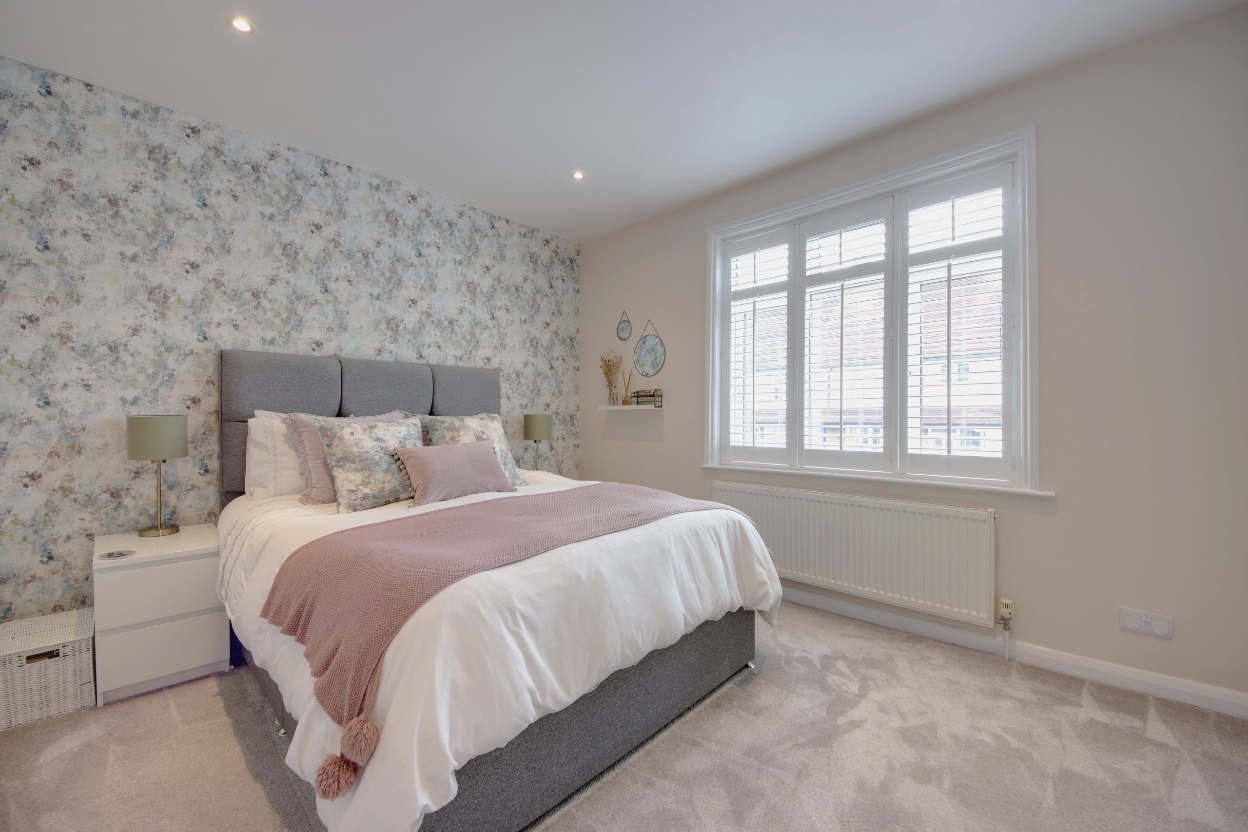 Ascending the staircase to the first floor, you'll discover two generously sized double bedrooms. The main bedroom boasts a large south-westerly facing window that invites ample natural light and features extensive in-built cabinetry. The first floor is completed by a meticulously finished family bathroom, showcasing a combination of white marble-effect tiles, white tile slips, and a feature sage wall. This luxurious bathroom includes a freestanding tub, walk-in shower enclosure and a vessel sink.