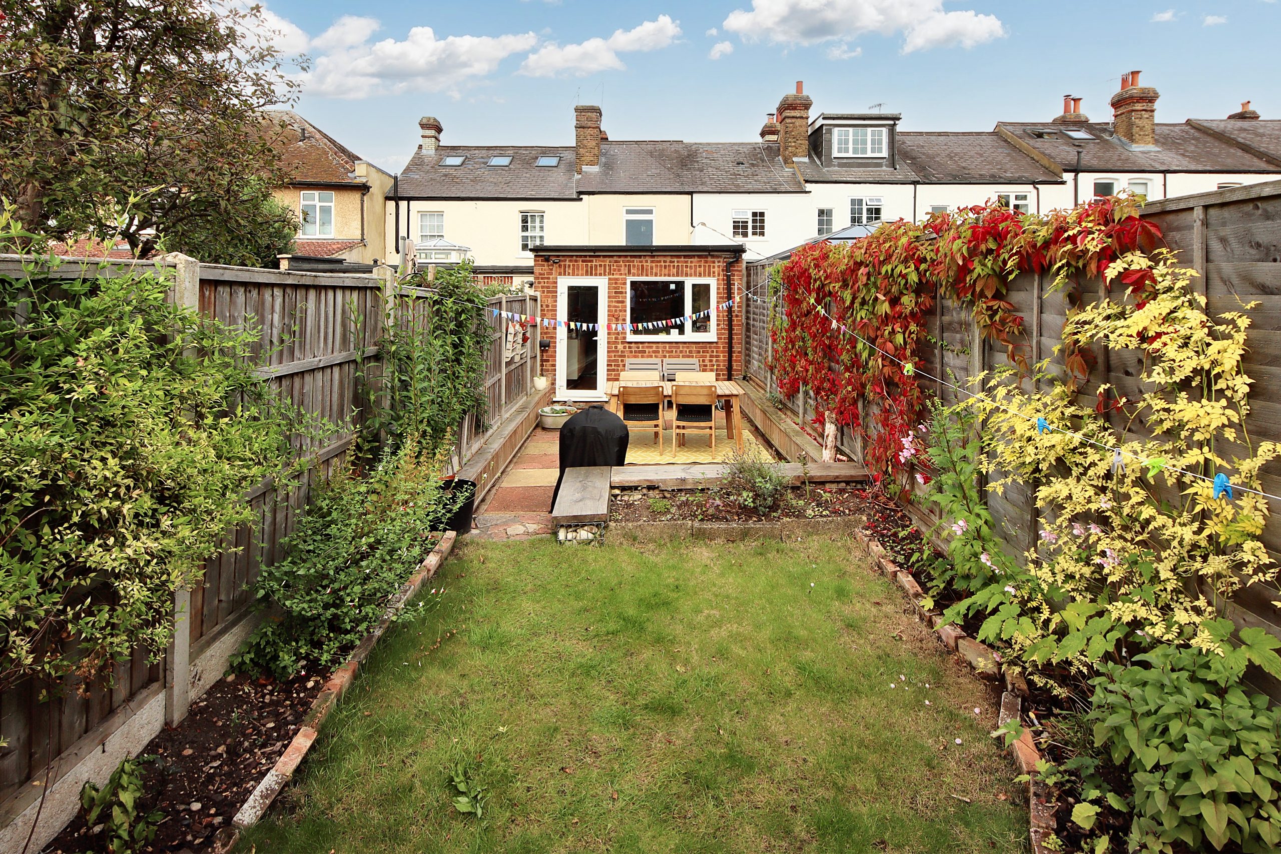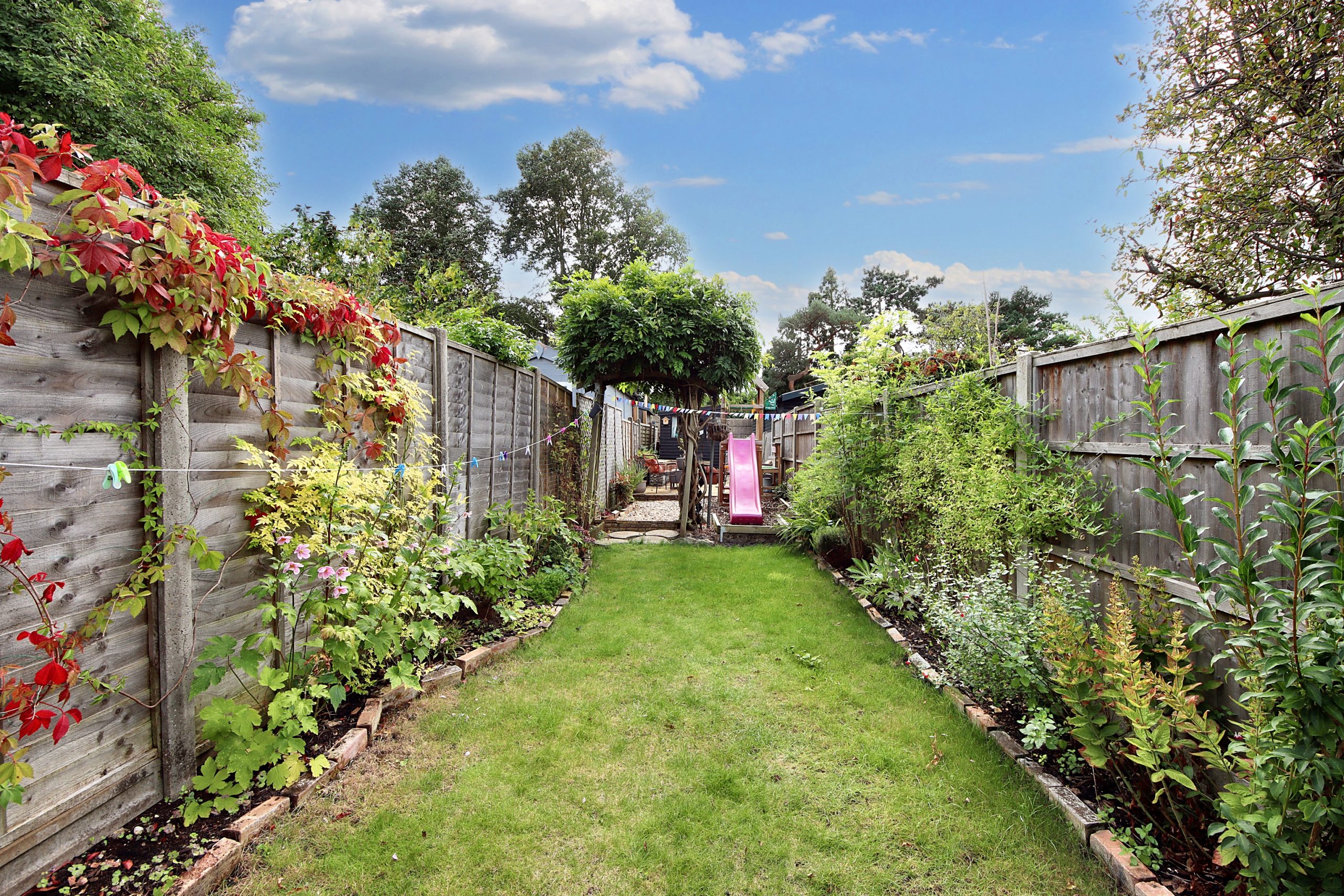 The south-facing garden extends from the rear of the house and is thoughtfully divided into three sections centered around a well-maintained lawn. The front section features a patio, perfect for outdoor dining and entertaining, while the rear of the garden includes a practical garden shed.