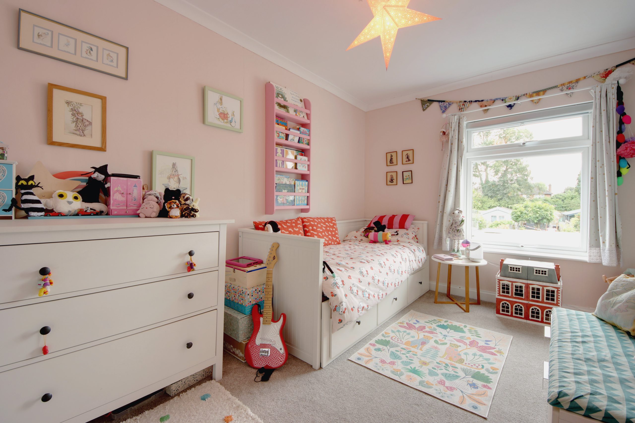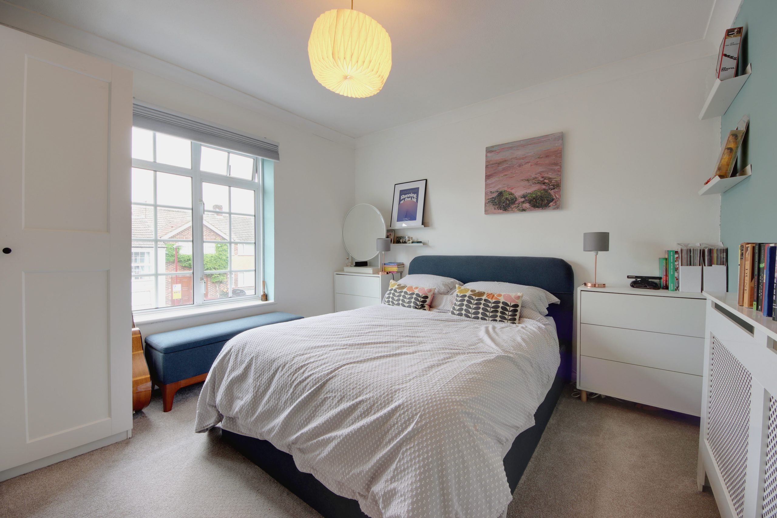 Upstairs, the first floor accommodates two well-sized bedrooms. The main bedroom is filled with natural light from a large north-facing window and offers ample space for freestanding storage.