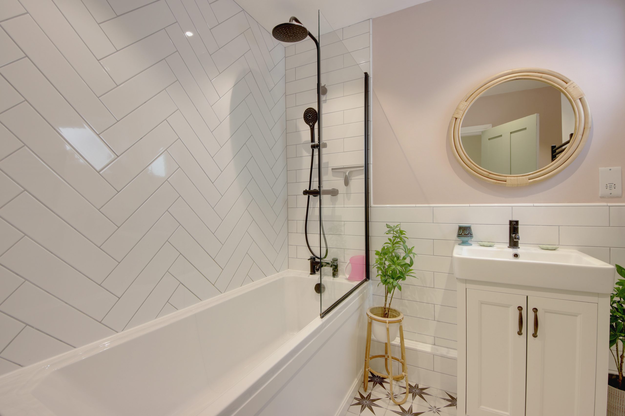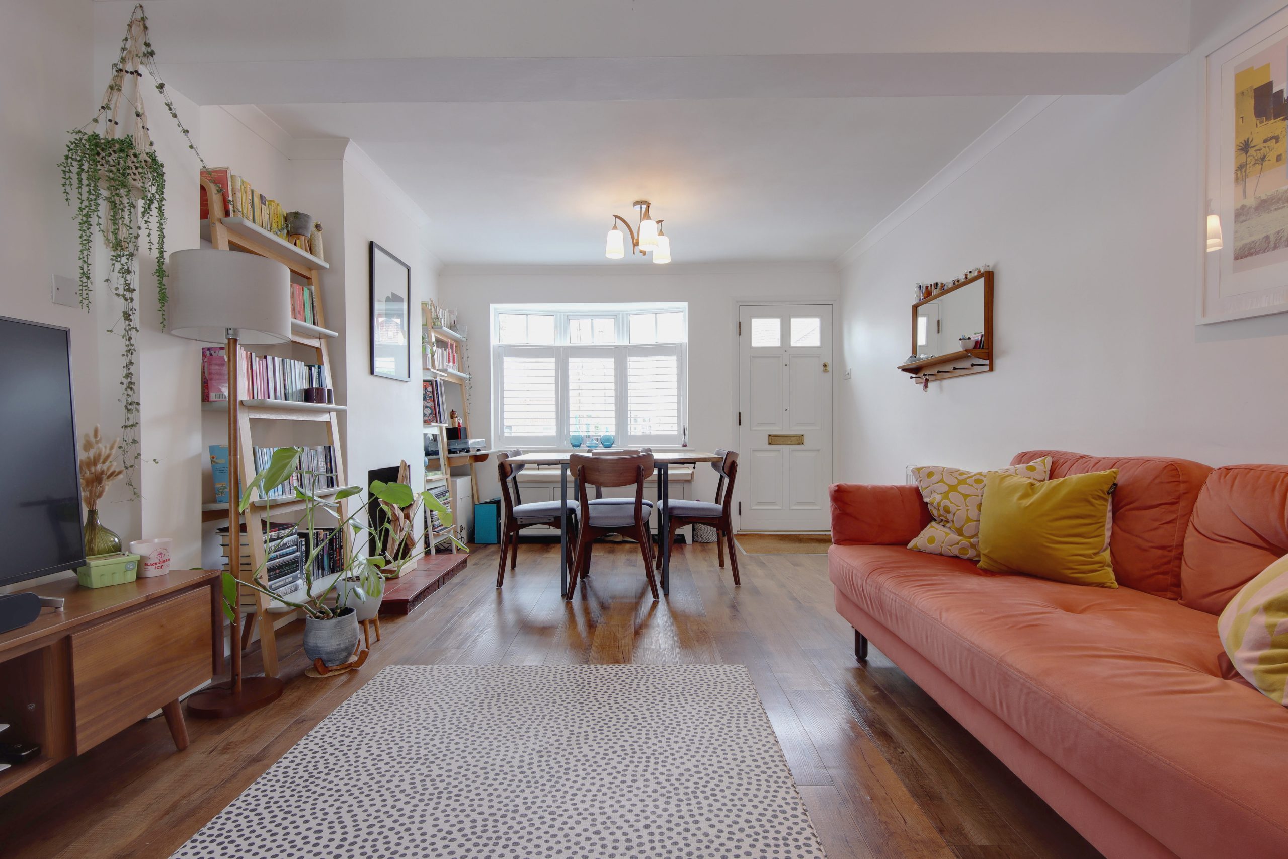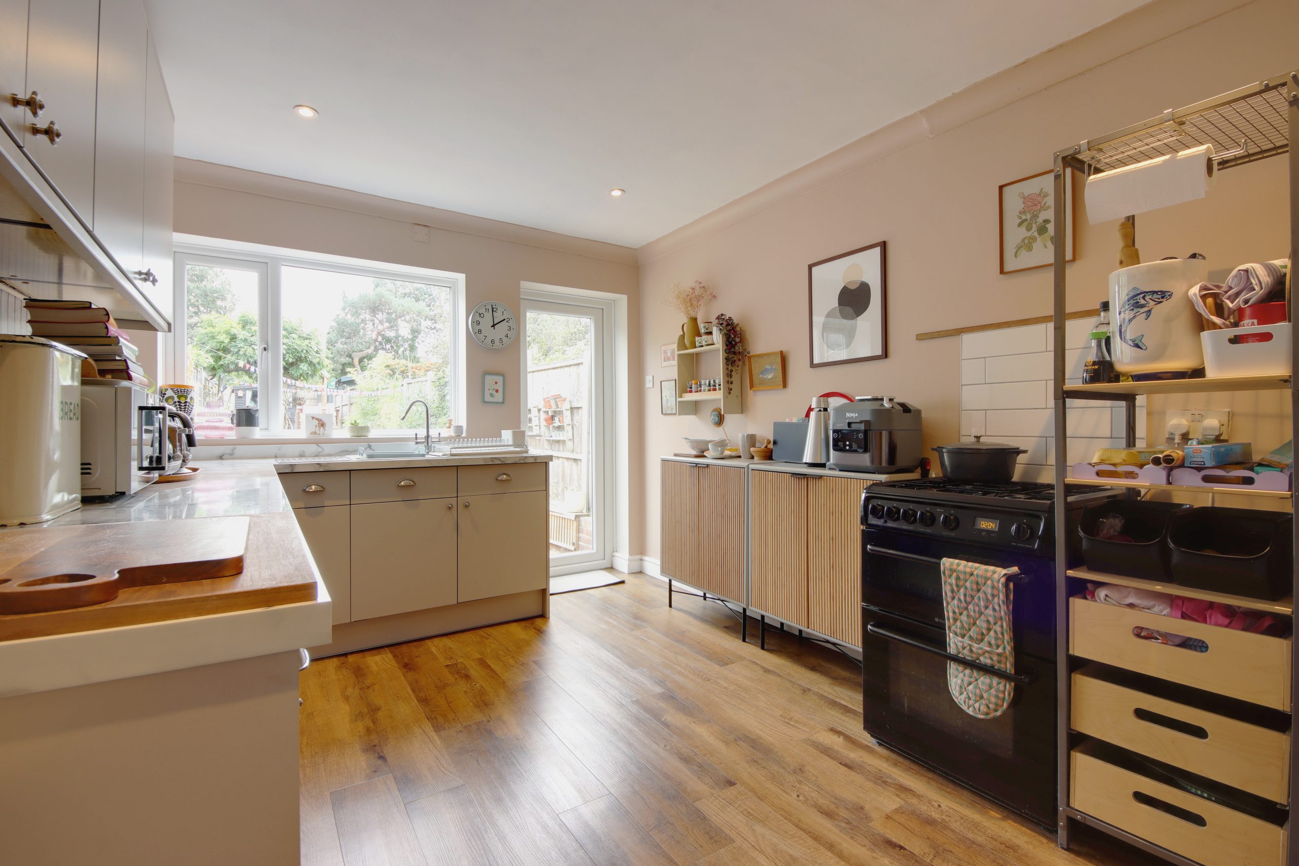 Upon entry, you’ll be greeted by a spacious open-plan living and dining area, measuring an impressive 23'8" x 11'4". This contemporary space showcases elegant engineered wood flooring and modern spotlights. A standout feature is the open staircase, reminiscent of the 1970s, finished in teak oak with gaps between the steps to allow natural light to flood the room through the south-facing window. An open fireplace and newly renewed coving further enhance the charm of this delightful room. Beyond the living room, and immediately to the right, a single door opens to a small courtyard and becomes a designated space for coats, shoes, and other essentials. The kitchen, located at the rear of the house, is accessed through a door and offers a generous 14'6" x 11'4" space - more expansive than many local Victorian terraces. The kitchen features a comprehensive range of cabinetry and appliances, finished in a neutral palette with brushed chrome hardware. A freestanding gas cooker and views of the south-facing garden complete this well-designed space. The ground floor also includes a meticulously crafted family bathroom, featuring white tiles in a stylish combination of herringbone and soldier patterns. The bathroom is equipped with a bathtub, an overhead rainfall shower, and a white porcelain sink.