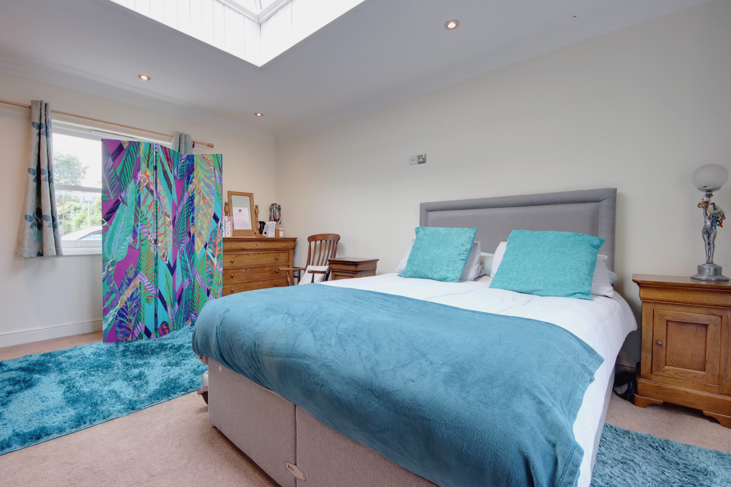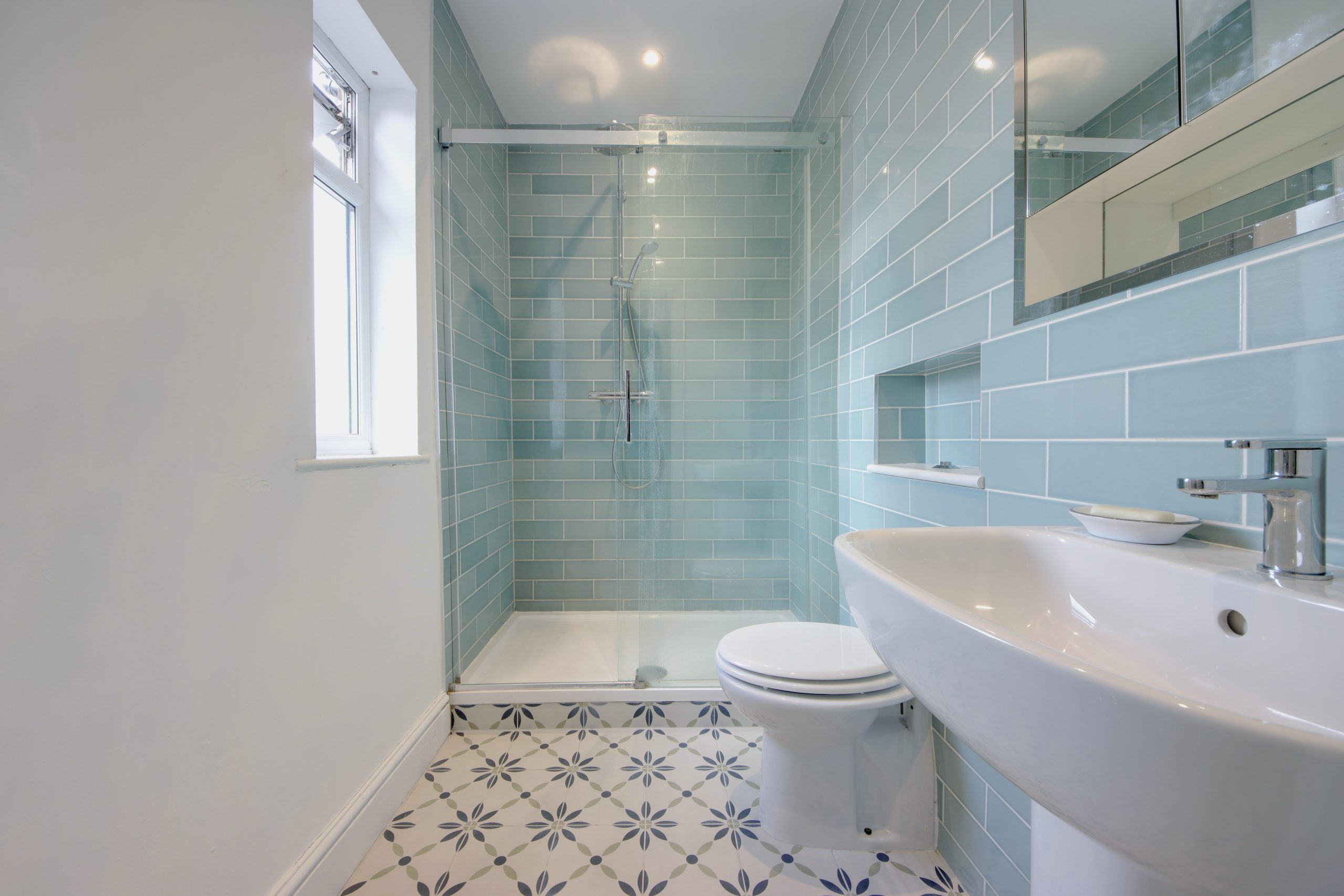 Ascending the beautifully crafted staircase, you’ll find three more spacious bedrooms, each radiating character. The third bedroom enjoys glorious morning light through an east-facing window, offering picturesque views of Oxhey Green Park. The principal bedroom is as stylish as it is functional, with inbuilt cabinetry and a charming feature chimney breast. A sleek, contemporary bathroom completes the first floor, with striking blue tiles from floor to ceiling and a large, modern shower enclosure.
