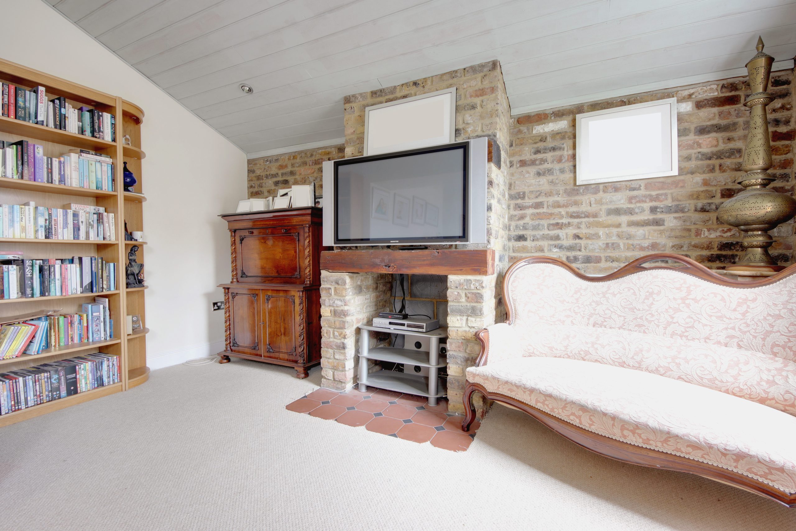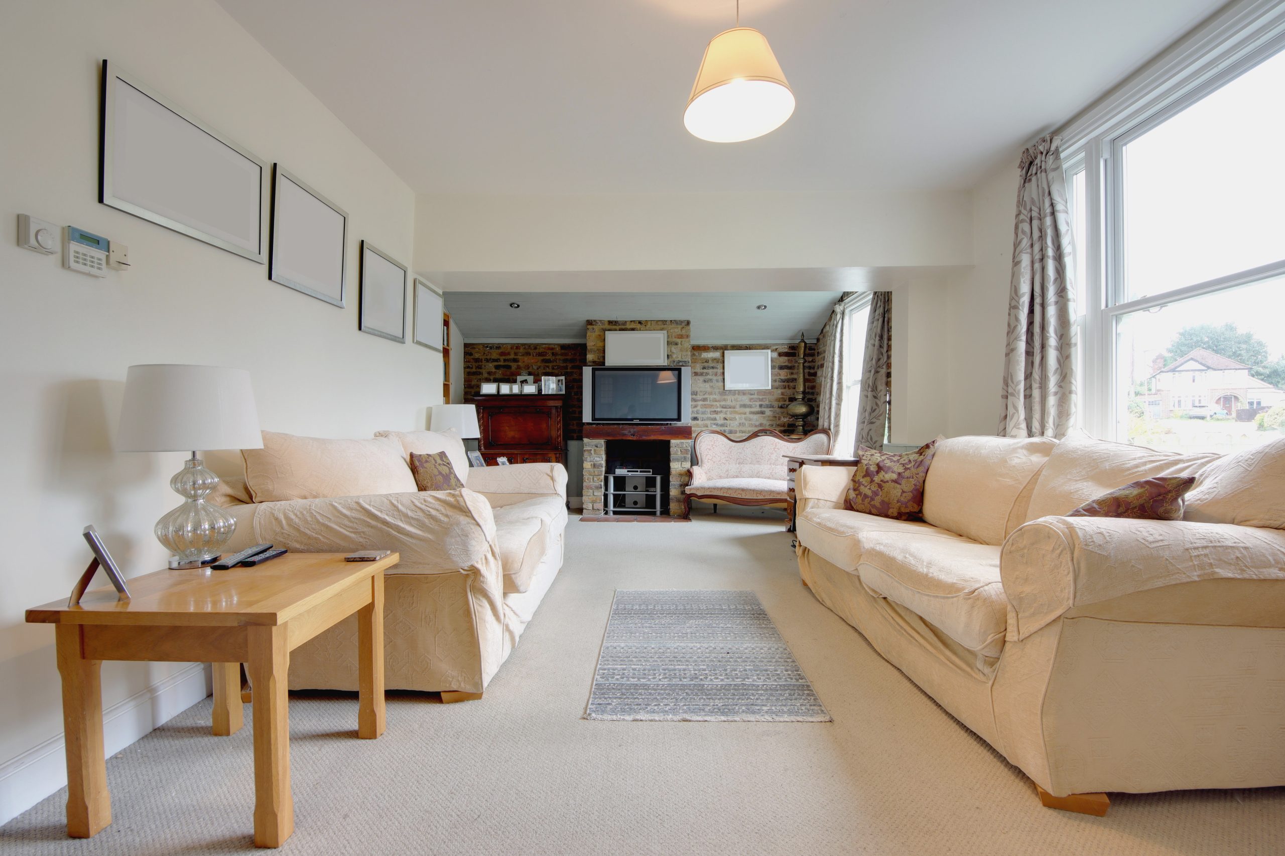 Upon entry, a light and airy porch greets you, offering a practical space for shoes and coats, with stylish feature paneling and windows that flood the interior with light. Step into the expansive 24'10 x 14'5 south-facing living room, where natural light pours in, illuminating the soft neutral tones of the carpet. This room is a masterpiece of contrast, with pastel-hued paneling on one side and an exposed brick wall on the other, complete with a stunning feature fireplace. The room is tastefully lit by a combination of elegant hanging lights and discreet spotlights, creating a warm and inviting ambiance.
