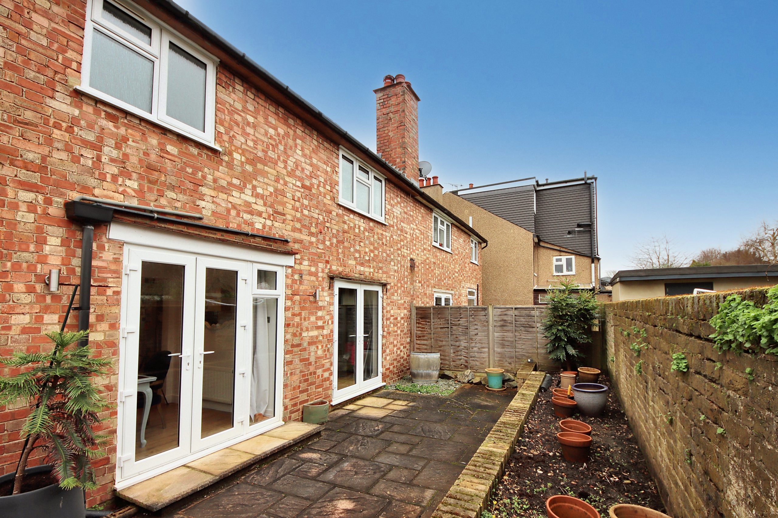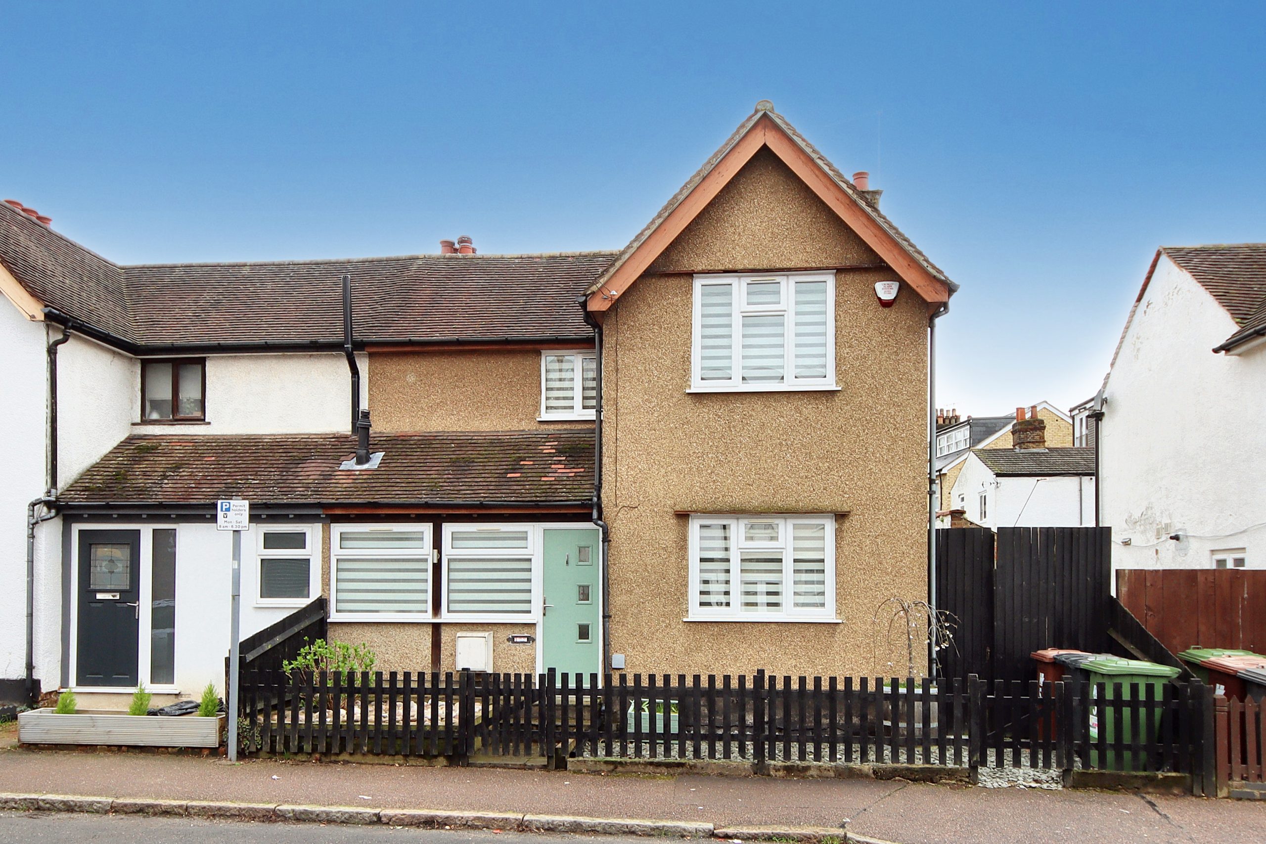 Ideally situated on Vale Road, just a stone's throw away from Bushey Station (a mere 17-minute commute to London Euston), this semi-detached, two-bedroom house has undergone a remarkable renovation in recent years. Upon entering, you’re greeted by a symphony of neutral tones intertwined with bursts of vibrant colour and captivating monochrome striped accent walls, creating an ambiance of sophistication and warmth. Adorned with pebbledash, the façade is highlighted by a striking pistachio-green front door, all surrounded by a meticulously maintained front garden designed for easy upkeep.