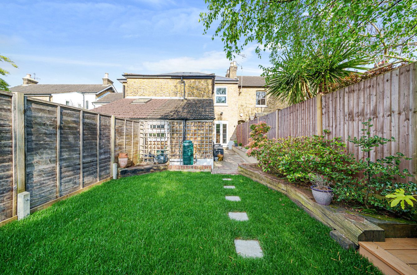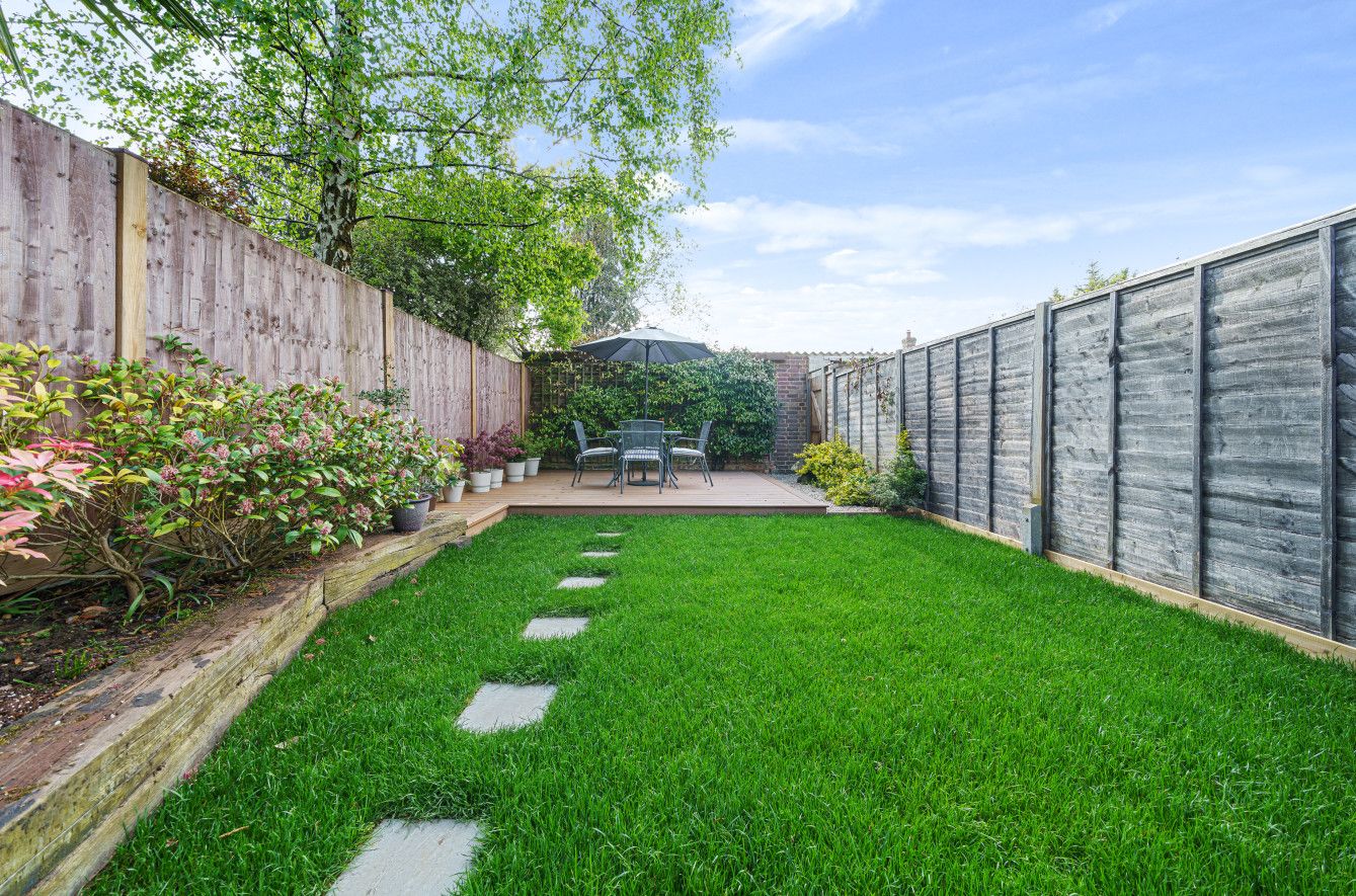 Flowing from the rear of the house lies a thriving garden, where sleeper-edged borders filled with perennials lead to a spacious decking, ideal for outdoor dining and barbeques. A large lawned area sits in the centre, with a patio at the front, large enough to include a second seating area. Convenient access to the street is offered via a single gate located at the rear of the garden.