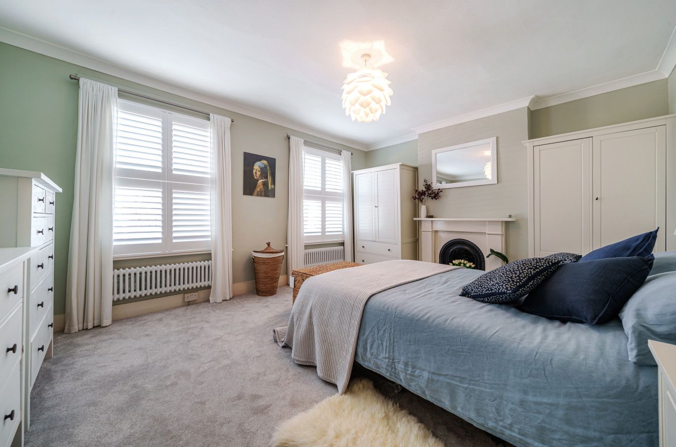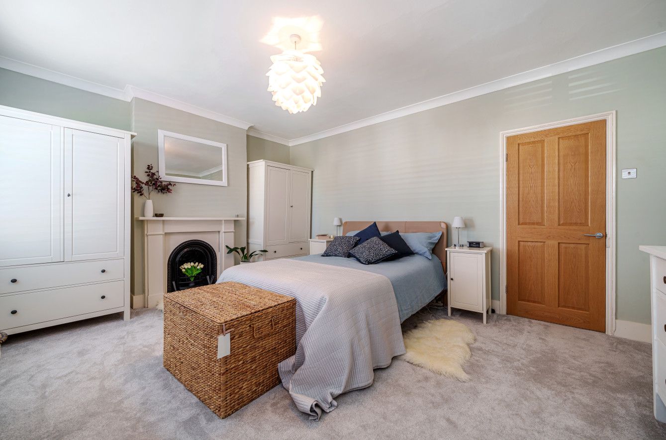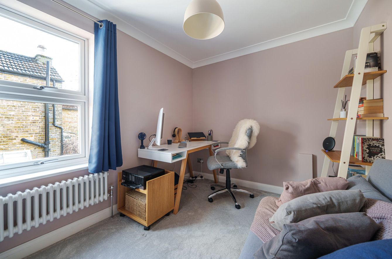 A staircase ascends to the first floor, with two generous double bedrooms and a 10ft third bedroom, currently being utilised as a home office. The main bedroom is home to two large sash windows which invite an excellent quality of natural light into the space. Free-standing cabinetry adds extra storage, ideally placed in the alcoves either side of a feature chimney breast. The main bedroom is completed by a beautiful fireplace and two traditional horizontal double column radiators, only adding to the character.