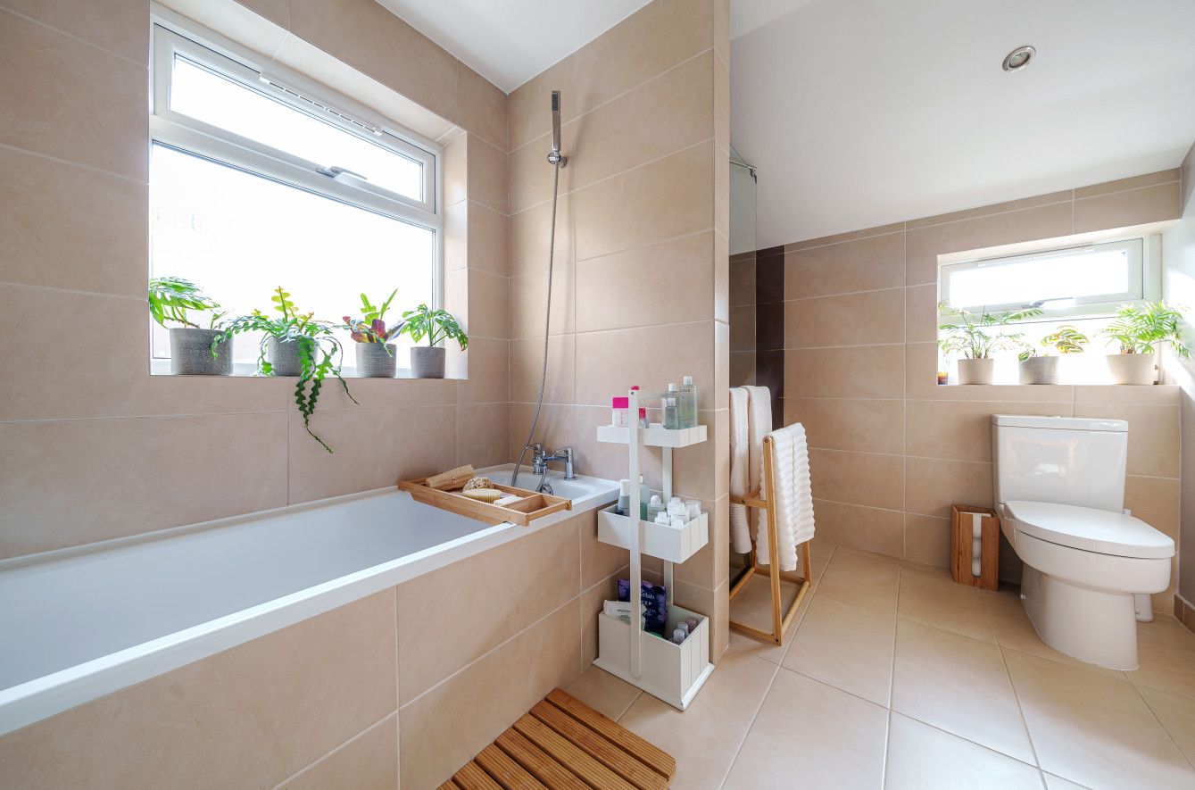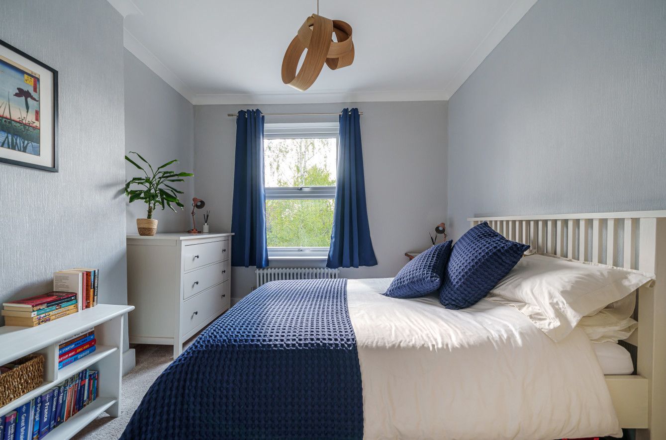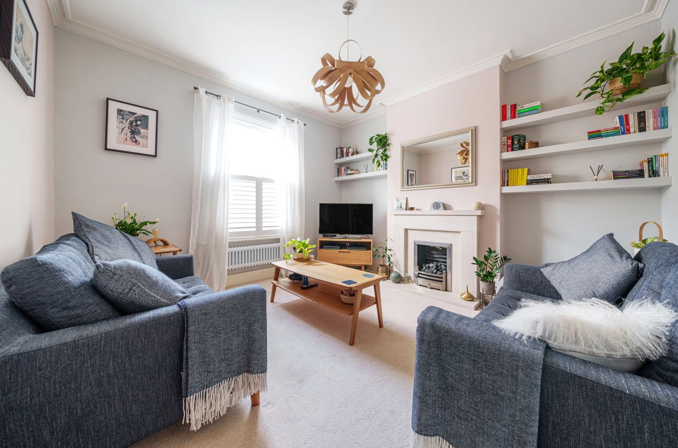 A staircase ascends to the first floor, with two generous double bedrooms and a 10ft third bedroom, currently being utilised as a home office. The main bedroom is home to two large sash windows which invite an excellent quality of natural light into the space. Free-standing cabinetry adds extra storage, ideally placed in the alcoves either side of a feature chimney breast. The main bedroom is completed by a beautiful fireplace and two traditional horizontal double column radiators, only adding to the character.