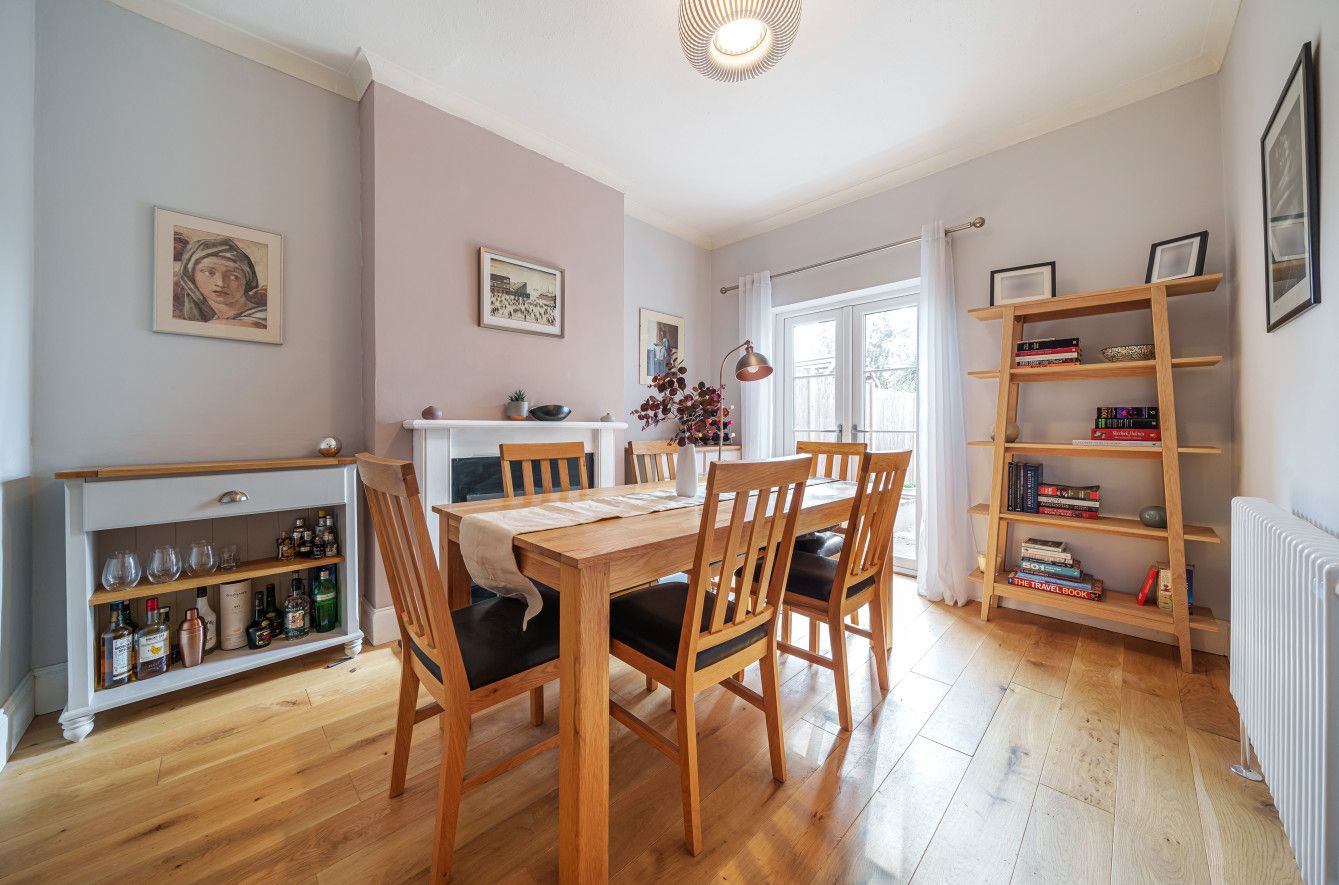 The front door opens onto a central hallway which leads into a 13ft, tranquil living room situated at the front of the plan. A generous sash window with bright-white wooden shutters serves as the focal point, while reinstated cornicing runs around the walls. The kitchen and dining room unfold towards the rear of the plan. Topped with wooden surfaces, the kitchen's comprehensive range of neutral cabinetry is laid out in a wide galley, so everything is within easy reach. The dining room is home to a large table which sits amidst an array of quality free-standing furniture exposed to immense natural light through French doors which open into the garden. Completing the ground floor is the family bathroom, where a partition separates the shower from the bathtub, finished beautifully in a neutral tile, floor-to-ceiling.