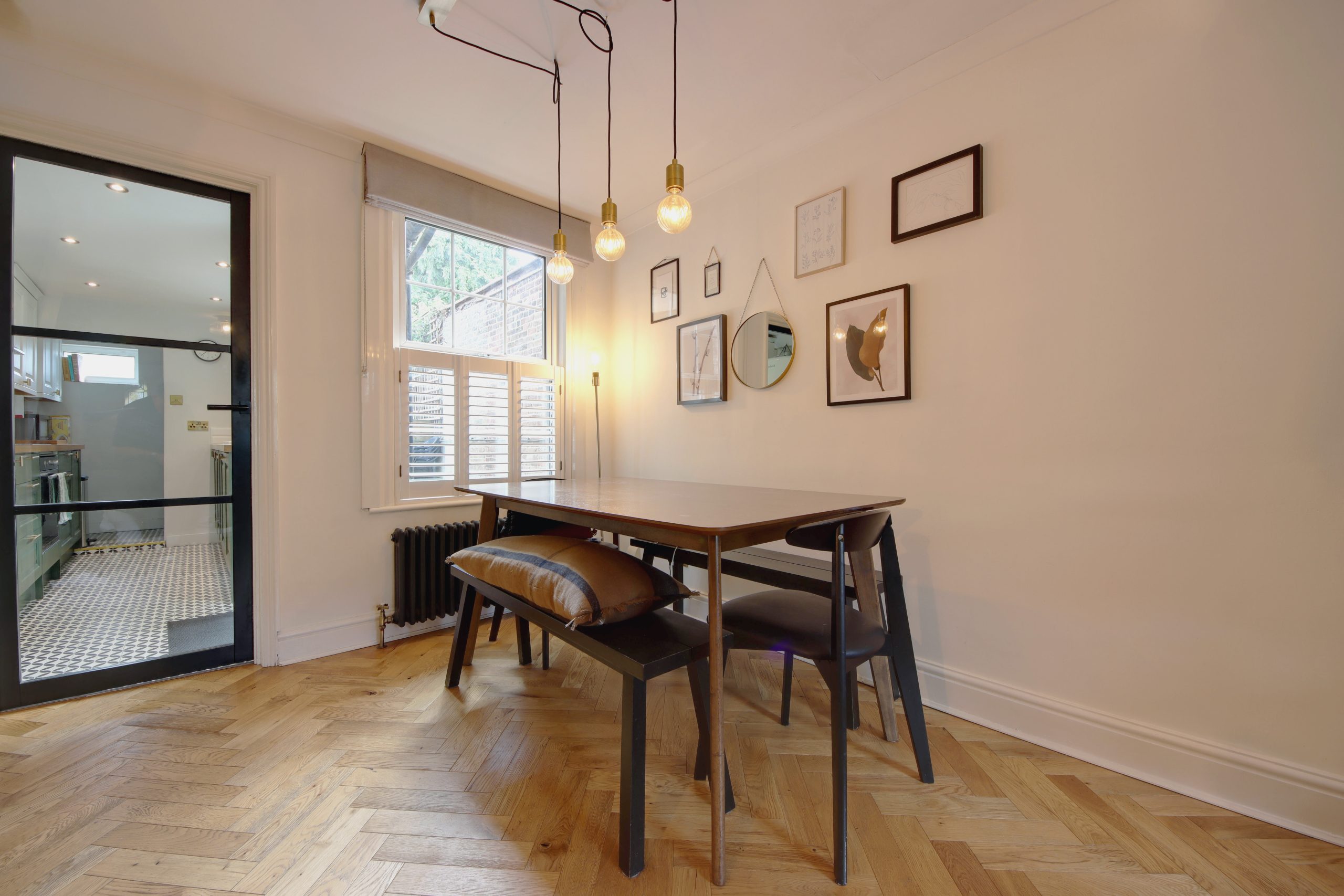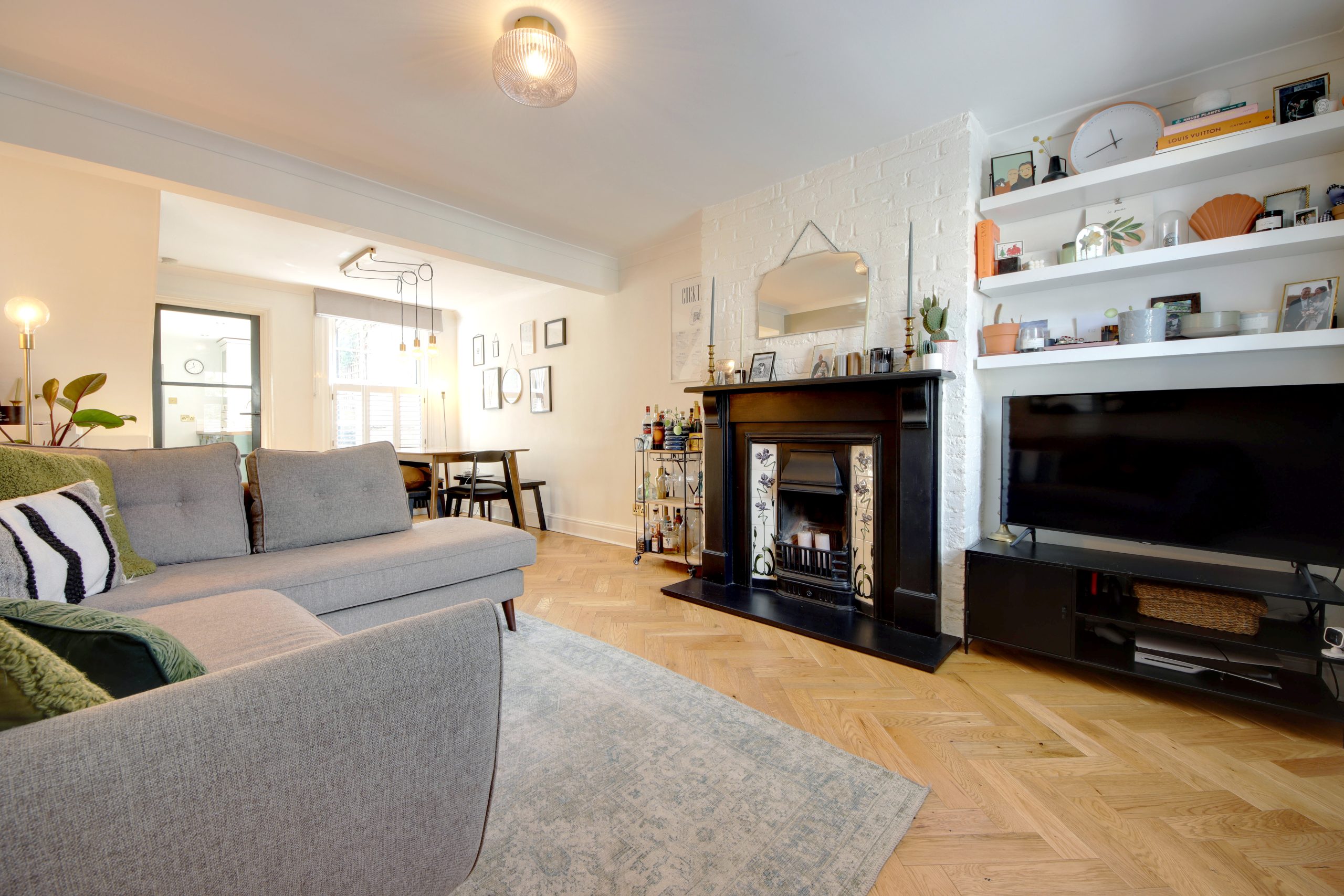 As you enter, a welcoming porch offers an ideal space to greet guests before stepping into the impressive ground floor living area. The spacious open-plan living and dining room, measuring 20’9” x 11’1”, is designed for contemporary living, featuring elegant parquet-patterned engineered wood flooring and stylish light fixtures. A standout feature of this space is the charming fireplace with bright white exposed brickwork and decorative tiled inserts. The kitchen, located at the rear, is accessed through a crittal door and follows a galley layout. It is equipped with a full range of cabinetry and appliances, all thoughtfully arranged for convenience and finished in a chic sage green with brushed gold hardware and an arched tap. Adjacent to the kitchen is a practical area that functions almost like an integrated utility space, accommodating a washing machine and the combination boiler.