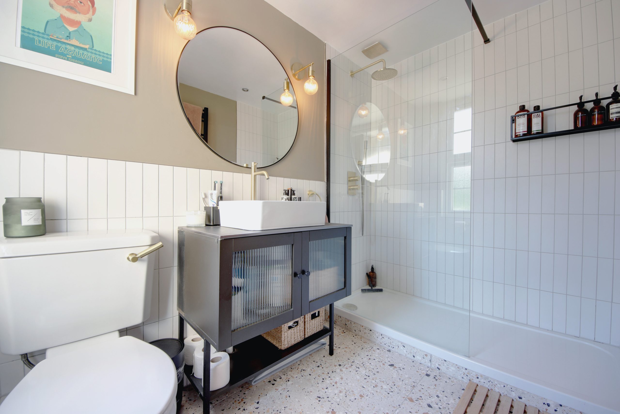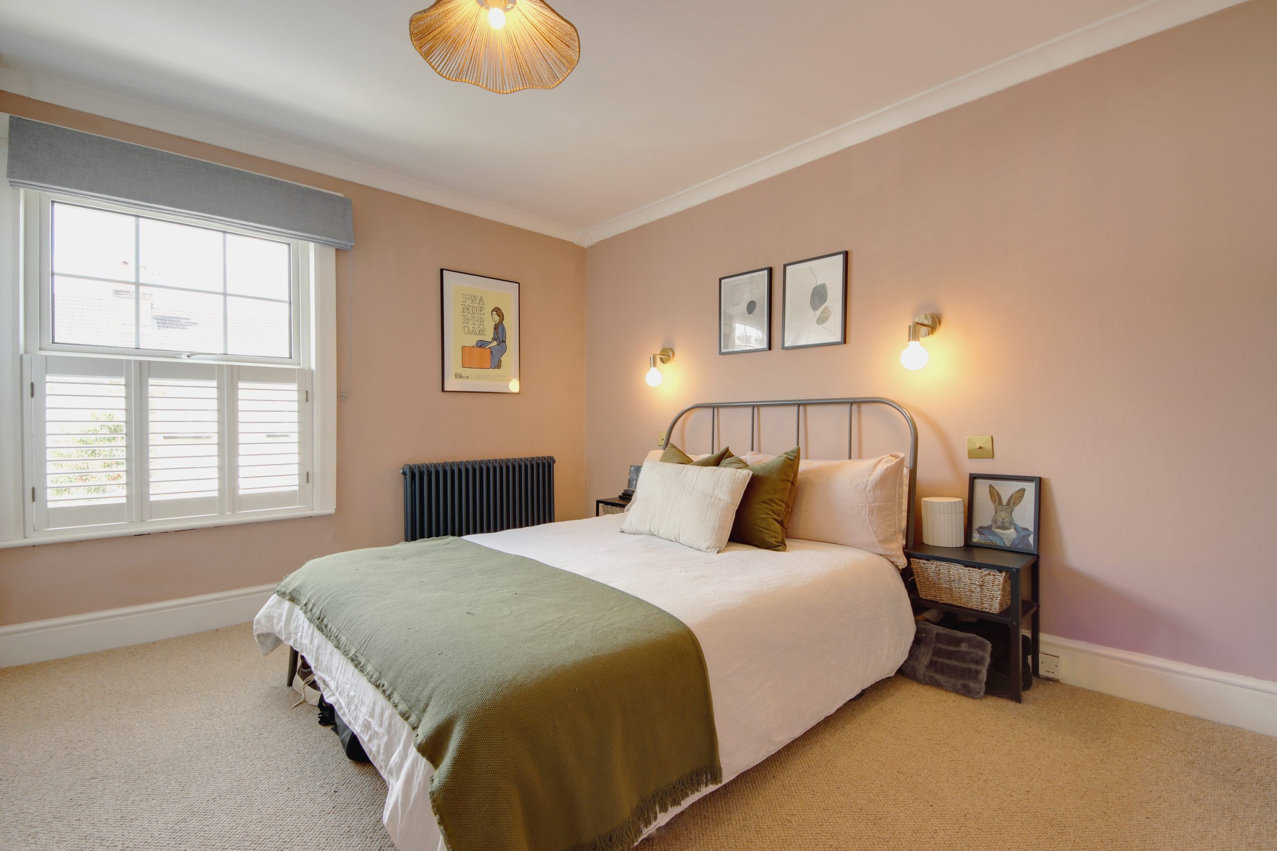 Upstairs, the first floor houses two well-appointed bedrooms. The main bedroom features a large, west-facing sash window that floods the room with natural light, along with extensive built-in cabinetry for ample storage. The first floor is completed by a meticulously designed family bathroom, boasting a luxurious walk-in shower enclosure and a vessel sink. The bathroom’s décor echoes the kitchen’s style with white tile slips and a feature sage wall complemented by brushed gold fittings.